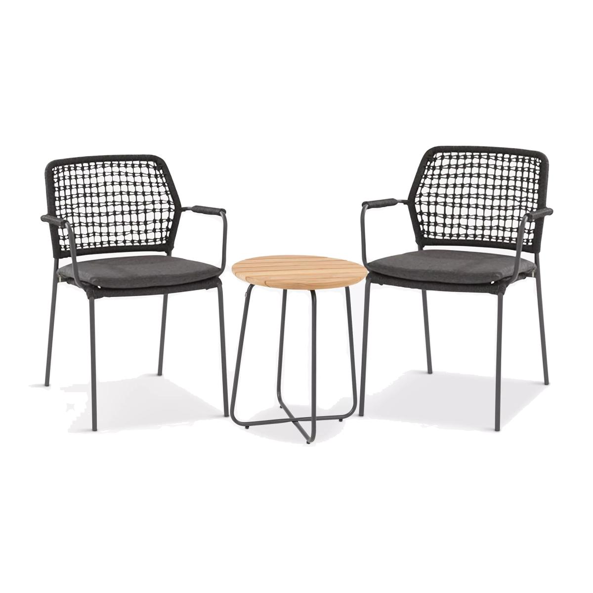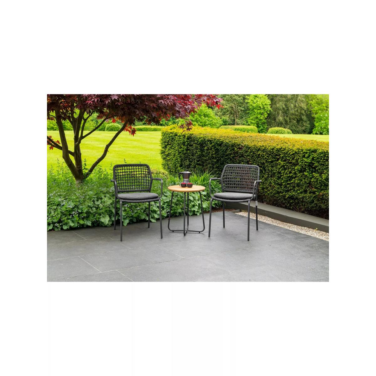 Contemporary and weather-resistant two-seater garden bistro set from 4 Seasons Outdoor. The set includes two Barista garden dining armchairs and a round Verdi bistro table. The table has a slatted top made of naturally weather-resistant solid teak wood and a sturdy powder-coated stainless steel frame and legs with protective feet. The rope-like design on the armchairs is handwoven with a high-quality, durable weave. All the rope materials have a polypropylene base or weave, ensuring the rope remains taut. The rope contains no hazardous materials and can be fully recycled at the end of its lifetime. The foam-filled seat cushions give you comfortable support and the covers are removable and machine-washable for easy cleaning. The sturdy chair legs are made of powder-coated stainless steel. Key features: Two Barista garden dining chairs Round 45cm Verdi bistro table with an FSC-certified teak wood top Stainless steel table legs in a powder-coated anthracite finish Sturdy powder-coated stainless steel chair frames with rope-like durable weaves Seat cushions with machine washable covers Weather-resistant for outdoor use Garden furniture care: To keep your outdoor furniture in the best condition, store it in a cool, dry, well-ventilated spot indoors over the winter. If it’s staying outside, use an outdoor furniture cover whenever the weather is wet or unseasonal. Make sure furniture is clean and dry before storing it away, and keep cushions in a clean and dry place when not in use. By choosing this product you are supporting responsible management of the world's forests. The Forest Stewardship Council® (FSC®) is a global, not-for-profit organisation that helps take care of forests and the people and wildlife that call them home. To learn more, visit fsc.org.
