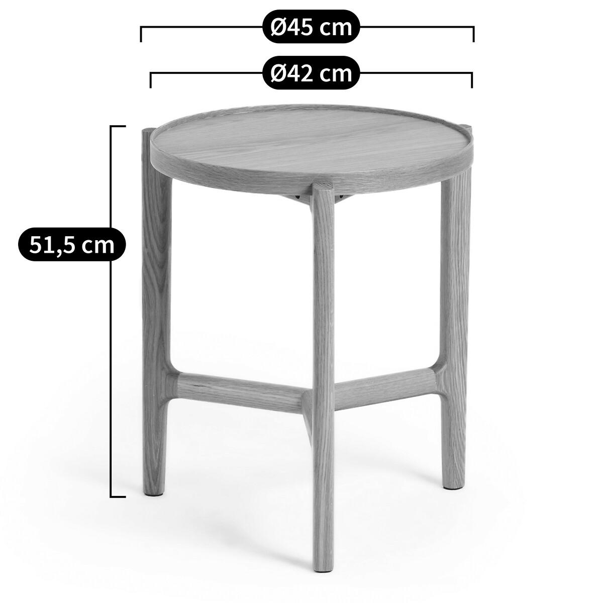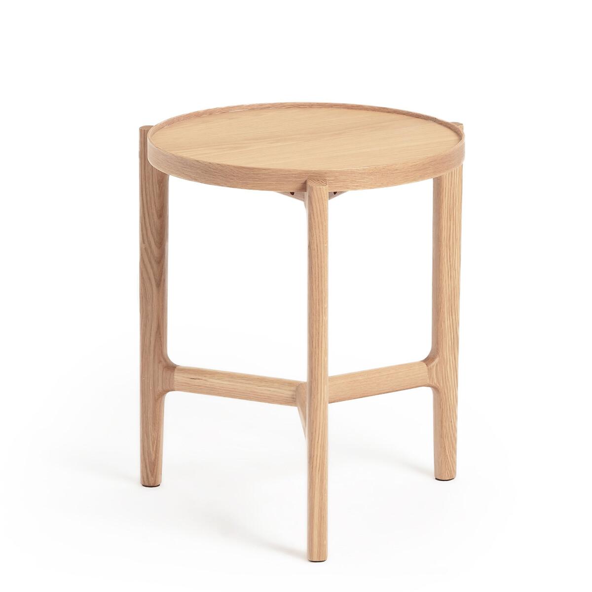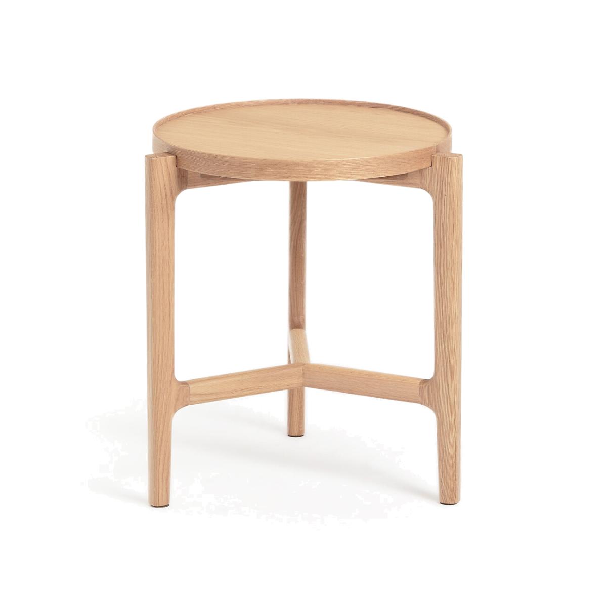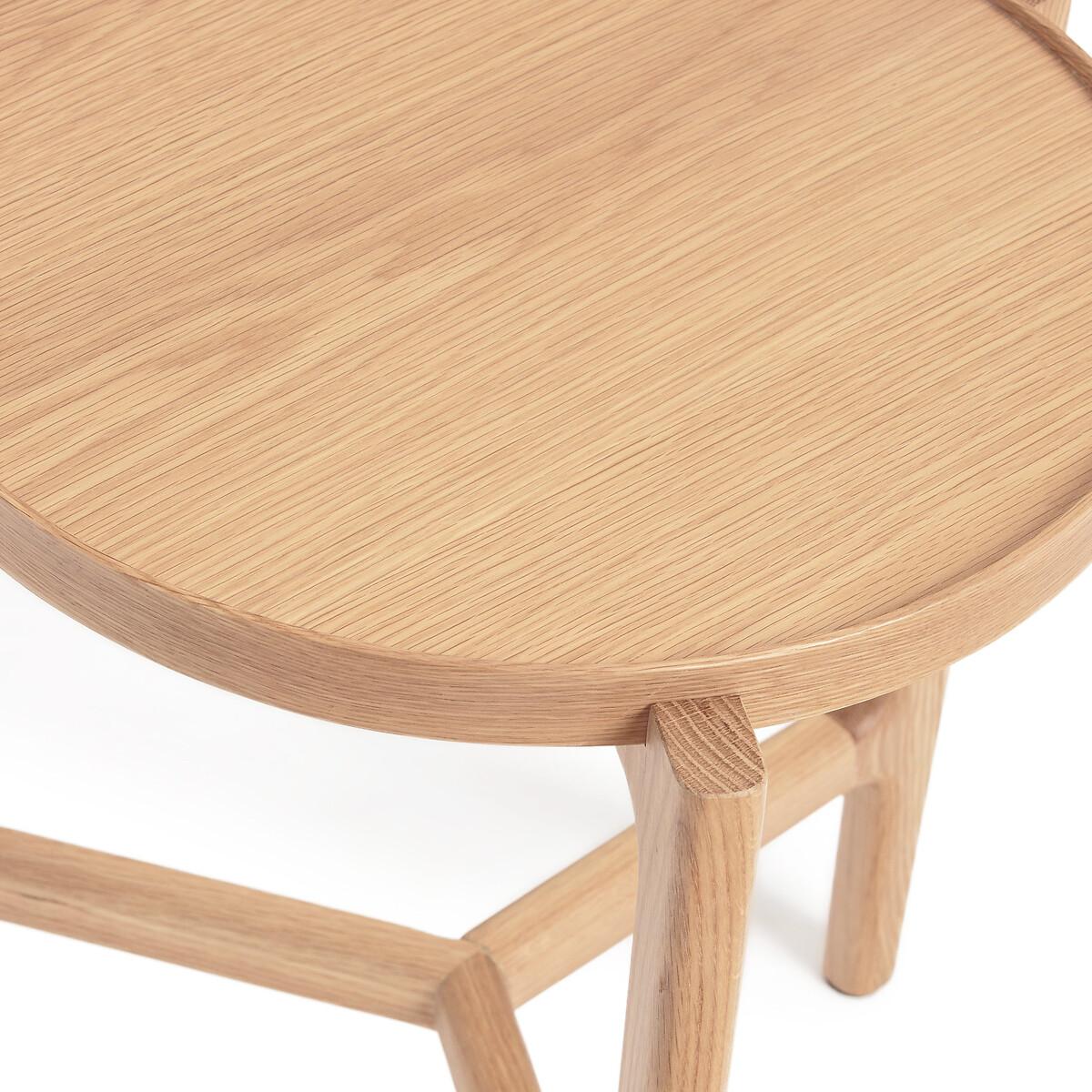 Welcome the Alyasa side table into your home for a touch of Scandi chic and maximum practicality. We love its gently rounded shape and soft lines, finished with a circular tray delicately balanced on top of a solid oak cross-shaped frame. Ideal for use as a standalone item, or paired with other items from the Alyssa collection, available online. Product Details • Top diameter 42cm in MDF oak veneer certified FSC® Mixed, thickness 3cm • Legs in solid oak certified FSC® Mixed • Nitrocellulose varnish finish. Dimensions • Diameter 45 x H51.5cmDelivery:. Your Alyasa side table is sold pre-assembled. • WOOD FROM MORE SUSTAINABLY MANAGED FORESTS AND CONTROLLED SOURCES. FSC® Mix wood contains at least 70% FSC® certified and/or recycled wood, the remainder being FSC® controlled wood. Dimensions and weight of parcel • L53 x H58 x D50cm • 8kg