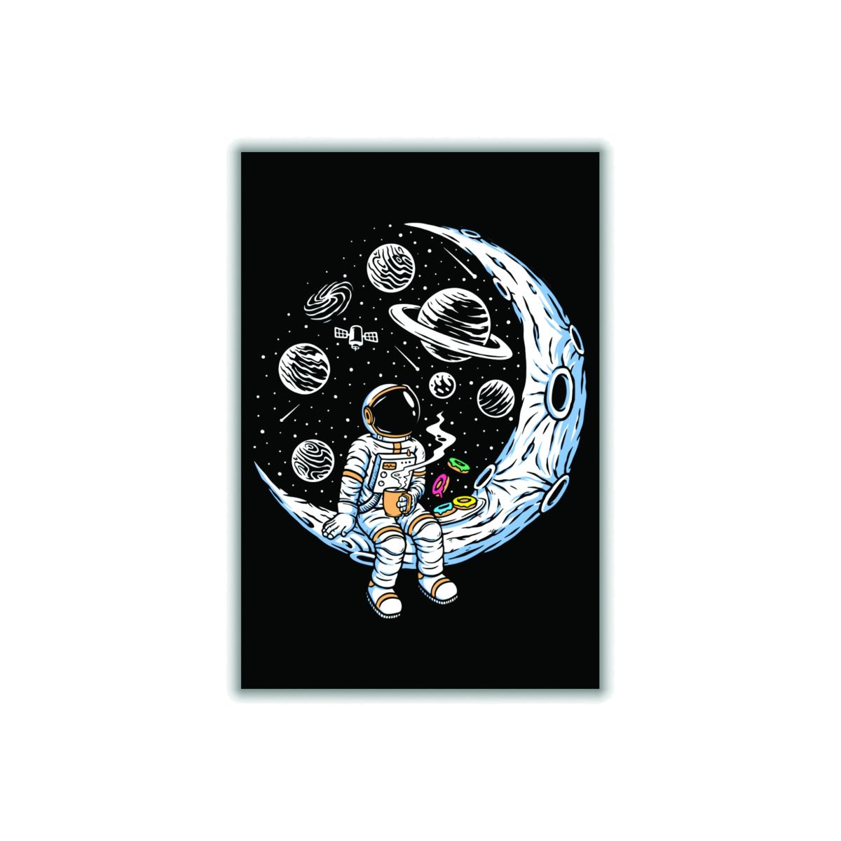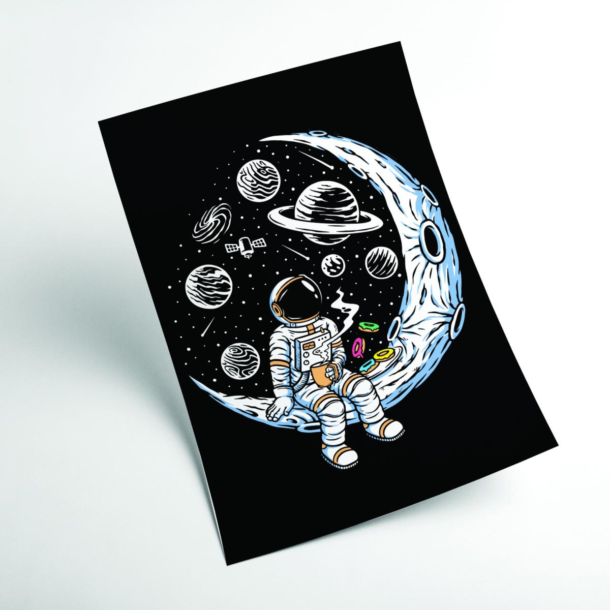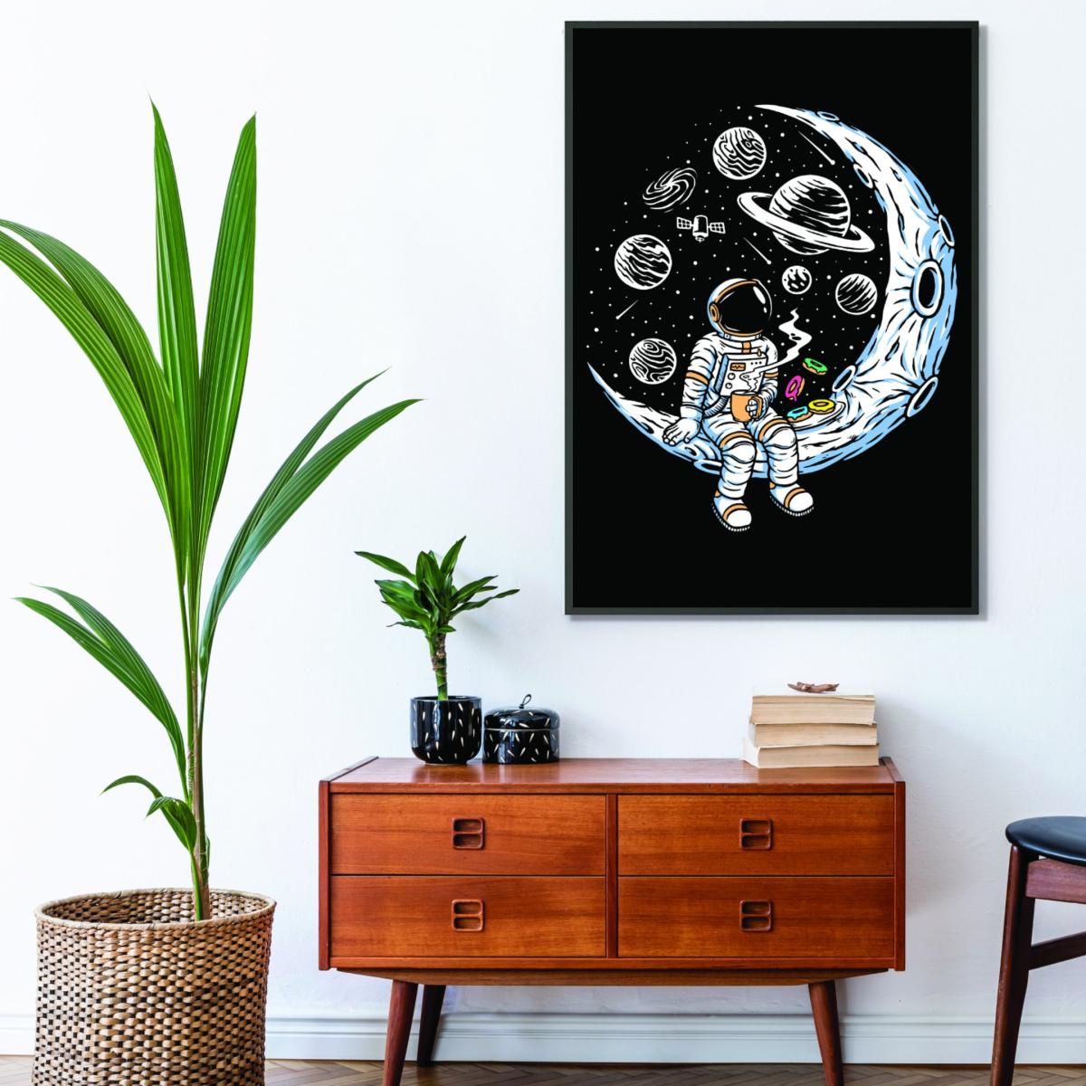 This piece is a playful, eye-catching print that works well in modern, eclectic, or even children's spaces. Its whimsical subject matter adds a sense of fun and imagination, making it ideal for casual living rooms, playrooms, or creative workspaces. When styling with this print, consider pairing it with minimalist furnishings to let the artwork stand out, or complement with celestial or space-themed accessories for a cohesive theme. Practical tips include framing it in a simple border to enhance its visual appeal and hang at eye level to draw immediate attention. Overall, it’s a great way to add personality and a touch of humour to the decor.