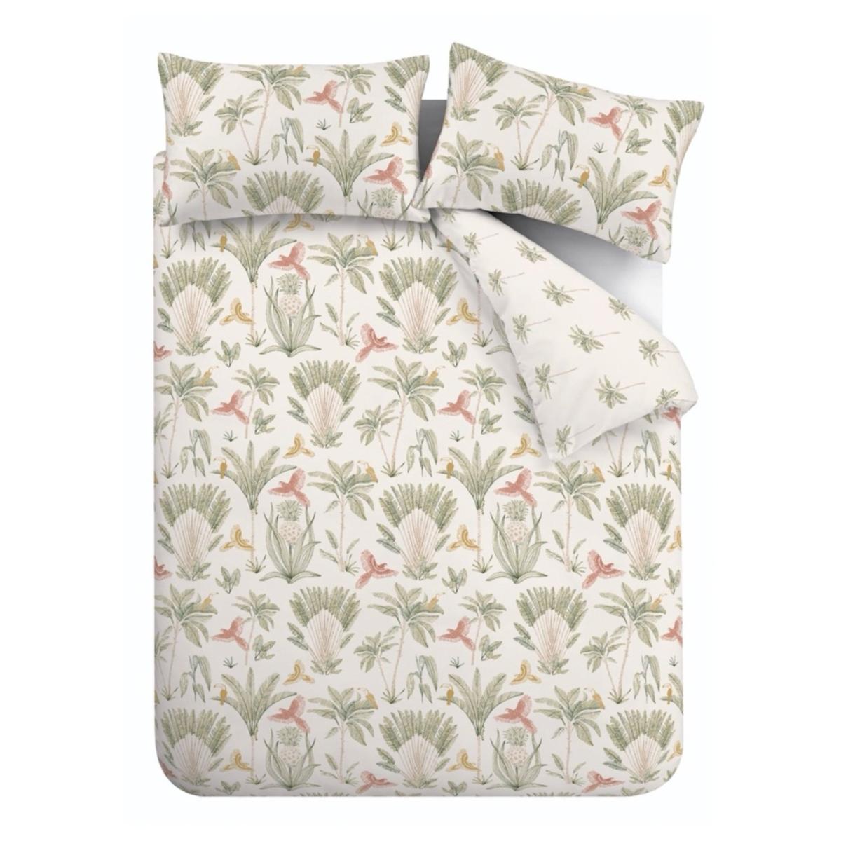 The Catherine Lansfield Paradiso Palm Duvet Set in Natural brings the beauty of the tropics into your bedroom with its bold palm print design. The lush palm leaves are beautifully depicted in earthy tones, adding a touch of nature and serenity to your space. Fully reversible, this set offers two looks in one with a complementary palm design on the reverse. Crafted from a blend of easy-care recycled polyester and soft cotton, it's designed for everyday use, offering both comfort and style with minimal maintenance. Perfect for creating a calm, tropical oasis in your bedroom. Fully Reversible: For two stylish looks in one. Button Duvet Fastening: To keep your duvet securely in place. Envelope Pillowcase Closure: Providing a secure and snug fit for your pillow. 52% Polyester 48% Cotton 132 Thread Count Includes Single Duvet Includes Single Pillowcase Double, King and Superking Size Duvet Includes Pair of Pillowcases Care Instructions Wash Before Use. Machine Wash at 40 Degrees. Tumble Dry Safe. Please note All screens vary in colour reproduction and whilst every effort has been made to display the colour as accurately as possible it is for guidance only.