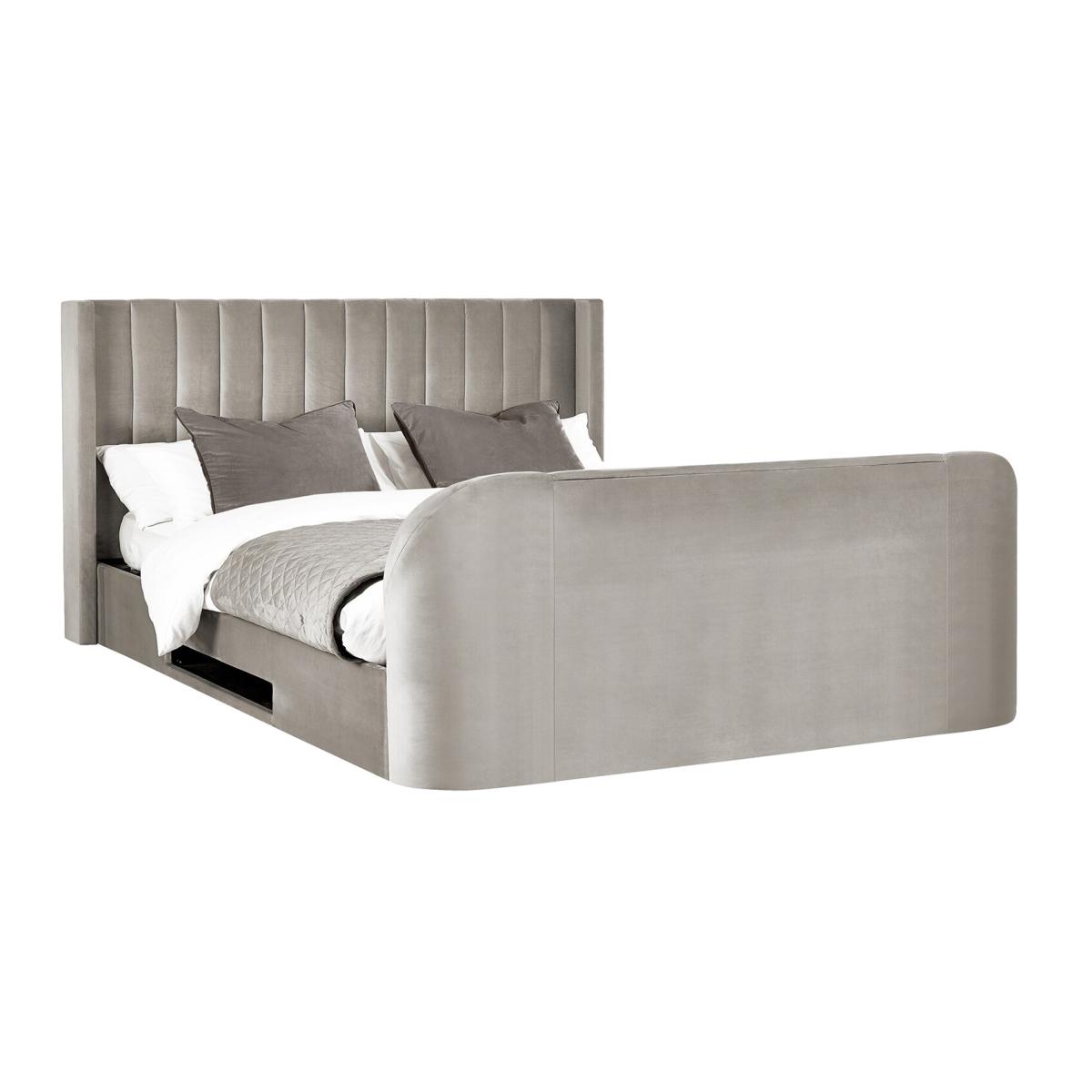Elevate your bedroom with the Clara Ottoman TV Bed in Light Grey, designed to blend luxury and practicality. The modern upholstered frame with a sophisticated paneled design brings both style and practicality. The side-lift ottoman features ample storage space, along with a convenient drawer for added storage. The remote control allows you to easily raise and lower the bed to fit up to a 43-inch TV. With simple assembly, you can quickly enjoy the perfect combination of comfort, organisation, and entertainment in your home.