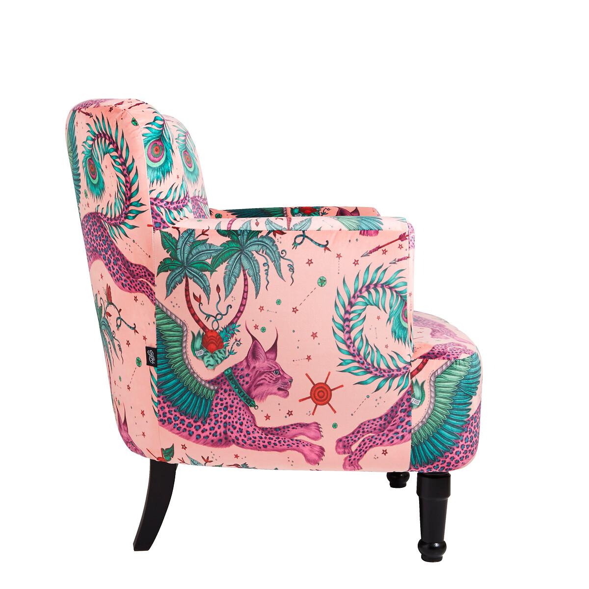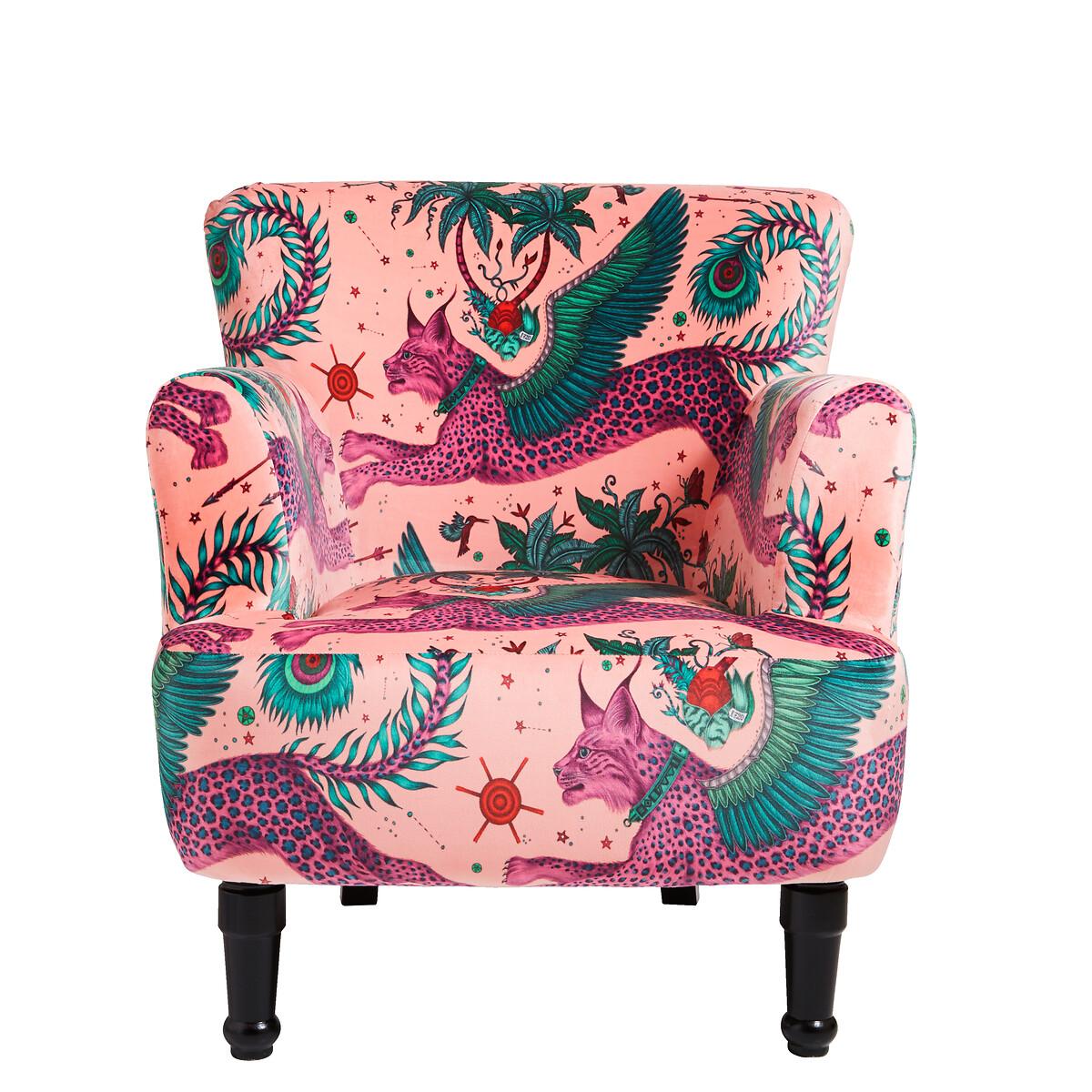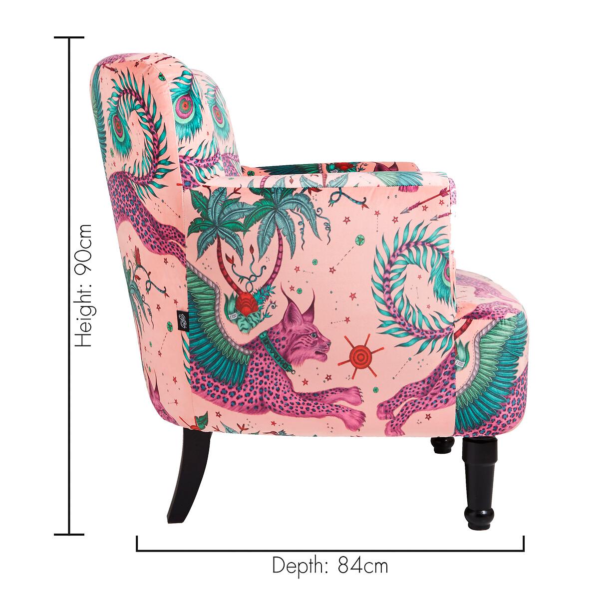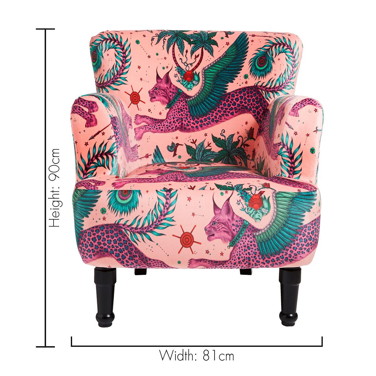 Intricate and striking winged lynx with peacock tails leap through a starry sky. This cosy armchair adorned with coral velvet is the perfect maximalist statement. Product Details Velvet upholstery Foam and fibre filling. Solid beech legs. Wooden frame Sponge clean only. Please note this product has a weight limit of 130 KGComposition Fabric- 100% Polyester, Legs- 100% Beech Wood, Filling- 100% FR Foam. Product Dimensions - 82 cm x82 cm x91 cm. Product Weight - 15 KGPackage Dimensions - 84 cm x 81 cm x 84 cm. This product will be dispatched by one of our trusted suppliers. You’ll be contacted by their selected courier about your delivery. Please note that this item cannot be delivered to the Offshore Islands, Northern Ireland or the Republic of Ireland.