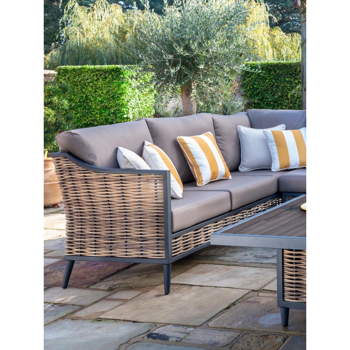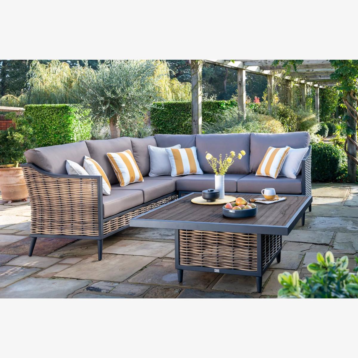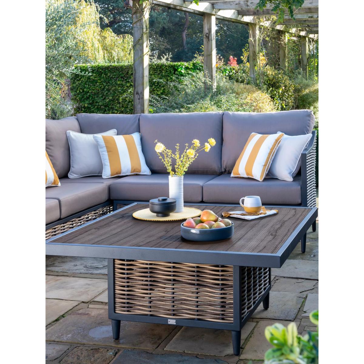 The striking Langley Corner Set adds drama to any large patio with its chunky 10mm raffia weave, bordered with powder-coated all-weather aluminium frames and topped with deep-seated cushioning. This set offers comfortable corner lounging or turn it into a casual dining environment simply by lifting and turning the table top. Plush cushions made using water and UV-resistant fabrics are filled with foam and fibre inners giving you a perfect sit in the sun. The set includes three plain 40cm scatter cushions and four 40cm scatter cushions in Laura Ashley's Lille Stripe Ochre print. The UV and frost-resistant rattan weave is hand woven onto rust-free powder-coated aluminium frames making the set weather-resistant so it can be left outside all year round. Cushions should be stored away when not in use. Key features: Langley corner seating with Oakley Taupe outdoor fabric cushions Langley adjustable coffee/dining table with Burnt Oak effect HPL top Three Oakley Canvas 40cm outdoor scatter cushions Four Laura Ashley Lille Stripe Ochre 40cm outdoor scatter cushions Reversible UK-manufactured cushions with upholstery quality foam bases and fibre-filled scatter cushions 10mm round core all-weather synthetic weave in Raffia colour UV, weather-resistant and chlorine-resistant outdoor fabrics Durable powder-coated rust-free aluminium frames in Matt Black Low maintenance set and no assembly required 5-year guarantee on the frames, 1-year guarantee on the cushions