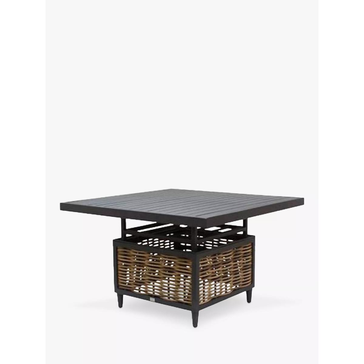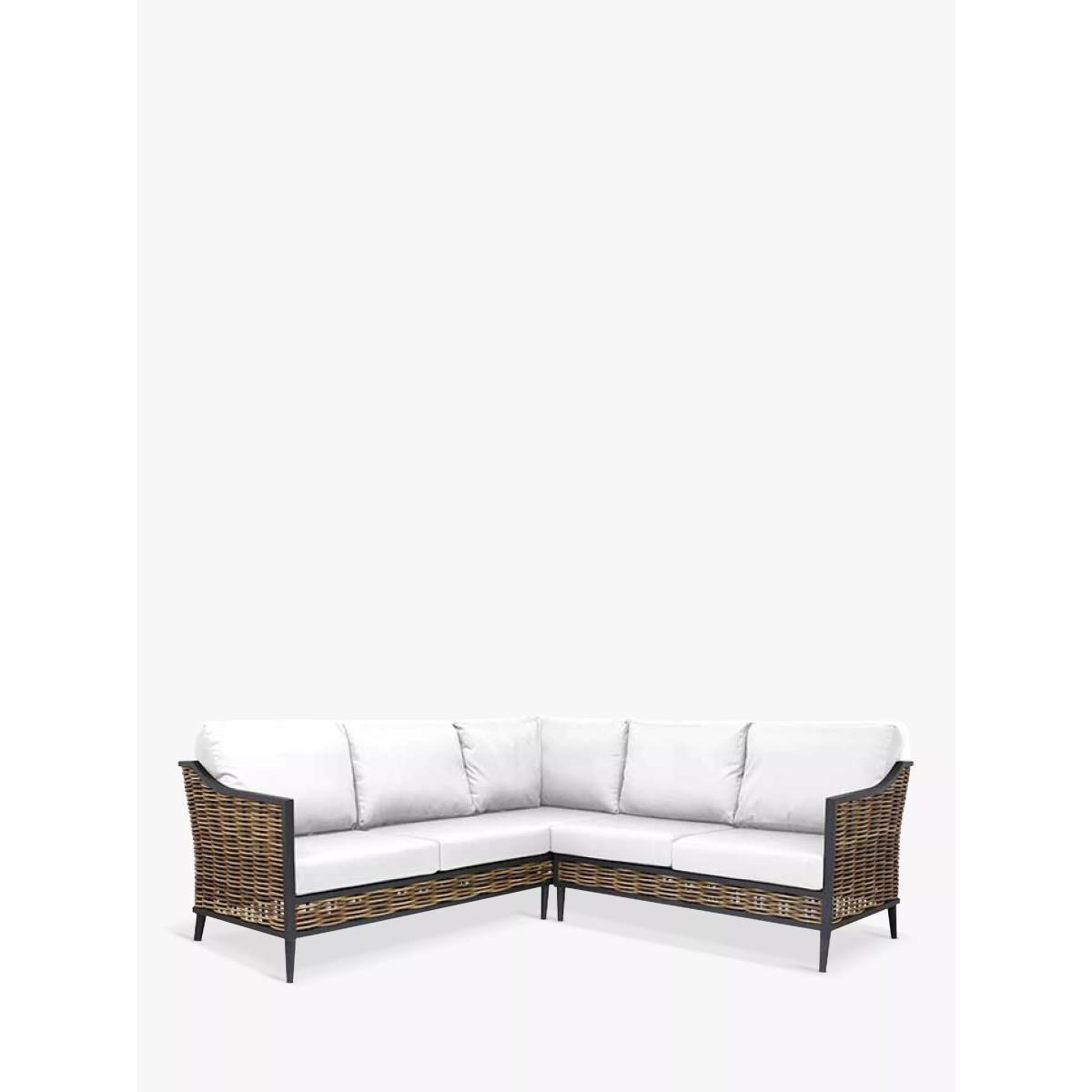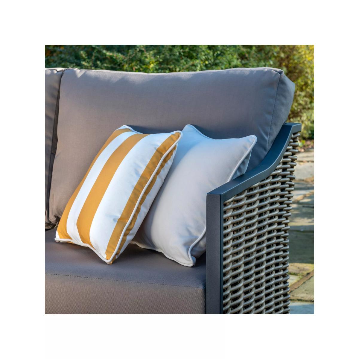 The striking Langley Corner Set adds drama to any large patio with its chunky 10mm raffia weave, bordered with powder-coated all-weather aluminium frames and topped with deep-seated cushioning. This set offers comfortable corner lounging or turn it into a casual dining environment simply by lifting and turning the table top. Plush cushions made using water and UV-resistant fabrics are filled with foam and fibre inners giving you a perfect sit in the sun. The set includes three plain 40cm scatter cushions and four 40cm scatter cushions in Laura Ashley's Lille Stripe Ochre print. The UV and frost-resistant rattan weave is hand woven onto rust-free powder-coated aluminium frames making the set weather-resistant so it can be left outside all year round. Cushions should be stored away when not in use. Key features: Langley corner seating with Oakley Taupe outdoor fabric cushions Langley adjustable coffee/dining table with Burnt Oak effect HPL top Three Oakley Canvas 40cm outdoor scatter cushions Four Laura Ashley Lille Stripe Ochre 40cm outdoor scatter cushions Reversible UK-manufactured cushions with upholstery quality foam bases and fibre-filled scatter cushions 10mm round core all-weather synthetic weave in Raffia colour UV, weather-resistant and chlorine-resistant outdoor fabrics Durable powder-coated rust-free aluminium frames in Matt Black Low maintenance set and no assembly required 5-year guarantee on the frames, 1-year guarantee on the cushions