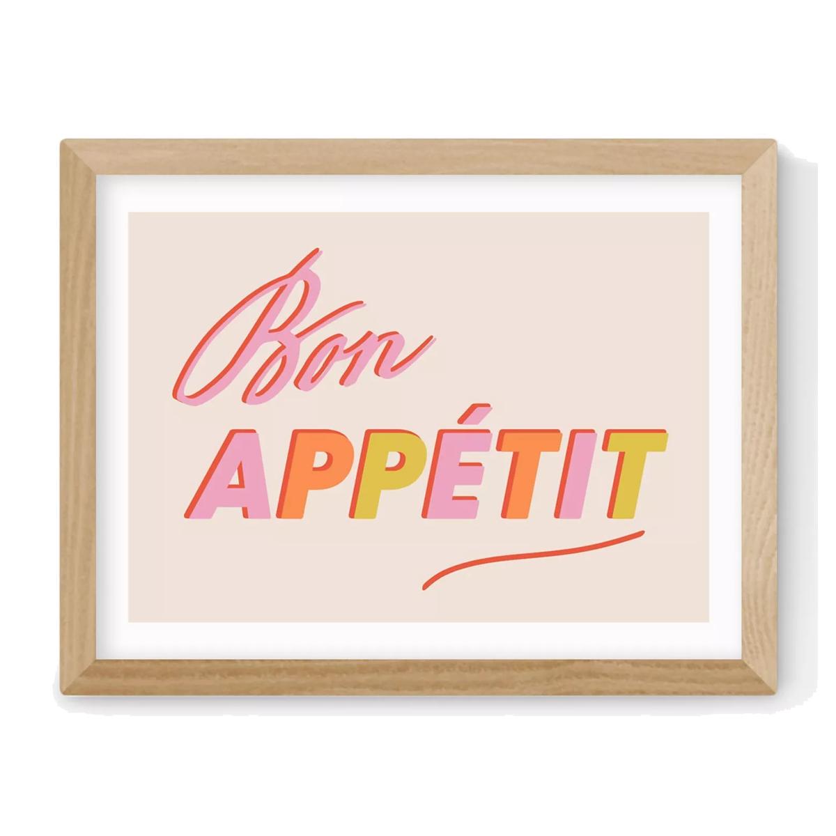 Say 'Bon Appetit' with this colourful typographic print by Studio Eleni. The giclée art printing process and 210gsm acid-free archival paper create an exhibition-quality art print with long-lasting colours that more closely resemble the artist's materials and tones. A digital form of the original work is stored and then printed using a commercial printer and pigment-based inks. Made in the UK, each print is presented with an acrylic glaze that's optically the same as glass yet lighter in weight making it easier and safer to hang. Ready to hang on your wall, it's framed in obeche wood in a choice of finishes. Have you thought about wall hooks and fittings? EAST END PRINTS picture frames are usually one of two frame widths: medium frame (2.2cm) and wide frame (3.5cm). The frame width varies across the range. The medium frame measures 2.2cm across and comes in the following four sizes: 33.4 x 28.4cm 43.4 x 33.4cm 53.4 x 43.4cm 83.4 x 63.4cm The wide frame measures 3.5cm across and comes in the following four sizes: 36 x 31cm 46 x 36cm 56 x 46cm 86 x 66cm