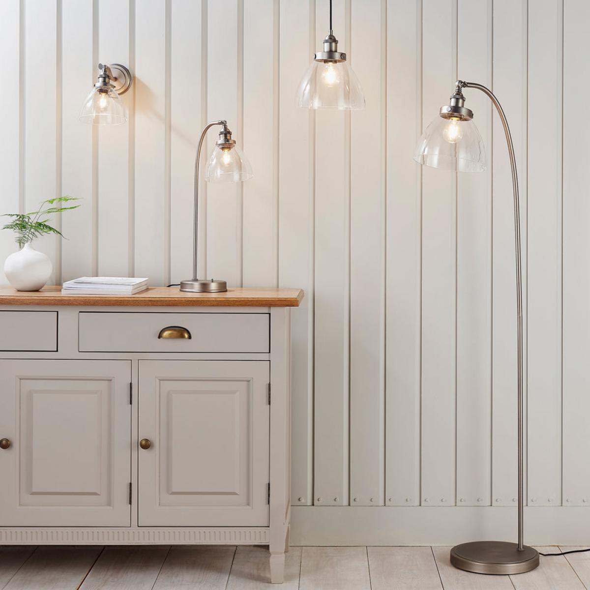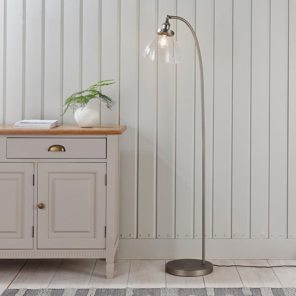 An authentic 'resto' style adjustable floor lamp, finished in brushed silver paint with authentic knurled lamp holder details and clear glass shades. Featuring an adjustable knuckle and accessible on/off switch, pair this table light with filament LED lamps for that perfect industrial style. The perfect addition for today's stylish homes to create that on trend bar, bistro look.