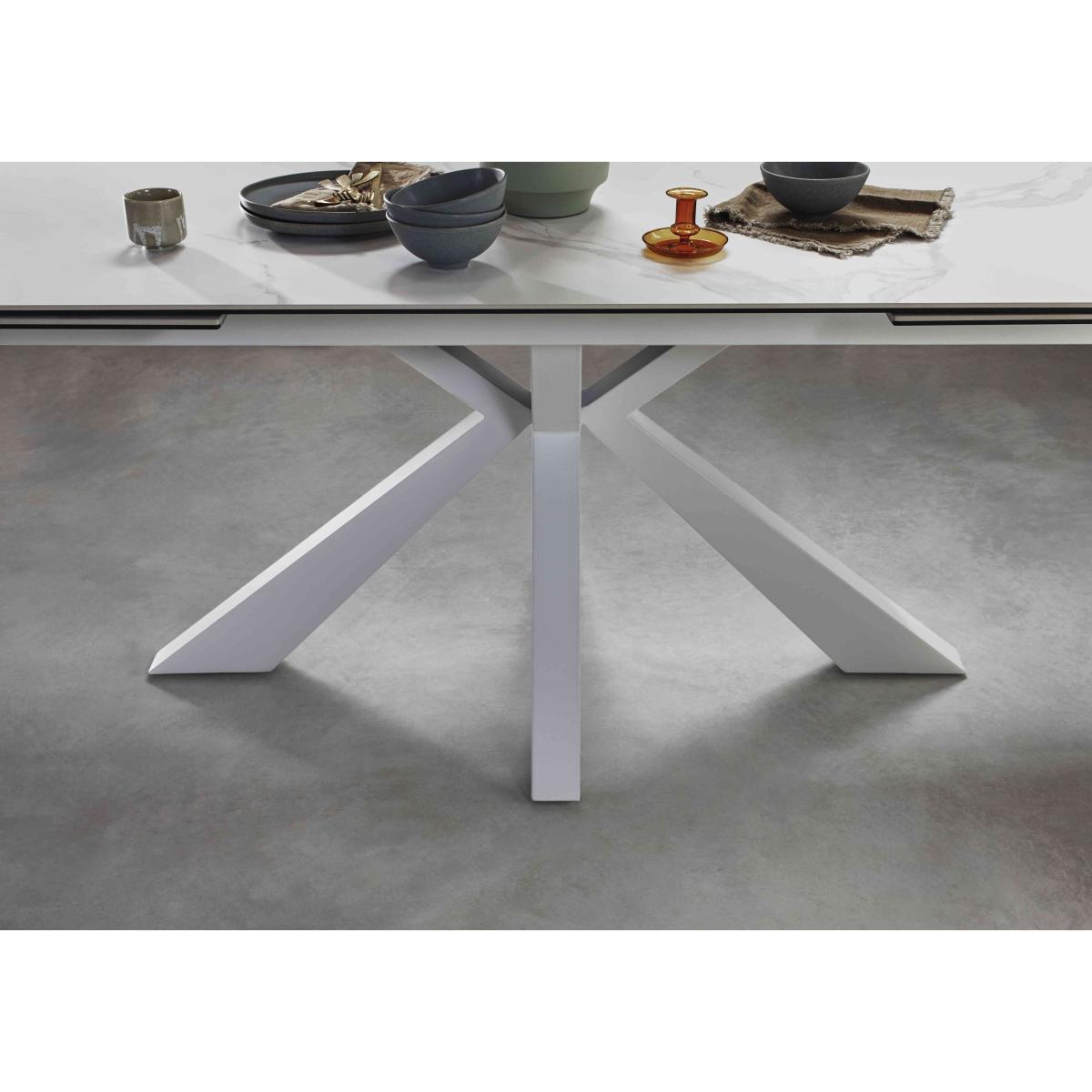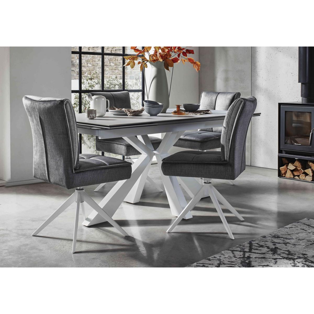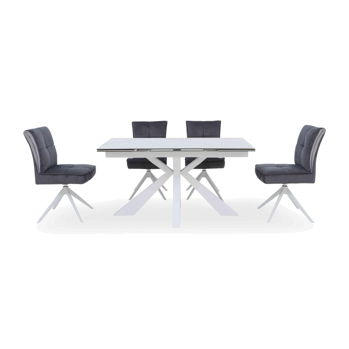 Ice-white and the essence of cool modern style, our Glacier collection of dining room furniture and living room tables and storage pieces is furniture for today – and the future. The finish is beautiful: a matt white ceramic with marble-effect patterning that’s highly durable and perfect for both busy homes and elegant spaces. Extending dining tables and occasional tables have white powder-coated metal bases while the range’s TV unit, sideboard, highboard and curio cabinets showcase sleek, high-gloss lacquered finishes with built-in LED lighting. The fabulous Glacier collection is exclusively available at Furniture Village. Bring cool modern style to a smaller dining space with this gorgeous dining set. The extending table has a matt white ceramic top and the swivel-base dining chairs even have pocket sprung seats. Why you'll love it Our Glacier range is cool, calm and very collectible. Stunning modern extending dining table has a striking ice-white finish. Matt ceramic top with marble-effect patterning. Bonded to a layer of tempered glass for extra durability. Metal star-shape base with a white powder-coated finish. Ideal for modern family life – ceramic is heatproof, scratch-resistant and chip-resistant. Extends to seat 8. 2 extra leaves simply pull out from the table ends. Dining set includes 4 incredibly comfortable dining chairs. Pocket sprung seats with 8 cm-deep springs and foam cushioning. Auto-return swivel mechanism – chairs always return to their original position. White powder-coated metal legs. Fabric upholstery in ever-fashionable grey. The Glacier range is only available at Furniture Village. This dining set is part of our Glacier range. What you need to know Dining chairs have metal frames and legs. Cushioned with foam. This small 140 cm extending dining table seats 6 closed and extends to 200 cm to seat 8. Top is made of 6 mm ceramic bonded to 6 mm tempered glass. This dining table is very heavy and should not be moved once in place. We recommend using coasters and placemats at all times. Easy to care for. Simply wipe with a clean damp cloth and dry with a soft duster. Do not use abrasive cleaning products.