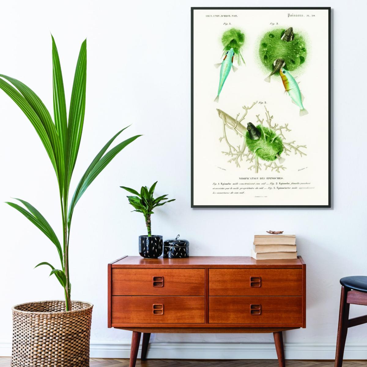 I love the green Gasterosteus print for adding a touch of scientific charm to a space. It's a versatile piece that works well in modern, minimalist interiors if you want an unexpected pop of colour, or in a vintage styled scheme where it can complement antique wood and metal accents. Practical styling tips include pairing it with neutral backgrounds to let the green pop or placing it in a frame with subtle detailing for a more curated look. It’s especially effective in home offices, living rooms, or even bathrooms where a hint of nature-inspired decor can bring a fresh feeling. This print is a clever way to introduce colour and intrigue without overwhelming the space.