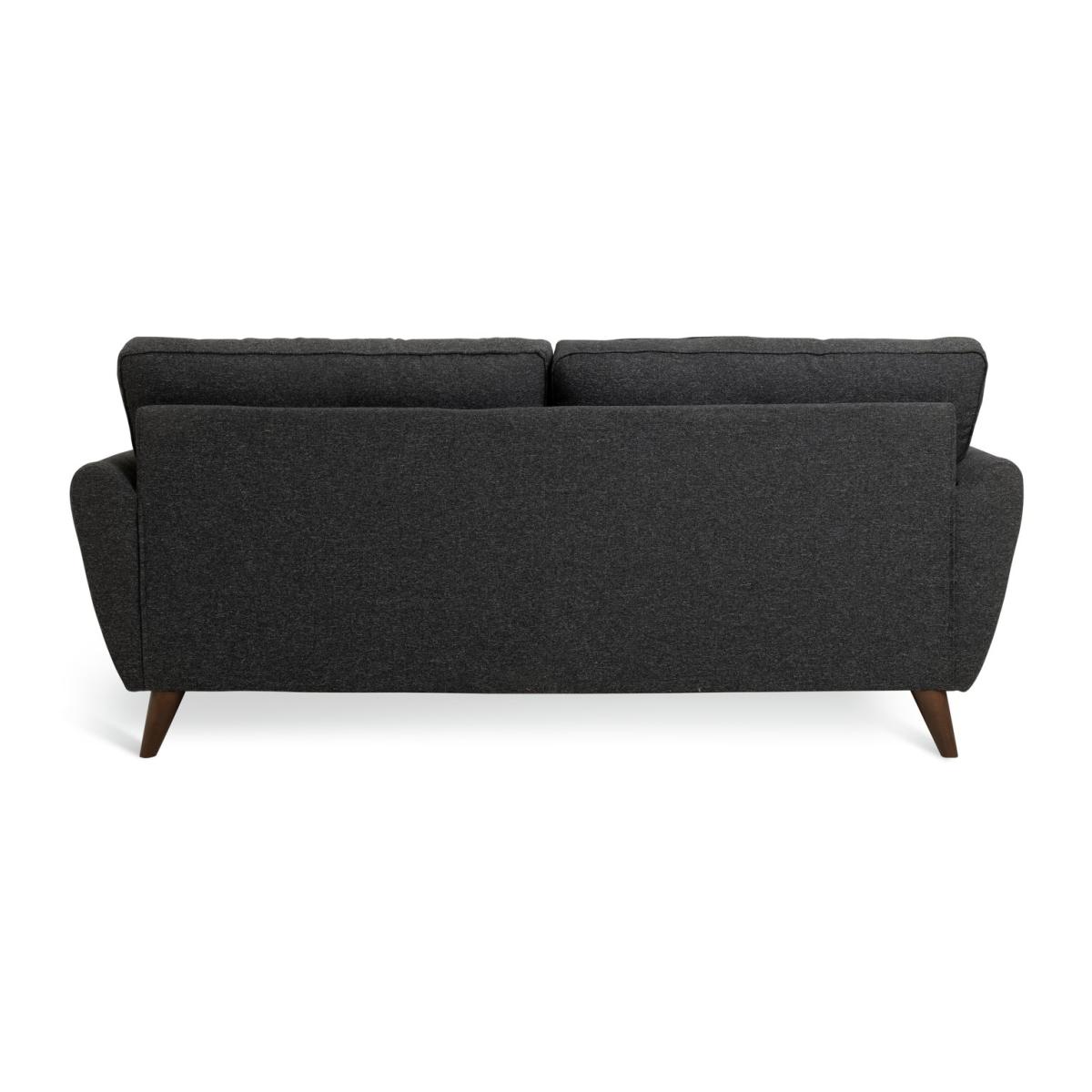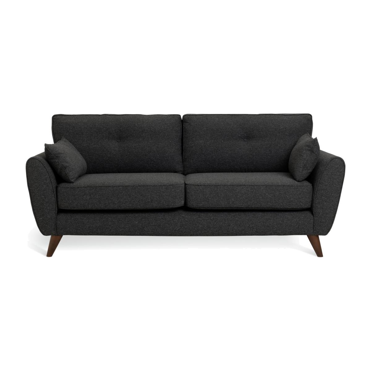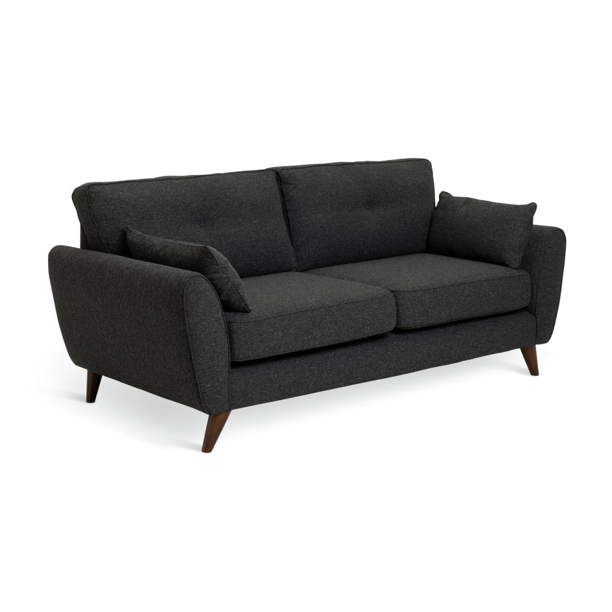 Retro chic. Upholstered in woven charcoal fabric, our 3-seater Iris sofa features mid-century modern touches. Check out the clean curves, button back removable cushions and splayed beech wood legs. Relax into the comfy removable seats, arrange the 2 scatter cushions and settle in. Part of the Iris collection. Material: Made from 1% polyester. Wooden feet. Medium firm seat cushions. Removable seats with foam filling. Removable cushion(s) with fibre topped foam filling. Dimensions: Size H84, W194, D92cm. Floor to seat height: 47cm. Depth of seat: 60cm. Height of seat back: 40cm. Width of seating area between arms: 154cm. Height of arm rest: 60cm. Weight 41.5kg. Professional clean only. Plump cushions regularly to maintain shape. Minimal assembly - just add feet. Maximum individual user weight 110kg. Packaged dimensions: Package size H60, W196, D94cm. FSC certified meaning the materials used for this product are responsibly sourced. General information: Manufacturer's 1 year guarantee.