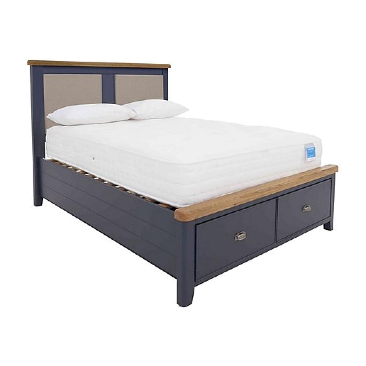 With its contemporary dark blue painted finish and roomy end drawers, the Hewitt bed frame brings both style and storage to any bedroom. This unique wooden bed frame is only available at Furniture Village. Why you'll love it Beautiful bed frame with an on- trend dark blue painted finish. Traditional craftsmanship meets understated contemporary style. Striking proportions with practical end- drawer storage. Contrasting oak headboard and footboard tops have gently rounded corners. Drawers have metal cup handles in an antique brass finish. Cushioned headboard panels are upholstered in a natural tweed fabric. Slatted base is suitable for any type of mattress. Available in a super king size. Painted finish is hardwearing but may chip if knocked. Natural oak surfaces may display knots, markings and colour variation. This bed frame is also available in a classic all- oak finish. Part of the extensive Hewitt range of coordinating bedroom furniture. Exclusive to Furniture Village. What you need to know Painted bed frame is made of solid pine; oak bed frame is made of solid oak. 2 drawers. Periodically check that fittings have not become loose. Centre rail legs must always be vertical. Dust with a lint- free cloth. Do not use silicon- based furniture polish. Painted finish is hardwearing but may chip if knocked. Natural oak surfaces may display knots, markings and colour variation. The Hewitt range includes a wide choice of wardrobes, chests of drawers, bed frames and more.