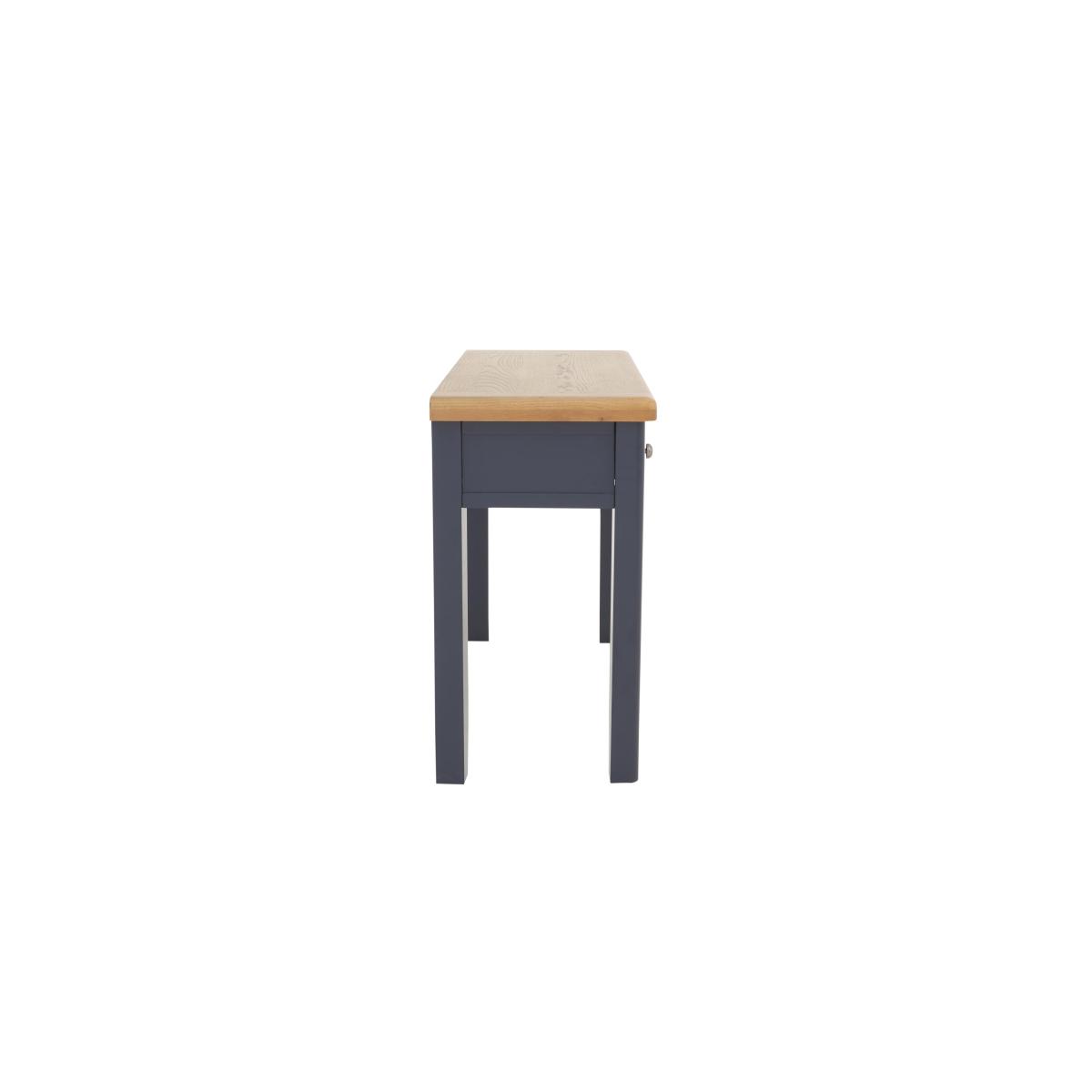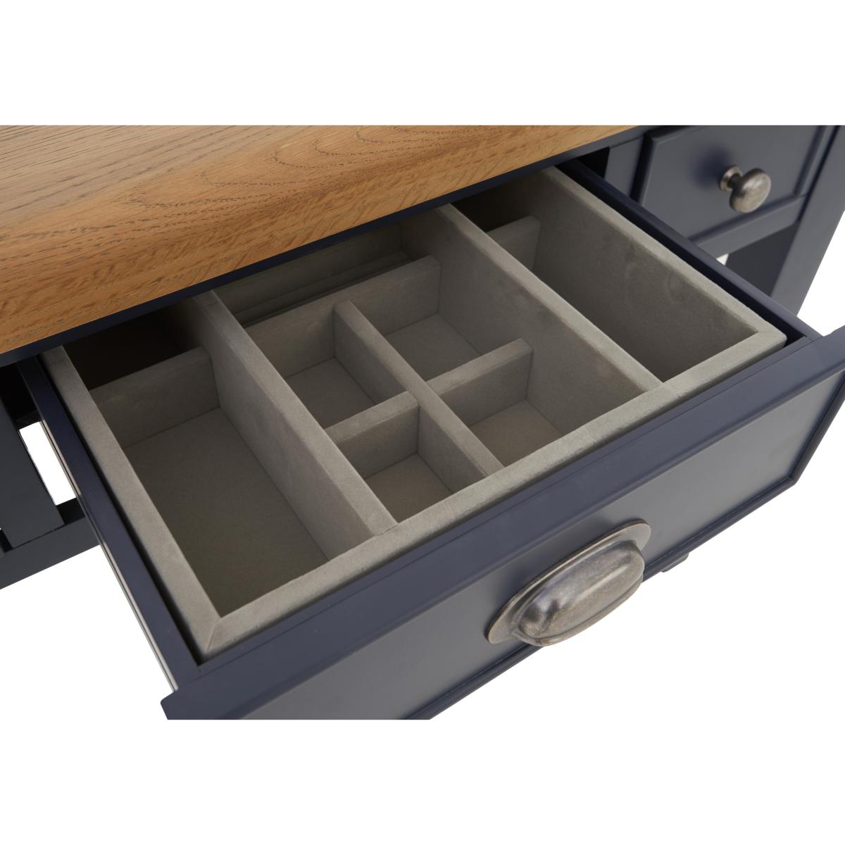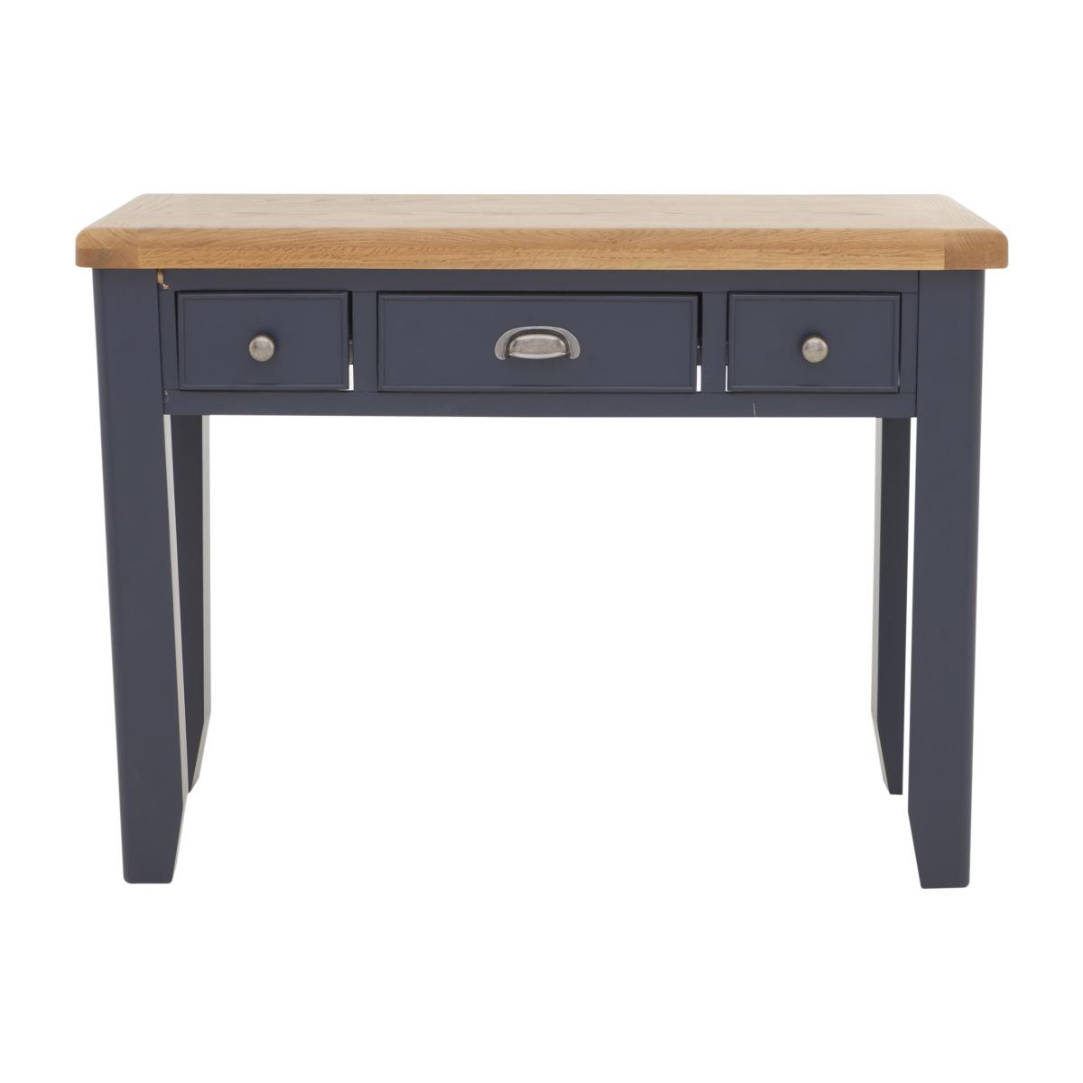 Contemporary painted furniture style meets high-end craftsmanship in the Hewitt bedroom furniture range. Finished in a deep dark blue – a colour that works equally well in modern and classic interiors – this collection is both on trend and understated. The range’s generously proportioned pieces are solidly constructed and offer elegant details like rounded oak tops as well as eminently practical storage features. The statement bed frame, for example, has two end drawers neatly finished with metal cup handles. Comprising chests of drawers, wardrobes and more, the Hewitt bedroom furniture collection is also available in an all-oak finish. With three drawers for makeup and a spacious surface for other bits and pieces, the Hewitt dressing table makes getting ready a breeze. It’s a looker too, thanks to its lovely dark blue painted finish. Only at Furniture Village. Why you'll love it. Beautiful dressing table with an on-trend dark blue painted finish. Traditional craftsmanship meets understated contemporary style. Generously proportioned with practical drawer storage. Contrasting oak top has gently rounded corners. 3 drawers have metal cup handles in an antique brass finish. This dressing table is also available in a classic all-oak finish. Part of the extensive Hewitt range of coordinating bedroom furniture. Exclusive to Furniture Village. What you need to know. Painted dressing table is made of solid pine; oak dressing table is made of solid oak. 3 drawers. Dust with a lint-free cloth. Do not use silicon-based furniture polish. Painted finish is hardwearing but may chip if knocked. Natural oak surfaces may display knots, markings and colour variation. The Hewitt range includes a wide choice of wardrobes, chests of drawers, bed frames and more. Warning!. Furniture can tip over unexpectedly and cause injury. This item should be fixed to a wall using the anti-tip kit provided with the furniture. Be sure to use the correct wall fixings suitable for the walls in your home.