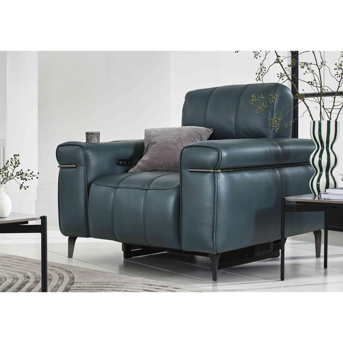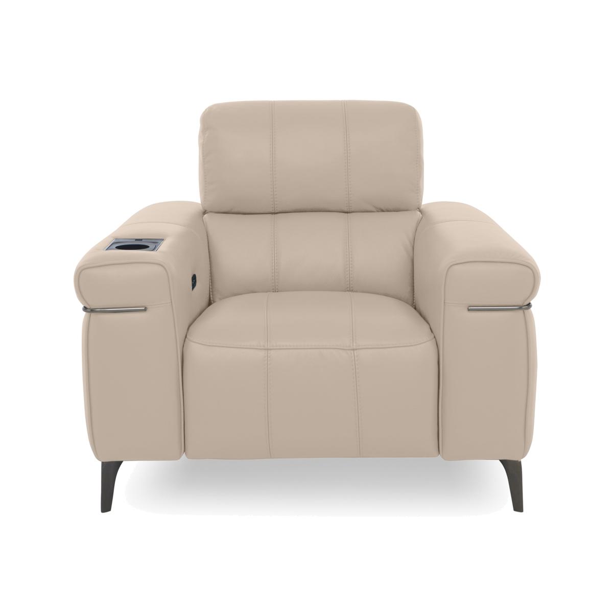 Turn your living room into the most stylish of in-home cinemas with sofas, chairs and footstools from our Homestage range. The collection includes stunning media sofas and armchairs that connect via Bluetooth to your TV or phone and have surround sound speakers hidden in the incredibly comfortable cushioning for the next level in 4. D entertainment. And with power recliners with independently-moving backrests and footrests, perfect-position power headrests, built-in massage units and sprung seats and backs, the comfort is every bit as enthralling. Made in Italy and available in a wide choice of soft fabric and 100% leather upholstery options, the Homestage range is a Furniture Village exclusive. This Italian power recliner chair in 100% leather delivers more than style. This media chair comes with Bluetooth and surround sound built in for an at-home cinematic experience like never before. Why you’ll love it Cinema-style entertainment meets contemporary Italian style in this media chair. Bluetooth connection to your TV or phone for an immersive 4. D experience. Surround sound speakers are embedded into cushioning. With wireless, USB and USB-C charging. Power recliner features independent backrest and footrest motion. Perfect-position headrest means perfect comfort, every time. Built-in massage feature for the ultimate in relaxation. Sprung seat and back for superbly balanced support wherever you sit. 100% leather upholstery with linear stitching in a huge choice of on-trend colours. Stiletto-style metal legs with a high-shine nickel-plated finish in black. Matching metal arm trim. Handmade in Italy. A Furniture Village exclusive. This leather power recliner media chair is part of our Homestage range. What you need to know Medium comfort level. Seat suspension: no-sag springs. Seat cushioning: foam and inner coil spring. Cushioning is fixed. Back suspension: rubber webbing. Back cushioning: foam and loose fibre. Cushioning is fixed. Arm cushioning: foam and fibre. Please allow time for new recliners to ease. Minor gaps are necessary to ensure ease of recliner motion and may be exaggerated depending on floor type. Leather has unique marks and characteristics with variation in colour and texture. Leather softens with use. Smoothing the tops of leather cushions prevents signs of visual comfort. Please read our upholstery care guide for more advice.