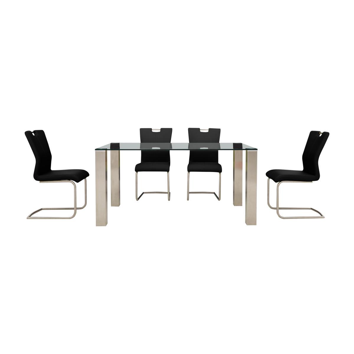 Got a clever idea for your kitchen diner or dining room? Ideas can make it happen. Cool, contemporary and highly customisable, the Ideas dining collection makes it easy to create the perfect dining set for you and your home. Both the dining table and bar table are available in a choice of four different glass tops and two different leg finishes. Dining chairs and bar stools feature a selection of stylish bases and come in ten fabulous colours for the faux leather upholstery. Simply mix and match colours, styles and finishes and make something amazing. Fantastic value, fabulous style – that’s Ideas. Style is served – with a side of contemporary cool. This ultra-modern dining set features a striking glass tabletop and on-trend faux-leather cantilevered chairs. Why you’ll love it. Sleek and minimalist design at a great-value price. Ultra-modern style that takes centre stage in any dining space. Four contemporary faux-leather cantilevered chairs in a choice of colours. Opt for stainless steel or industrial-style black powder-coated steel legs. Square-edged legs make an instant style statement. The grey glass top is easy to clean and super-practical. What you need to know. Use placemats and coasters at all times to avoid scratching the surface. Simply mop spills with a damp cloth. Avoid using abrasive clothes or cleaning materials. A compact bar table and a wide selection of dining sets are also available.