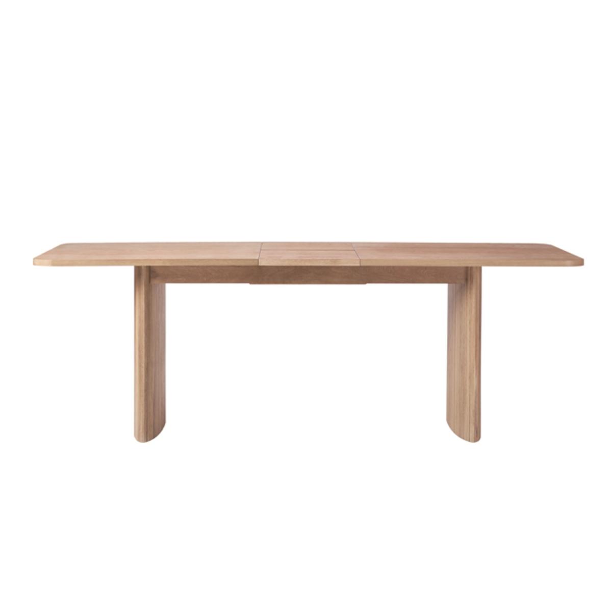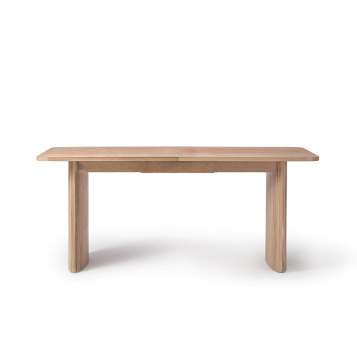 Extend your dining capabilities with this large light oak veneered table with limed finish. The solid oak legs have a Tambour finish, creating a stylish and modern look. Pair the table with a variety of different chairs to suit your taste. You can host up to 8 people comfortably around the table, perfect for dinner parties or having all the family round for tea. The extension leaf stores inside the table for easy and convenient storage. Due to the nature of the natural wood, each piece will be unique due to the variation of the real wood grain. - Please use heat-protective mats & coasters when placing food & hot/cold drinks onto the table to protect the natural oak wood, clean up any spills straight away as oak wood is porous and will absorb liquids.