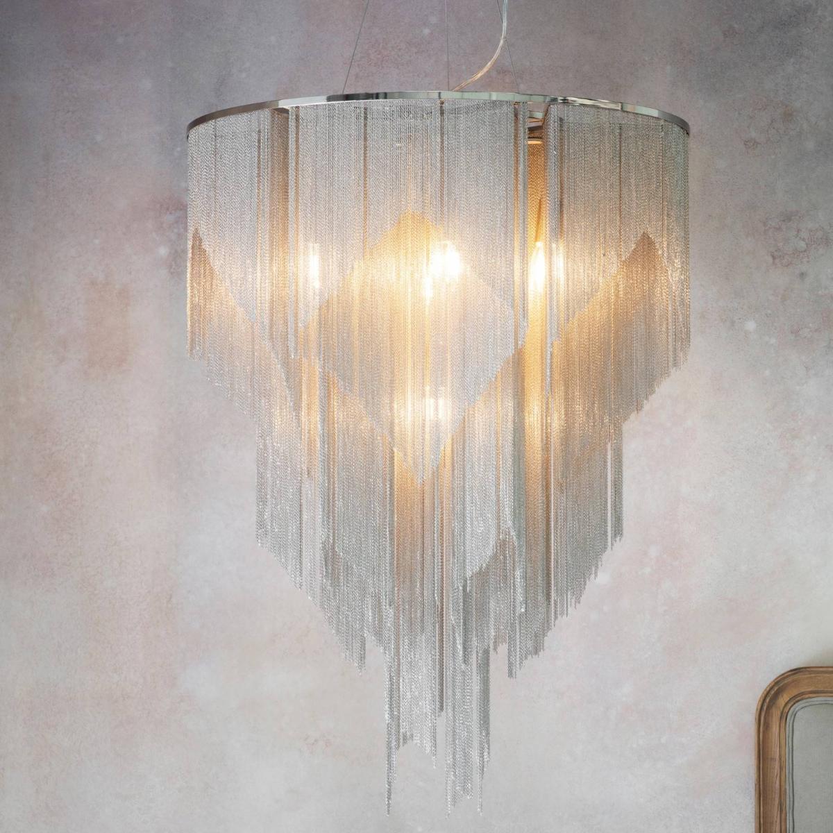 Contemporary 7 Light Pendant Ceiling Light in nickel and silver metal finish. The Loire seven light pendant is carefully and delicately hand dressed with thousands of beautiful fine chains, creating a striking decorative work of art, that is the perfect centre piece for the most loved rooms in your home. Carefully suspended from height adjustable delicate wire with clear flex, create a beautiful diffused light with the use of LED filament lamps. Due to the weight of this product we recommend a qualified electrician for fitting. Contemporary 7 Light Pendant Ceiling Light in nickel and silver metal finish. The Loire seven light pendant is carefully and delicately hand dressed with thousands of beautiful fine chains, creating a striking decorative work of art, that is the perfect centre piece for the most loved rooms in your home. Carefully suspended from height adjustable delicate wire with clear flex, create a beautiful diffused light with the use of LED filament lamps. Due to the weight of this product we recommend a qualified electrician for fitting.