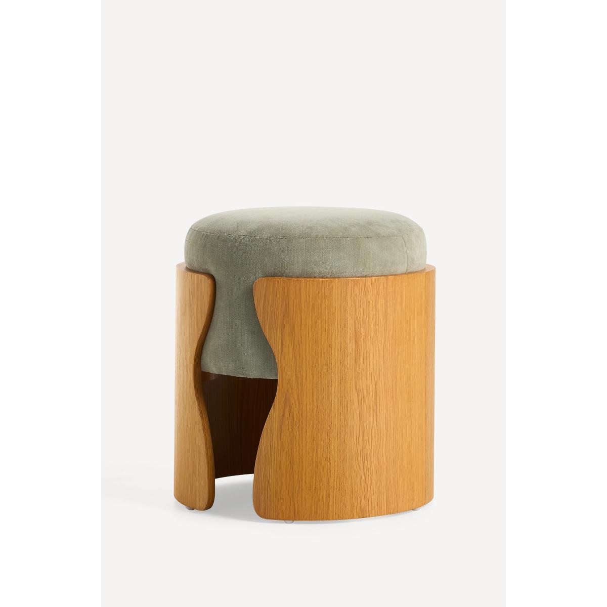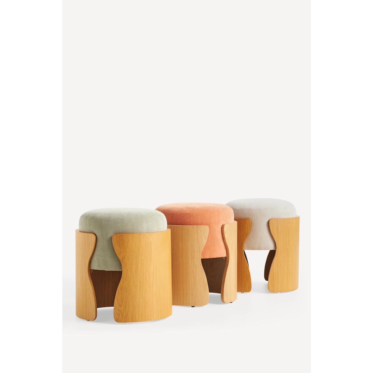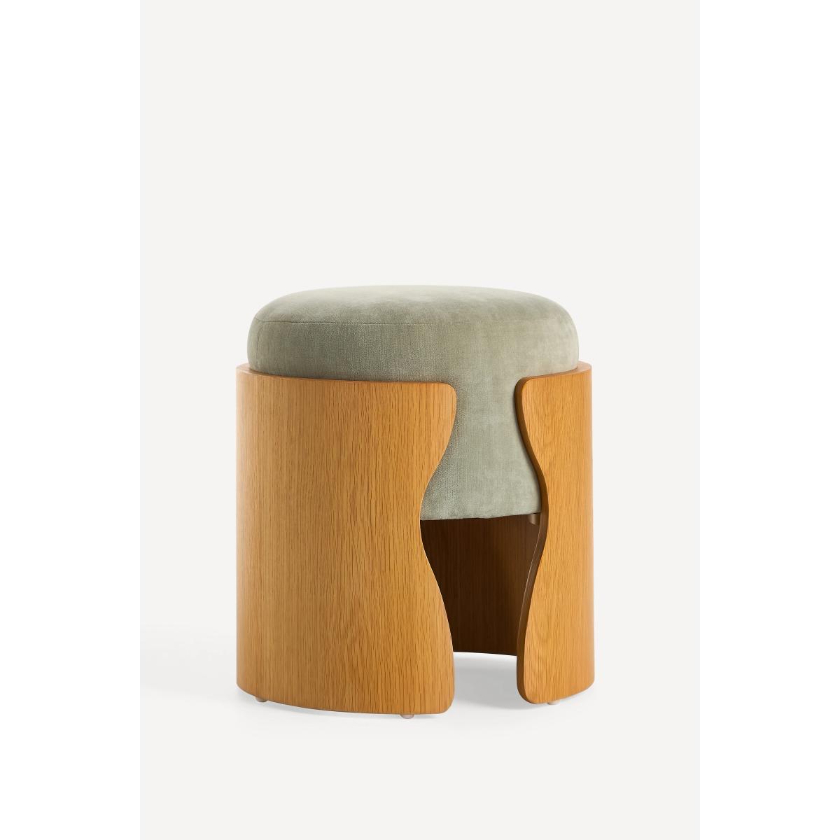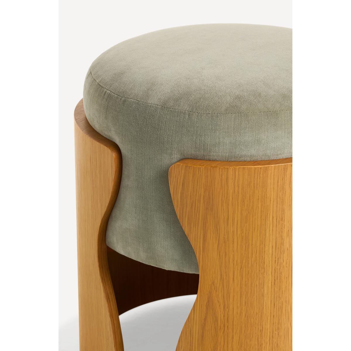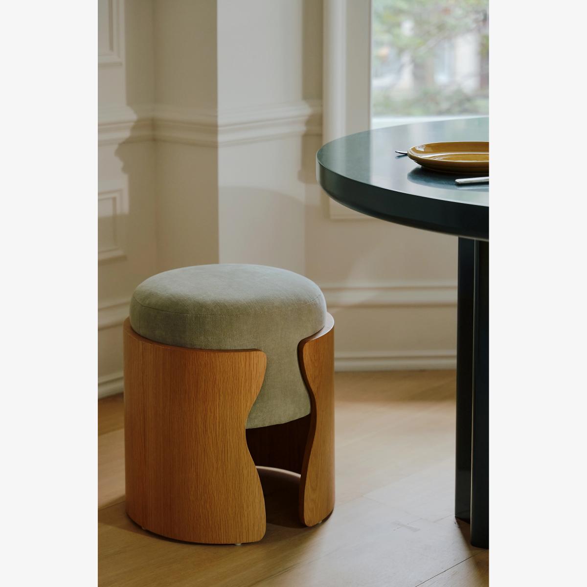 A smooth velvet pouf cushion is encased in an oak wood base, making this stool a must-have statement piece in any space. * Velvet upholstery: 100% polyester * One seat cushion; foam and fiber fill * Sinuous spring seat construction * Oak wood frame * Turned legs * Professionally clean * This item is intended for indoor use * No assembly required * Imported