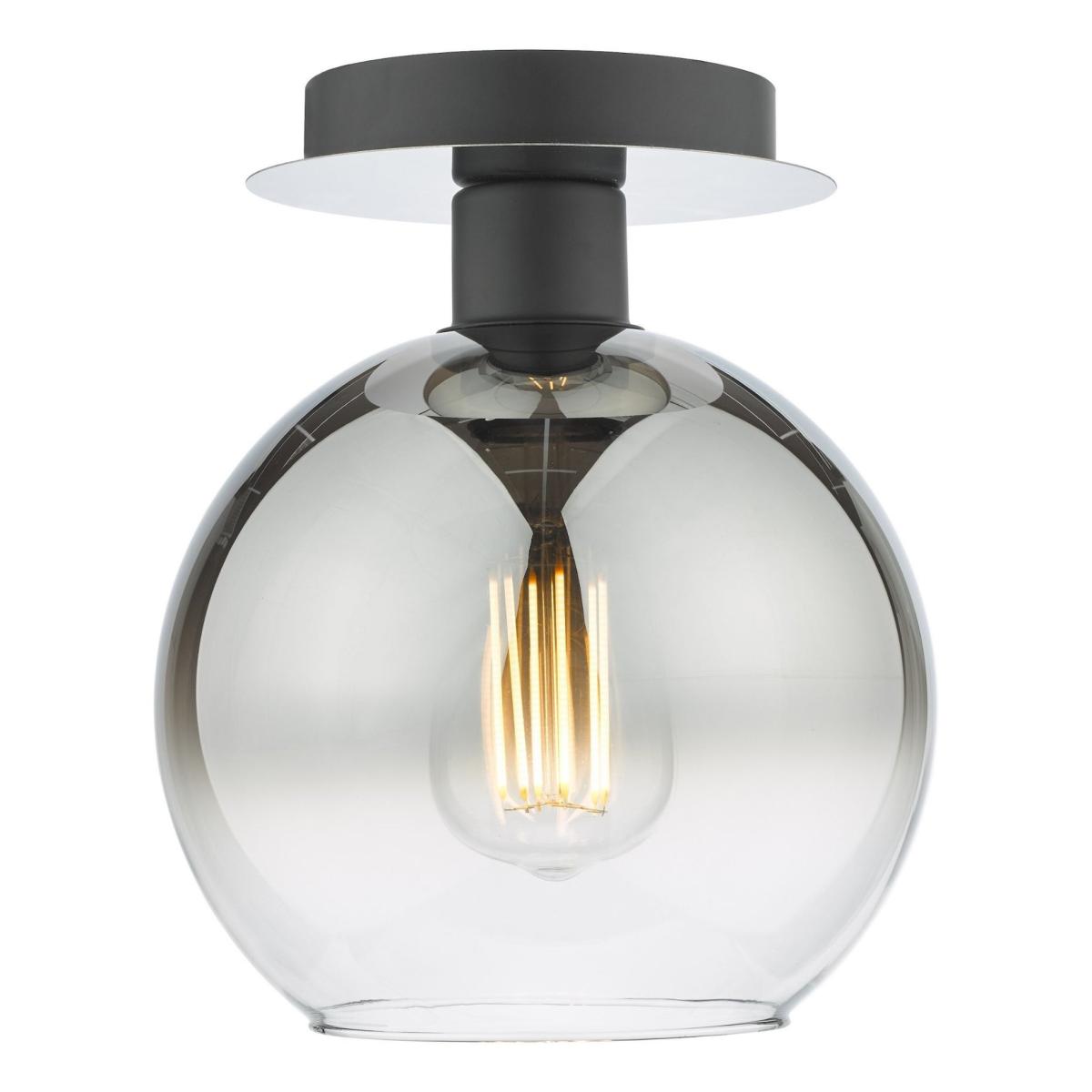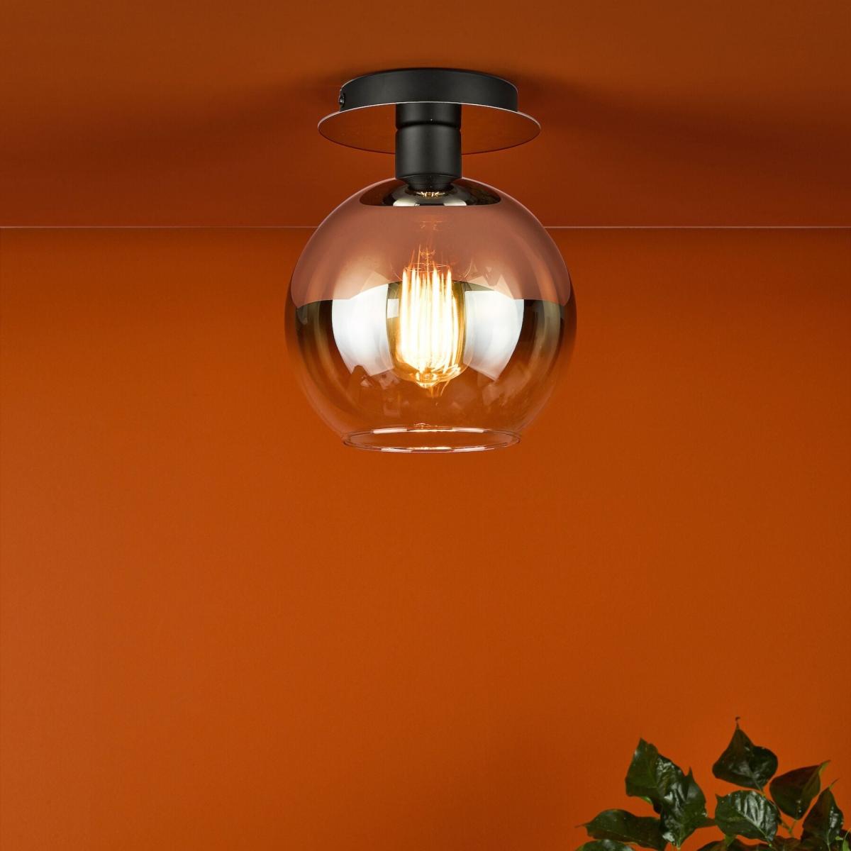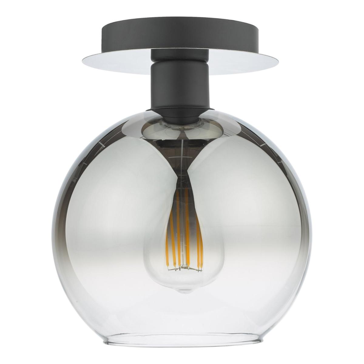 Lycia 1-light semi-flush ceiling light, featuring a large, ombre smoked glass globe shade and a mirrored ceiling fixture with matte black detailing. Make a bold statement with the Lycia semi-flush ceiling light, a perfect blend of modern elegance and understated sophistication. This striking fixture features an ombre smoked glass globe shade, creating a mesmerising gradient effect that diffuses light beautifully throughout the room. The mirrored ceiling fixture is complemented by matte black detailing, adding a sleek and contemporary touch to its design. Ideal for low ceilings or spaces needing a stylish yet functional lighting solution, the Lycia ceiling light enhances any room with its dramatic aesthetic and warm, ambient glow. Whether in a living area, bedroom or hallway, it serves as both a practical light source and an eye-catching decor element. Lycia 1-light semi-flush ceiling light, featuring a large, ombre smoked glass globe shade and a mirrored ceiling fixture with matte black detailing. Make a bold statement with the Lycia semi-flush ceiling light, a perfect blend of modern elegance and understated sophistication. This striking fixture features an ombre smoked glass globe shade, creating a mesmerising gradient effect that diffuses light beautifully throughout the room. The mirrored ceiling fixture is complemented by matte black detailing, adding a sleek and contemporary touch to its design. Ideal for low ceilings or spaces needing a stylish yet functional lighting solution, the Lycia ceiling light enhances any room with its dramatic aesthetic and warm, ambient glow. Whether in a living area, bedroom or hallway, it serves as both a practical light source and an eye-catching decor element.