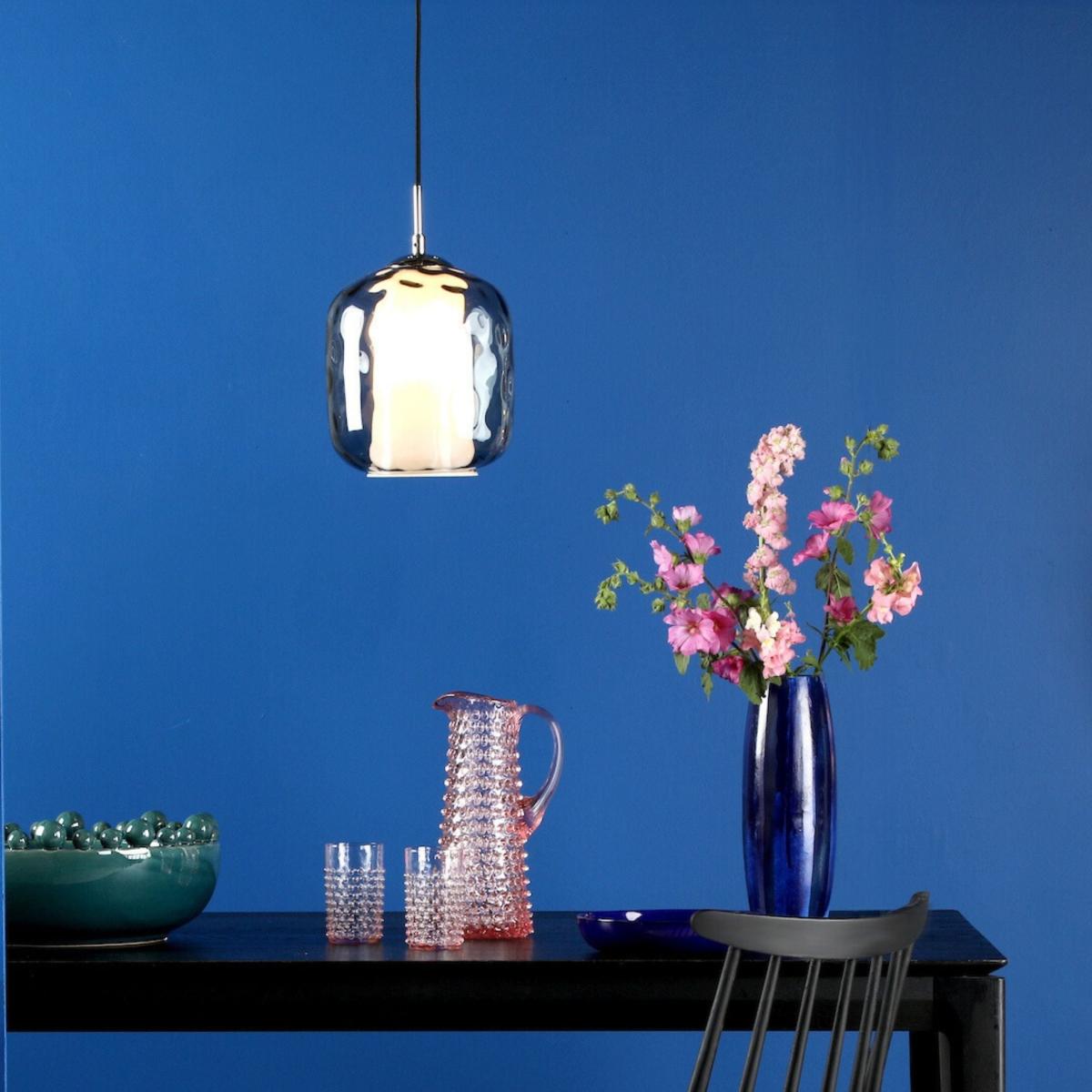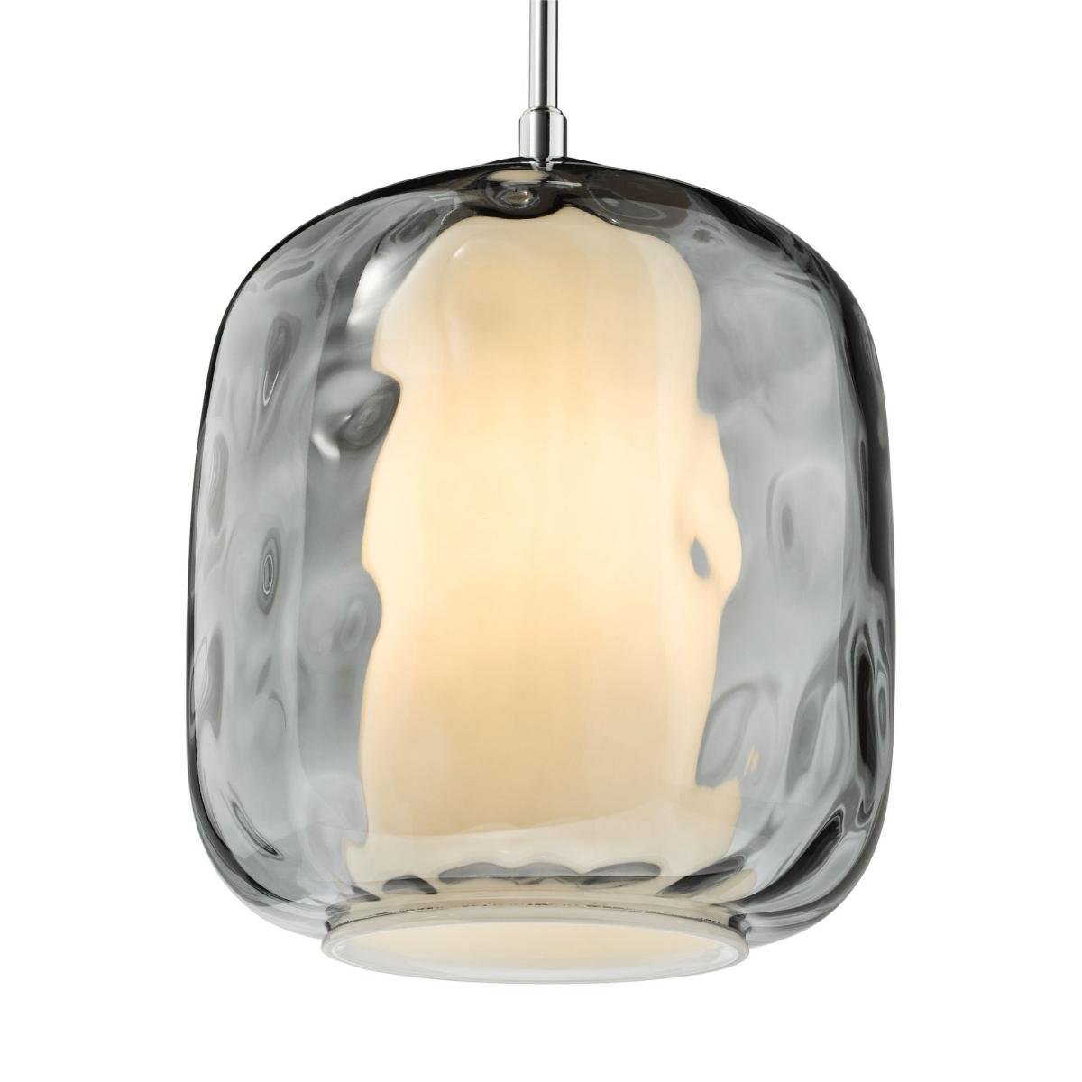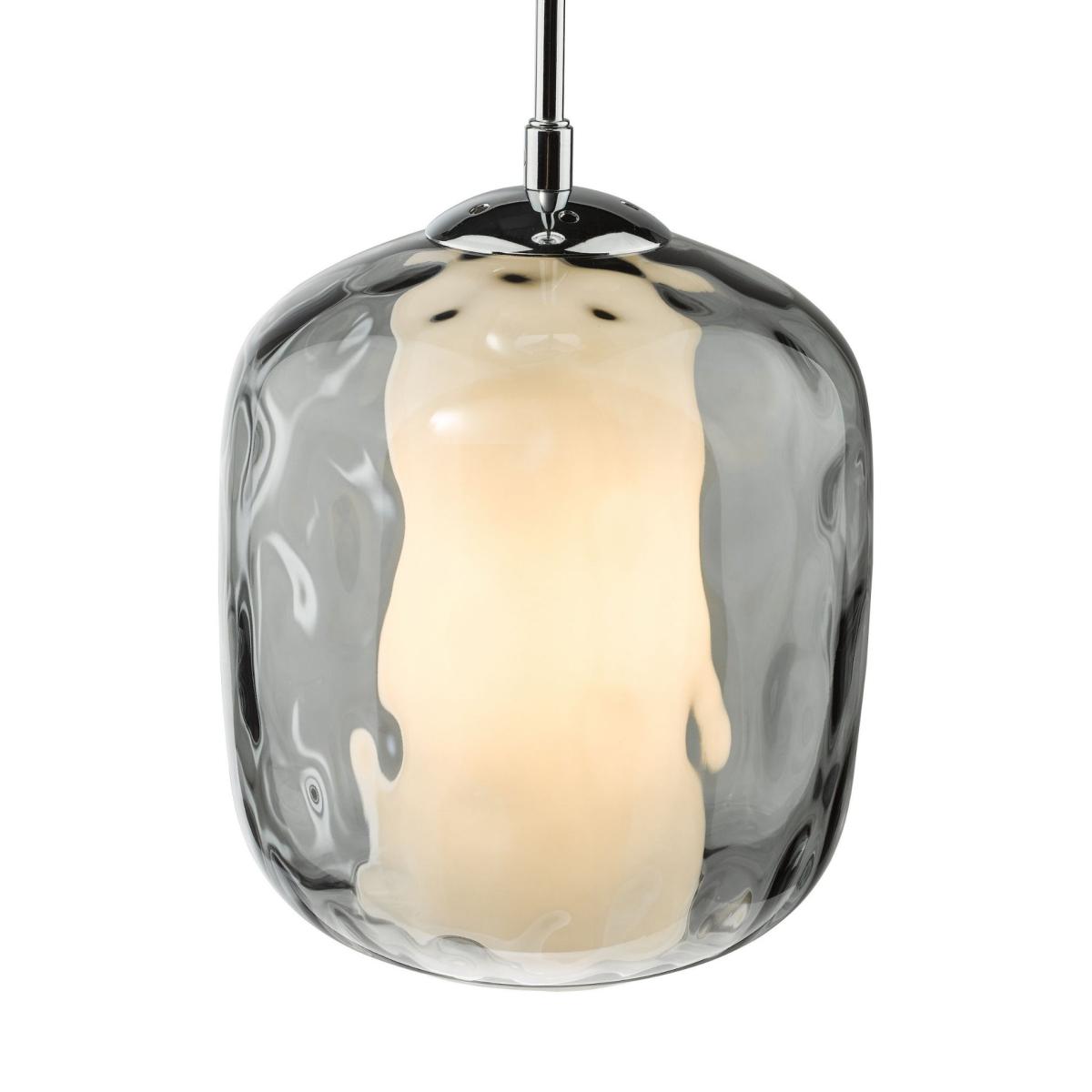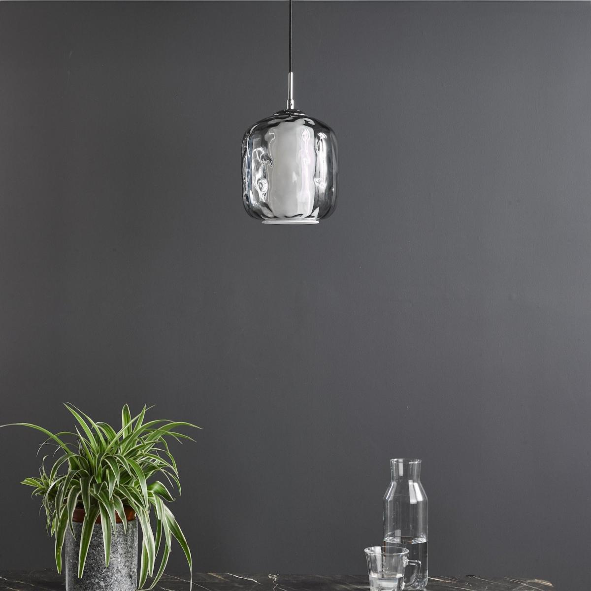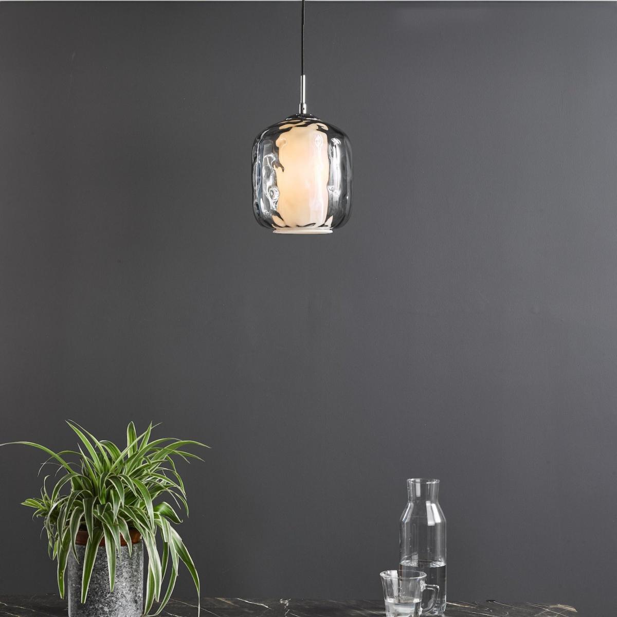 Majella 1-light pendant ceiling light, featuring a dimpled smoked glass outer shade, an opal glass inner diffuser and polished chrome metalwork. The Majella pendant ceiling light exudes a modern elegance with its sophisticated design. The dimpled smoked glass outer shade adds texture and depth, creating a unique, atmospheric glow when illuminated. Inside, the opal glass diffuser ensures a soft, diffused light, perfect for setting a warm and inviting ambiance. The polished chrome metalwork beautifully contrasts the dark glass, adding a sleek, contemporary finish that enhances the overall aesthetic. This pendant light is ideal for hanging over dining tables, kitchen islands or entryways, providing both style and function. With its blend of modern design elements, the Majella pendant light makes a statement in any space, offering both elegance and high-quality lighting. Majella 1-light pendant ceiling light, featuring a dimpled smoked glass outer shade, an opal glass inner diffuser and polished chrome metalwork. The Majella pendant ceiling light exudes a modern elegance with its sophisticated design. The dimpled smoked glass outer shade adds texture and depth, creating a unique, atmospheric glow when illuminated. Inside, the opal glass diffuser ensures a soft, diffused light, perfect for setting a warm and inviting ambiance. The polished chrome metalwork beautifully contrasts the dark glass, adding a sleek, contemporary finish that enhances the overall aesthetic. This pendant light is ideal for hanging over dining tables, kitchen islands or entryways, providing both style and function. With its blend of modern design elements, the Majella pendant light makes a statement in any space, offering both elegance and high-quality lighting.