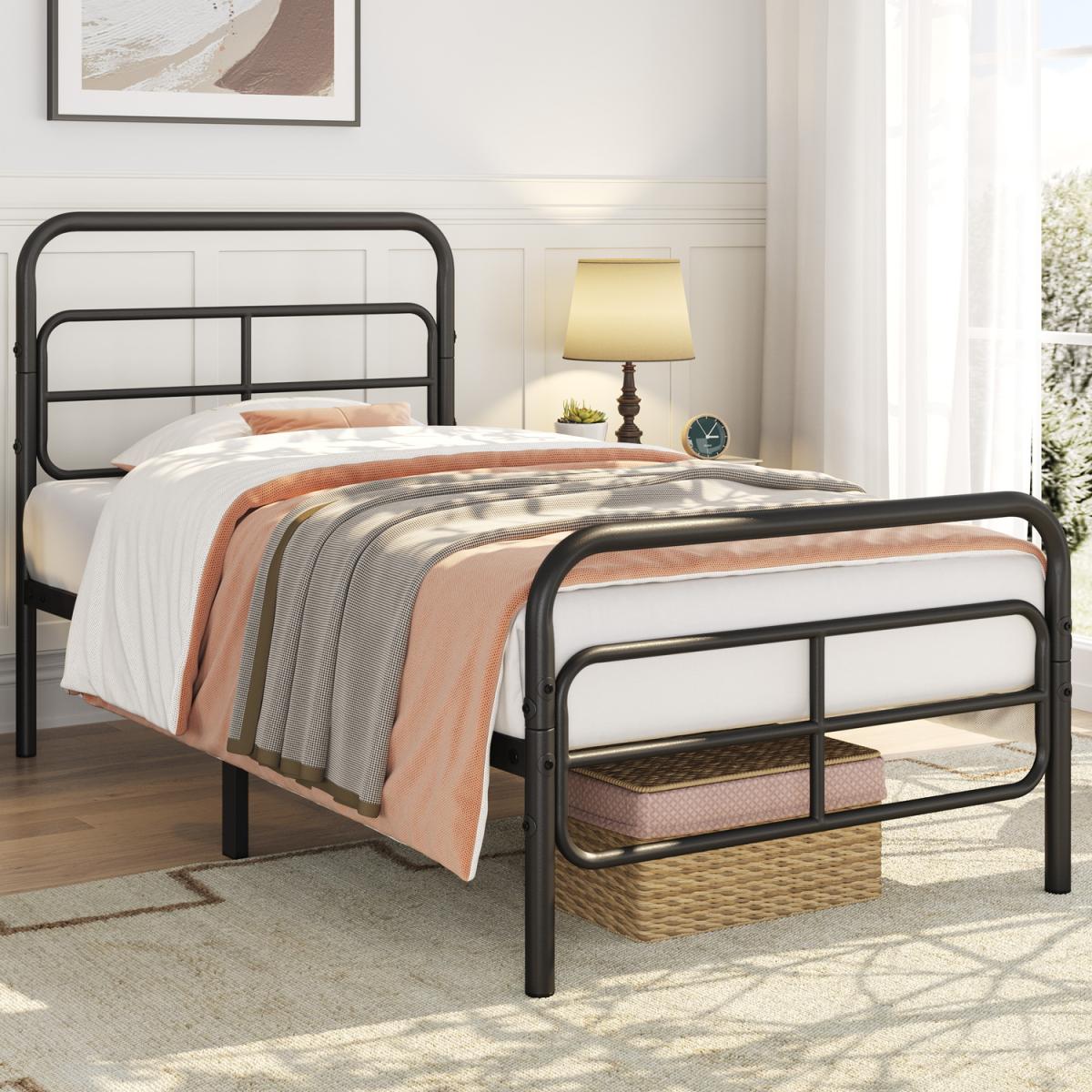 Make the right choice for your bedroom with this contemporary metal platform bed frame with headboard. Its designed with a streamlined silhouette, a simple geometric headboard and various-colored finishes, giving your bedroom a unique modern industrial vibe. The durable metal frame is completed with side rails, additional center rail and multiple support legs to provide you with a dependable and comfortable resting space. Even better, the 12 metal slats remove the need to buy an additional box spring. Thanks to its 32cm under-the-bed clearance, you can easily store those clothes and bedding that dont seem to have a storage spot elsewhere, ensuring your bedroom remains neat and well-organised. It's ideal for flats, houses, studios, dorms, and other spaces.