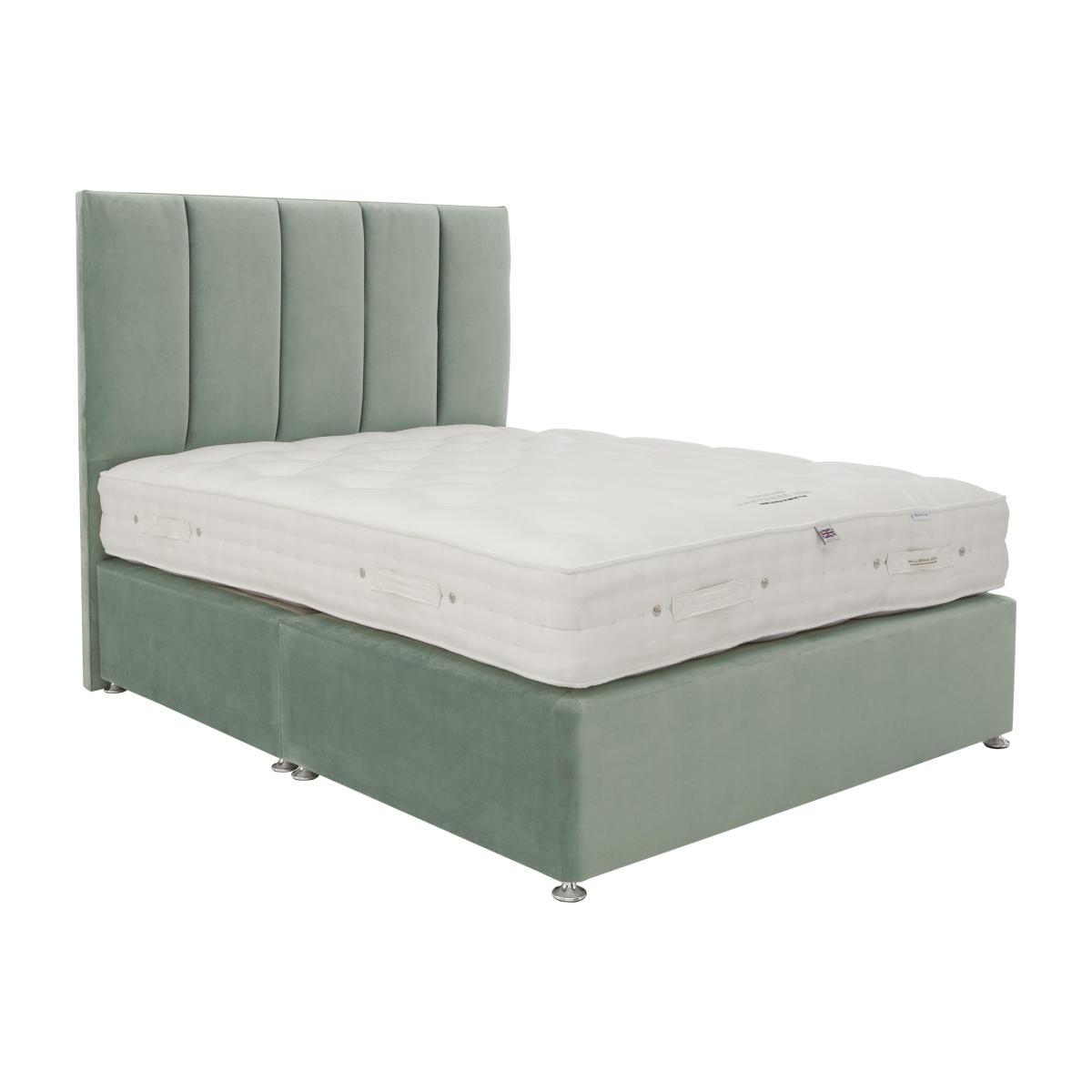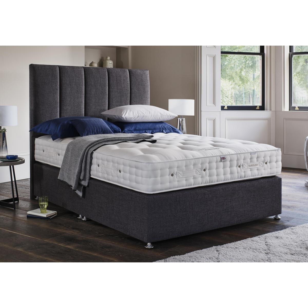 Beautifully handmade in Britain by Millbrook Beds, the great value Millbrook Beds Hampshire collection features a choice of luxurious mattresses and divan sets. Mattresses are available in a range of firmness ratings for more personalised sleeping comfort, and have layers of wonderful natural fillings that include Egyptian cotton, English cotton, Hampshire wool, silk and cashgora. Pocket sprung for extra support, the platform-top divan bases are available in a choice of upholstery fabrics and have optional storage drawers. The Millbrook Beds Hampshire collection is exclusively available at Furniture Village. Millbrook Beds is a National Bed Federation bed manufacturer of the year for 2018-2019. Handmade in Britain with cotton, Hampshire wool and silk. 4000 pocket springs in king size in a choice of firmness. Pocket-sprung divan base in a choice of fabrics. Beautifully handcrafted in Britain, the Millbrook Beds Hampshire 4000 divan set is a luxurious choice and is, unusually, available in a wide choice of comfort ratings so you can find the one that’s perfect for you. The fabulous mattress is 28 cm deep and has 4000 pocket springs in king size, layered with natural Egyptian cotton, English cotton, Hampshire wool and silk. It’s hand taped, hand tufted and finished with cotton viscose cover. Eight handles make turning and rotating easy. The platform-top, firm-edge divan base has 1000 pocket springs in king size, so it’s very supportive. It’s offered with optional storage drawers, available in a range of configurations. For the perfect finishing touch, pair this divan set with the Millbrook Beds Alton floor standing headboard. The great value Millbrook Beds Hampshire 4000 divan set is part of the Millbrook Beds Hampshire 4000 collection. Millbrook Beds is a National Bed Federation bed manufacturer of the year for 2018-2019. A Furniture Village exclusive. Headboard is an optional extra. Product images are representative. Find out more. Please note. The mattress should be aired for four hours after delivery to freshen and remove any aroma from storage. It may take time for your mattress to attain its full size once the springs have settled to the correct position. This is due to the mattress being upright during transit. Settlement of fillings and indentations caused by body weight compressing the fillings are natural and not considered defects. This can be minimised by regular rotating (unless yours is a dual tension mattress). We recommend the use of a mattress protector.