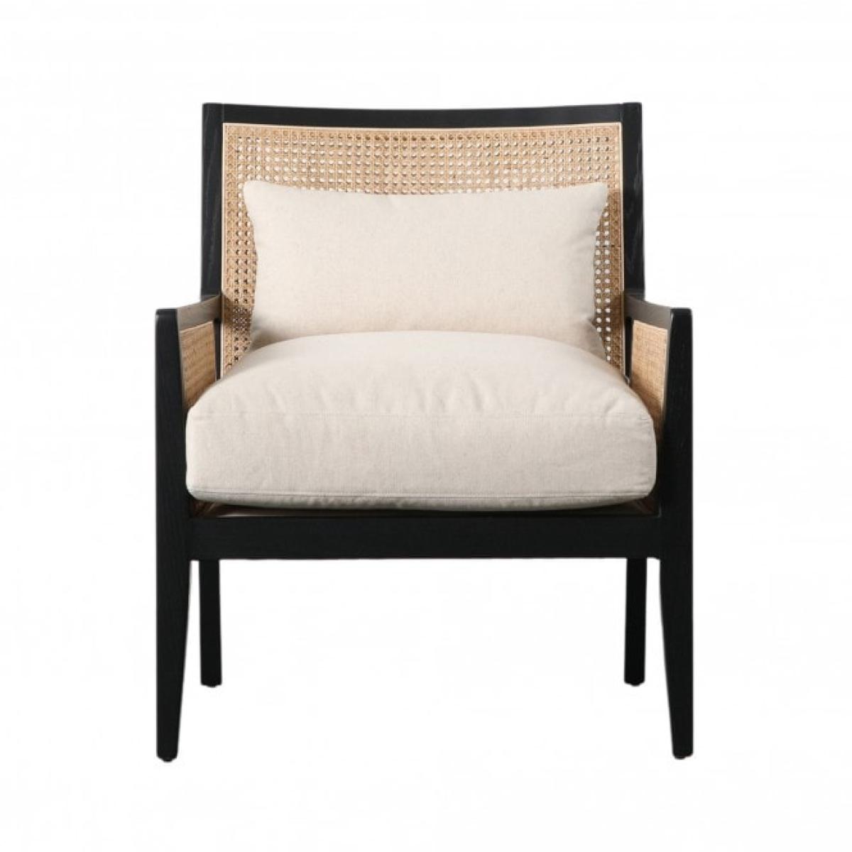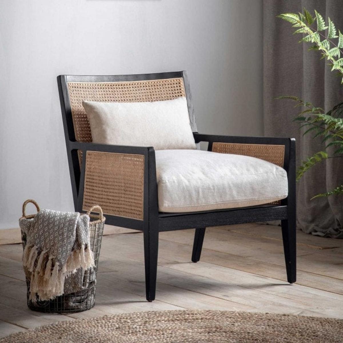 Lovely unusual armchair featuring a solid timber frame with a black finish which contrasts beautifully with the rattan and cushions. The seat of the chair is padded for extra comfort, with a loose seat cushion on top and matching bolster cushion. The sides and back of the seat are crafted from a double layer of rattan.