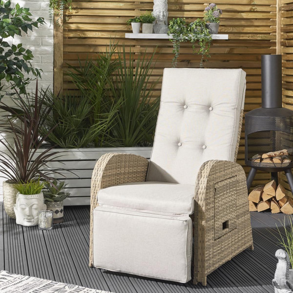 A lavish and highly designed recliner for your patio, the New Hampshire Reclining Chair is perfect for lazing back in the sun in pure comfort. Designed with a traditional reclining mechanism, the New Hampshire features thick, plush cushions across the back, seat, and footrest, making this chair extremely comfortable to relax in whether you are sitting or lying back. The New Hampshire also features a pop-up side table which is the perfect place to rest drinks, snacks, and books while you're sunbathing!With light cream cushions and pale brown wicker rattan, the New Hampshire will look absolutely delightful placed in a bright sunspot of your garden where, where it will bring a real bright and summery feel. With a frame made from aluminium, the New Hampshire Reclining chair is also lightweight but sturdy, helping it be your favourite place to lie back and soak up the sun year after year.