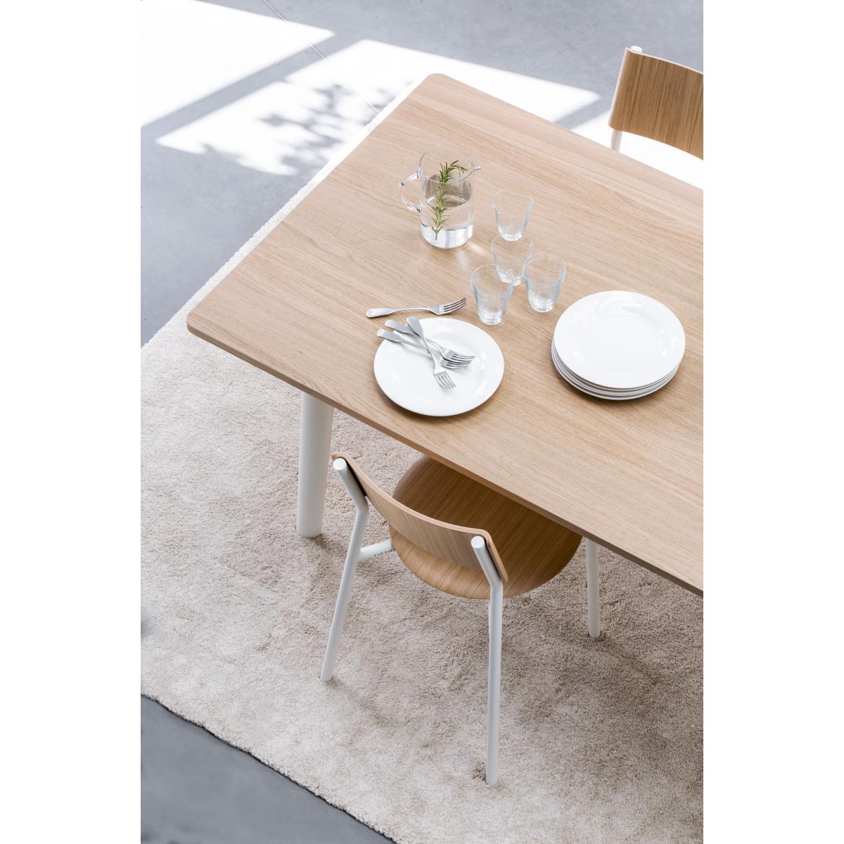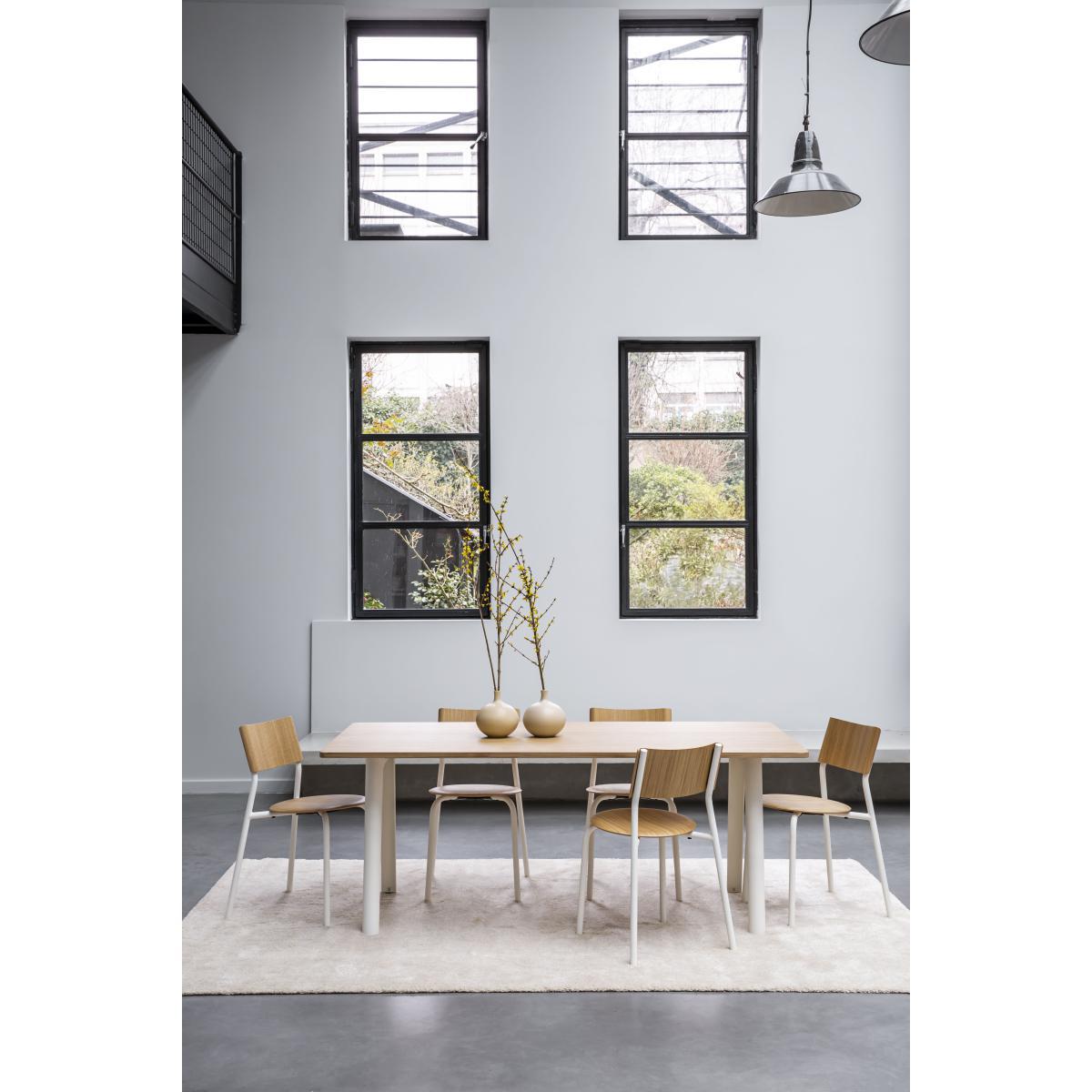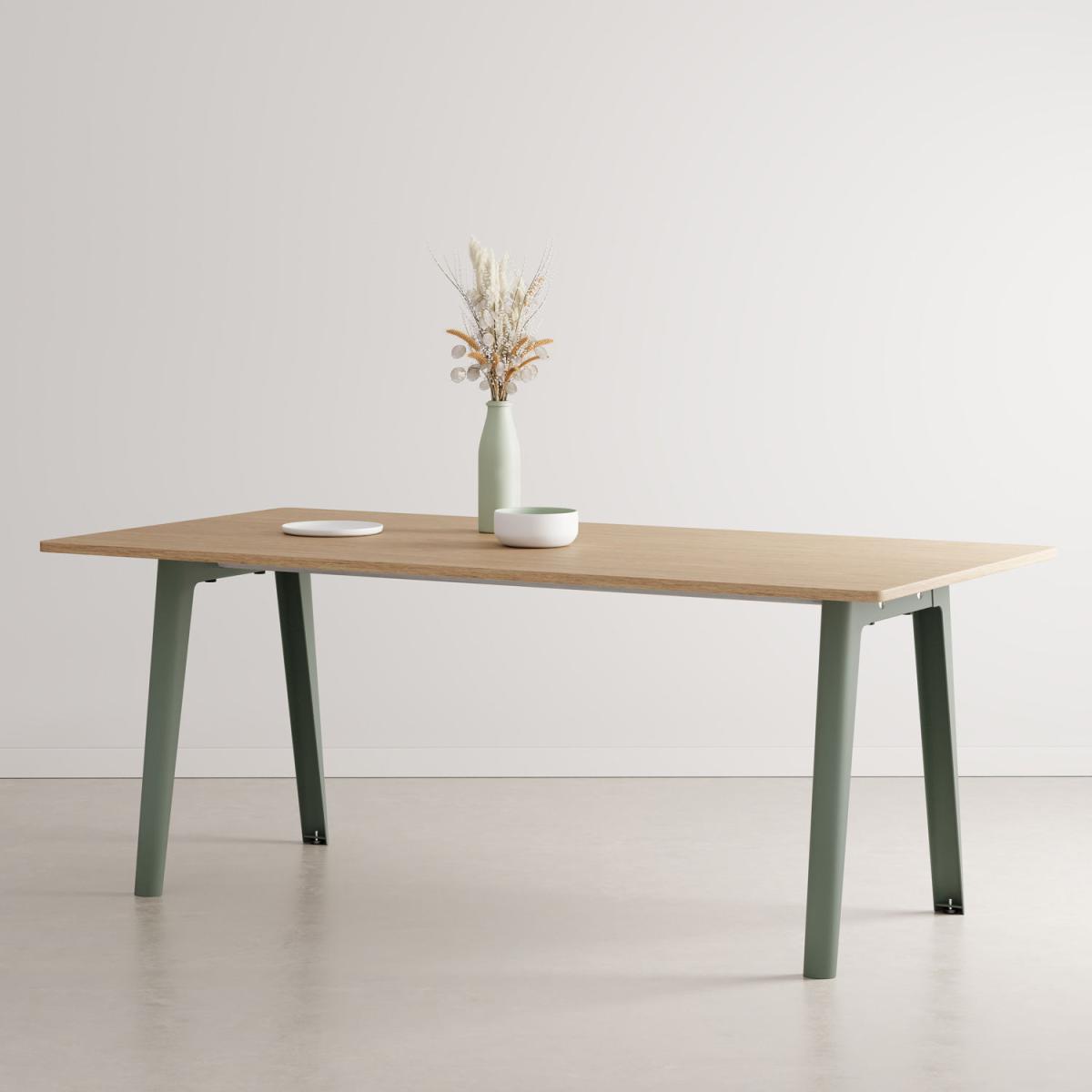 New Modern is a collection of tables and desks that’s 100% made in Europe, well thought out and produced to last. Like every project from the French item brand TIPTOE, New Modern is part of a sustainable, eco-design approach, taking care to control its impact throughout the product's life cycle. New Modern tables consist of just a few elements, all of them useful, very robust, easily separable and repairable if necessary. These tables consist of two powder-coated steel trestle legs into which are inserted two cylindrical stainless steel support beams. The top is simply screwed onto the legs. The tables are delivered flat to limit the environmental impact during storage and shipping (assembly is super-easy). The packaging is made of a minimum 80% recycled paper. The legs are made of steel, a material that’s both very strong and infinitely recyclable (it’s the most recycled material in the world). The top is available in different materials: eco-certified wood, recycled or laminate plastic. The oak plywood tops are made from wood from sustainably managed European forests (PEFC or FSC label). The top has a core made of solid, slatted fir veneered with natural oak and protected by a water-based varnish. The recycled plastic tops are made from waste: hundreds of yoghurt pots are needed to make a top. The plastic waste collected is reduced to chips and then pressed (without adding binder) to form the top. The white top is dotted with bursts of colour, echoing fragile ocean coral. The speckled pattern also evokes terrazzo, the star material of decoration. Each recycled plastic top is unique, the colour and patterns may vary, which is what makes it so charming. The different shapes and sizes of tops adapt to a wide range of contexts: dining table in a living room or kitchen, XXL table that can accommodate up to 12 people, individual desk in a private environment or even a large open space desk for several people. TIPTOE has chosen 100% European production alongside partners with excellent know-how. NEW MODERN wooden tops are made in Poland, the steel legs in Bulgaria while all the precision mechanical parts and assembly items come from family workshops in France near Chamonix. The final assembly is carried out in France in an ESAT, a medico-social establishment that works for the social and professional integration of people with disabilities.