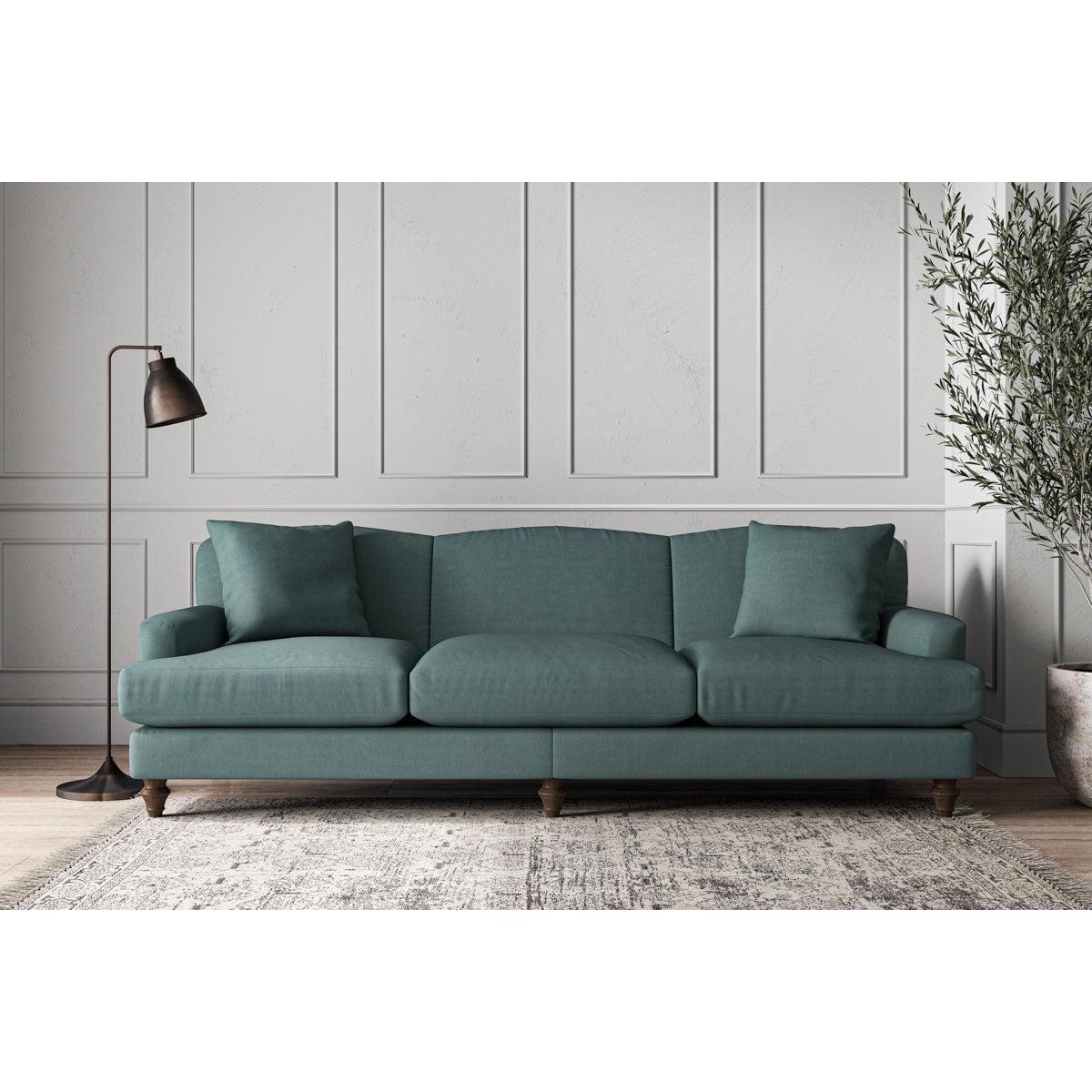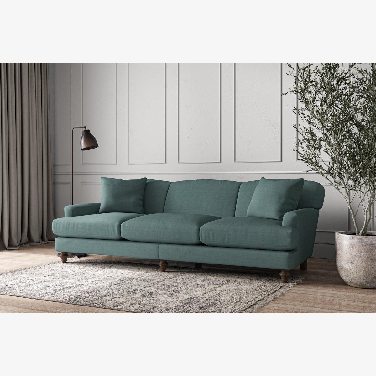 Our Deni super grand sofa is generously proportioned with deep, sumptuous seat cushions for luxurious comfort. Handcrafted from a solid hardwood frame with high-grade steel serpentine springs and foam and fibre wrap filling, this timeless collection celebrates the best of British quality and design. Fine details include in-built back cushions, hand-turned hardwood feet and a set of two scatter cushions for added comfort. Our upholstery fabrics are chosen for their style and quality, where all fabrics are FR treated for domestic upholstery ensuring peace of mind as well as meeting specialist UK furniture requirements. Our curated colour palette offers a variety of sophisticated muted shades. Please note, our white background cut-out photography is shown in Natural for shape and style reference. Fabric Swatch Ordering We recommend ordering fabric swatches before placing your order, giving you the chance to feel the fabric and see your colour choices within your own home. You can order up to 6 free fabric swatches by clicking here. Before placing your order, it's important to take the time to measure the space you intend to place your made-to-order furniture to ensure it fits properly. You can read more in our Sofa Buying Guide.