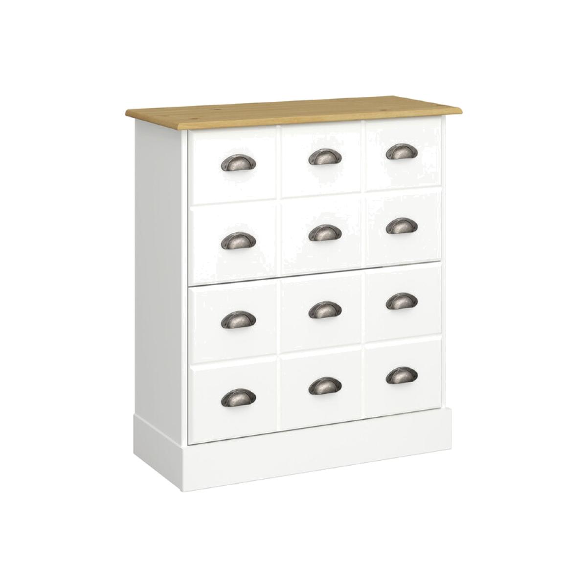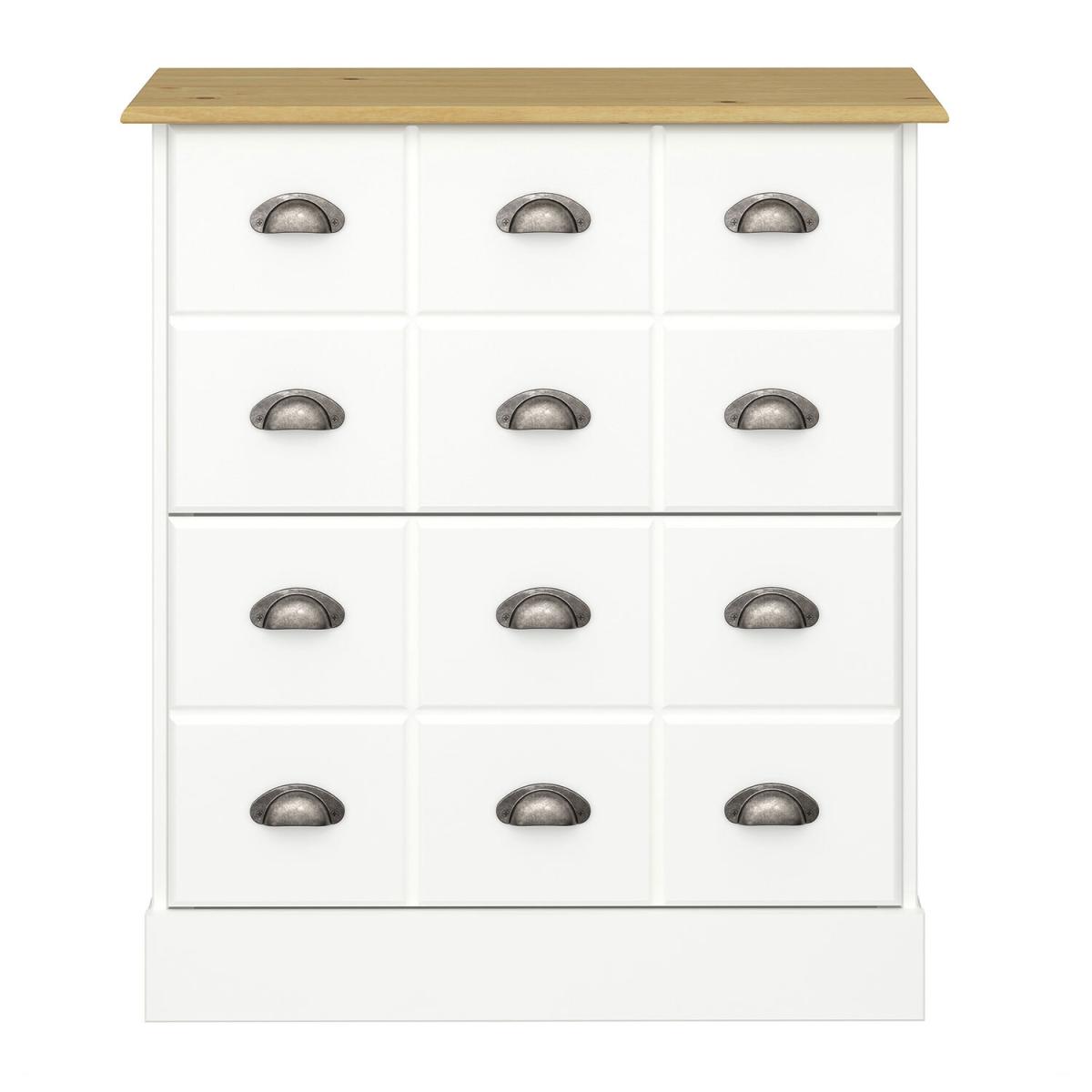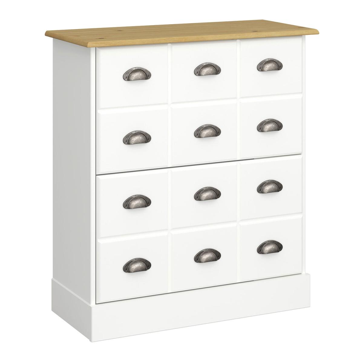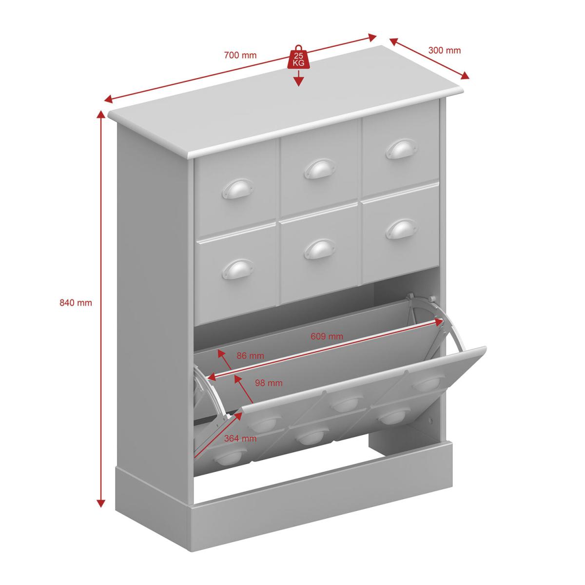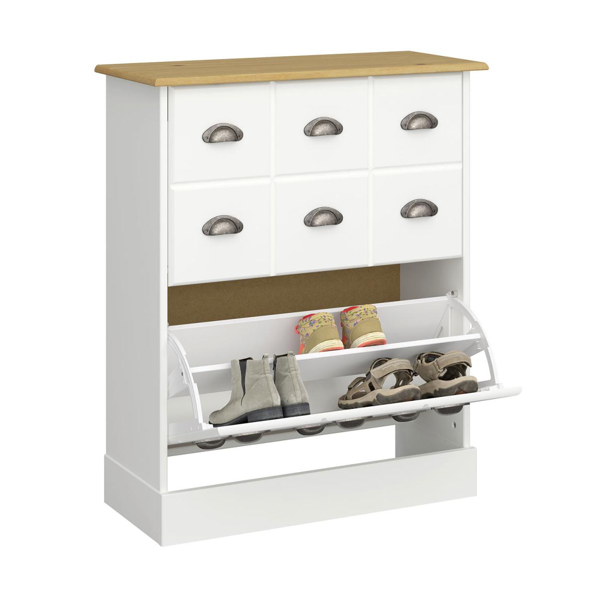 Pack your shoes away in style with this cleverly designed Nola Shoe Cabinet. Available in either black or white, both with pine coloured tops, this shoe cabinet will make a stylish addition to your hallway or porch area. With two fold-down drawers to store your shoes, this cabinet will help you keep your home looking neat and tidy. With beautiful stainless steel cup handles, this shoe cabinet will add a charming country feel to your home. As part of the Nola collection, you can perfectly match this cabinet with coordinating furniture items.
