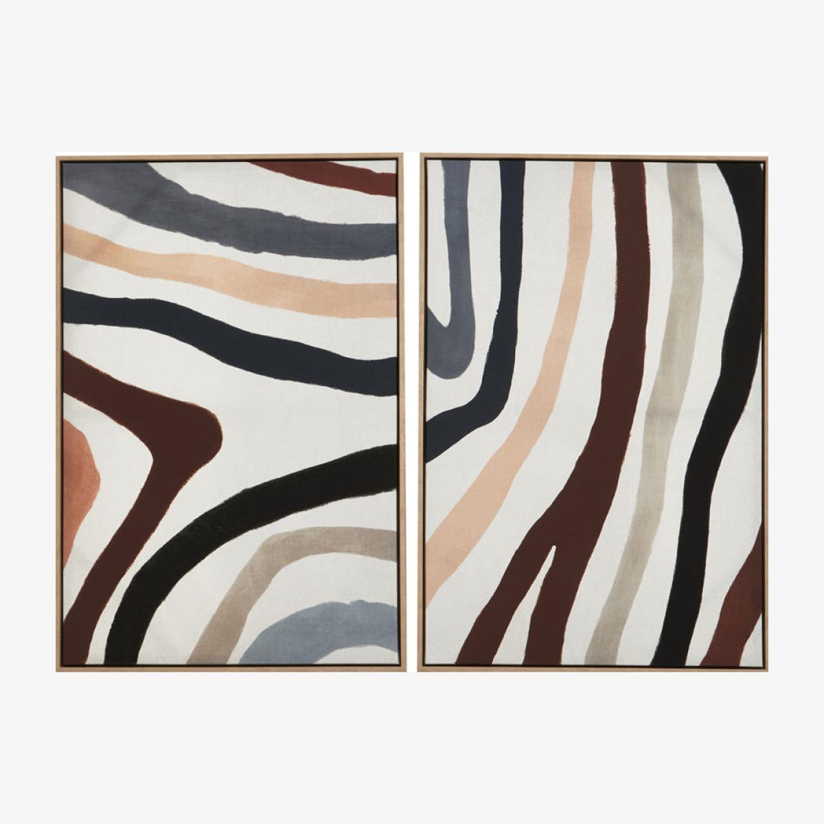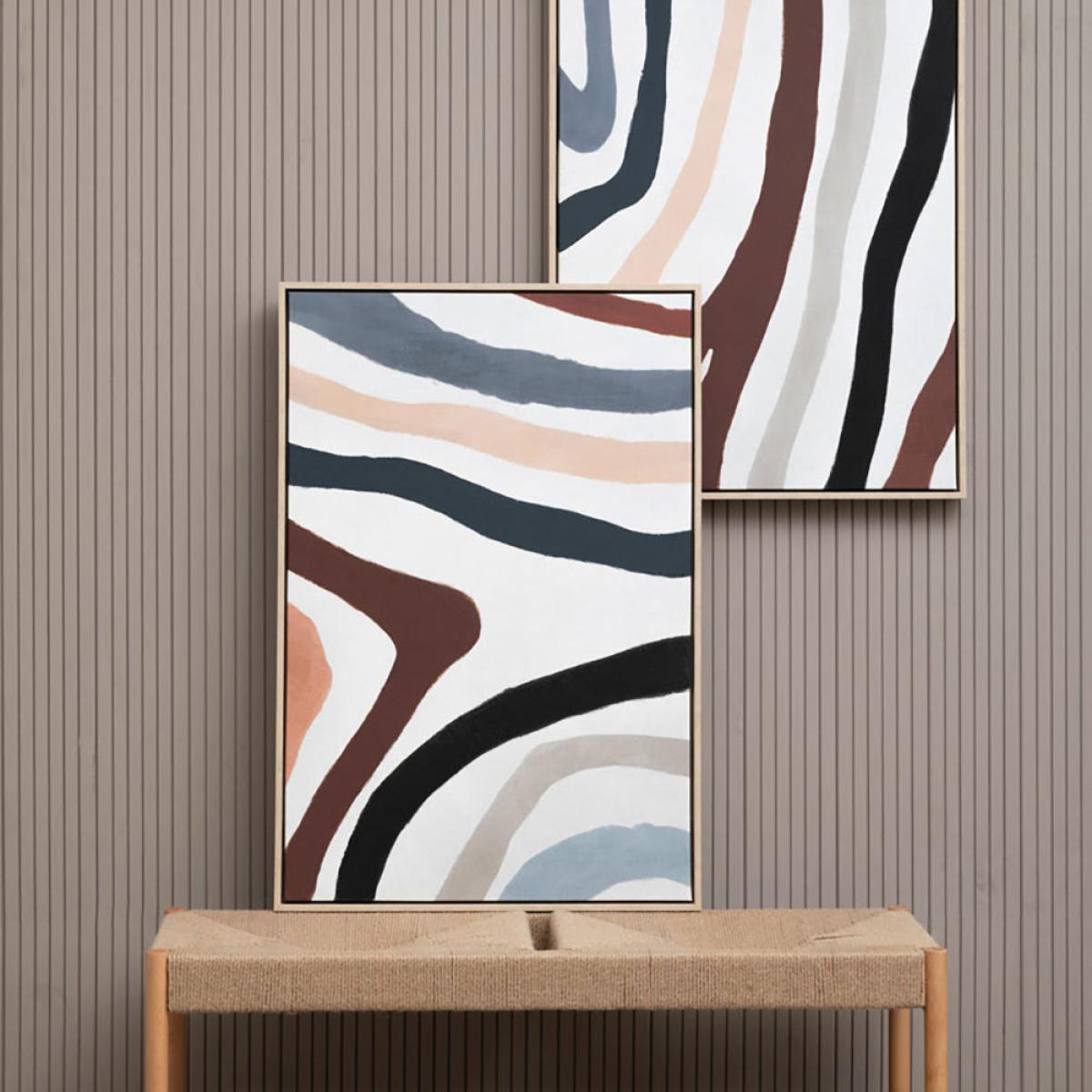 Create a bold look for your room with this modern wall art consisting of two pieces of colourful abstract patterns that will add lots of style and colour to your room. The art features swirls and stripes in shades of pink, grey and brown on a white background. The pieces have a light coloured wooden frame. This would be perfect for the lounge or dining room. Colour coordinate the art with throws, scatter cushions and rugs for a stylish look. The artwork measures 92cm long, 62.6cm wide and 4cm deep. These are a great size to fill your wall with colour. Dimensions: H: 92.6 x W: 62.6 x D: 4 cm Materials: Plastic, Textile, Wood Assembly Required: No Care Instructions: Clean with a soft cloth, do not use abrasive cleaners