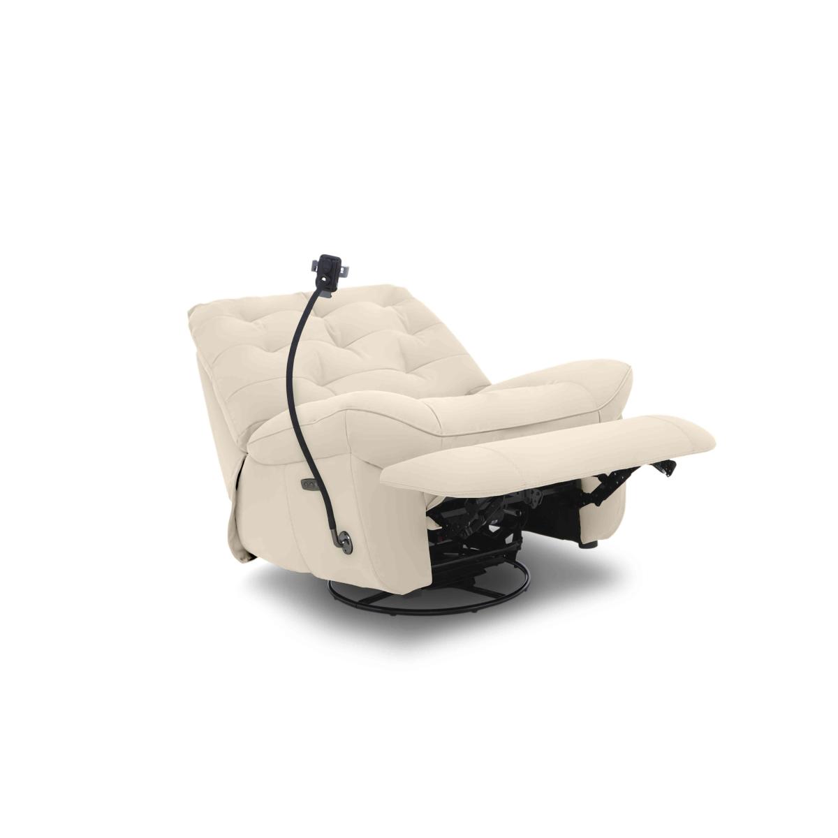 There’s relaxation – and there’s Ozzy-style relaxation. The incredible power reclining chairs in this collection take comfort to new heights and every direction. Each has a swivel base and independently adjustable power recliner and power elevating footrest so it’s easy to perfectly fine tune your comfort. The sprung seat and back with deep and luxurious cushioning promises comfort with support. And with a smartphone holder on a flexible arm plus built-in USB and USB-C charging, you can enjoy effortless hands-free media and phone time. Available in both 100% leather and high-quality fabric upholstery, the Ozzy range is exclusively available at Furniture Village. Enjoy hands-free phone viewing from the comfort of this ultra-cool swivel power recliner chair upholstered in beautiful leather. Relaxation has never been so stylish. Why you’ll love it There’s no end to this stylish power chair's comfort features. You’ll love the smartphone holder with flexible arm for hands-free viewing. The sprung seat and back feel fabulous. And the power recliner promises instant relaxation. Back recline and elevating footrest can be adjusted independently. With USB and USB-C ports for easy device charging. And, of course, it swivels. Cool curves are accentuated by the luxurious cushioning. Stylishly buttoned back cushion. In a huge choice of 100% leather upholstery colours to match any decor. Exclusive to Furniture Village. This leather swivel power recliner chair is part of our Ozzy range. What you need to know Medium comfort level. Seat suspension: no-sag spring. Seat cushioning: foam and fibre. Cushioning is fixed. Back suspension: rubber webbing. Back cushioning: fibre. Cushioning is fixed. Arm cushioning: foam and fibre. Please allow time for new recliners to ease. Minor gaps are necessary to ensure ease of recliner motion and may be exaggerated depending on floor type. Some fabrics can show wear on areas of more use or in direct sunlight. Clean regularly using a soft brush or vacuum with the curtain attachment. Deal with any spills promptly. Professional cleaning advised for oil- and grease-based stains. Please read our upholstery care guide for more advice.