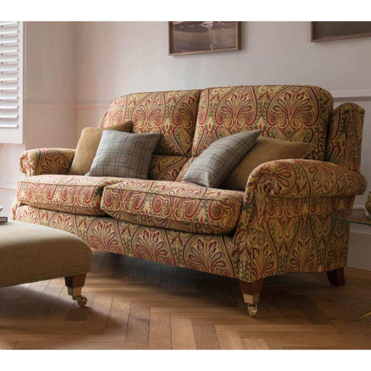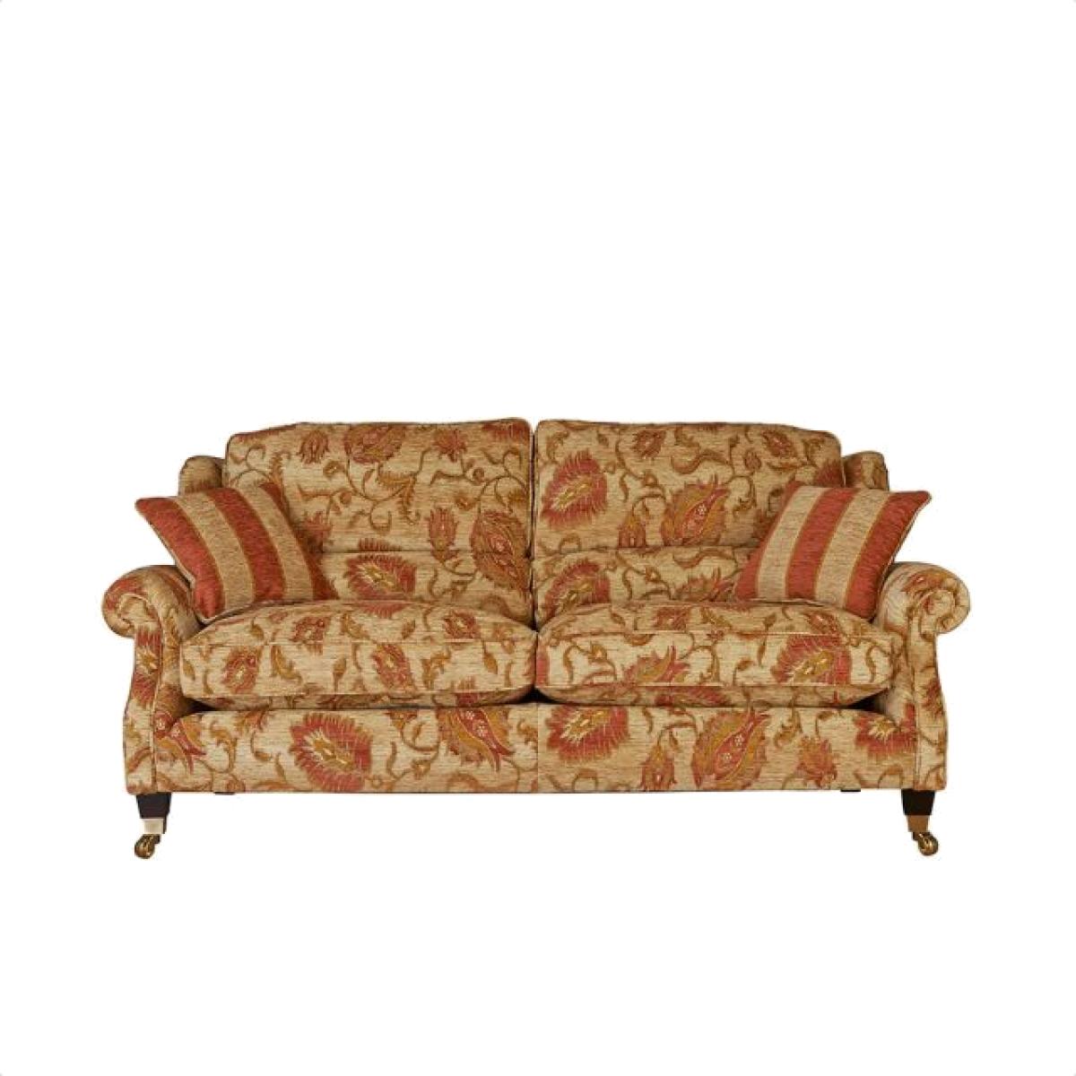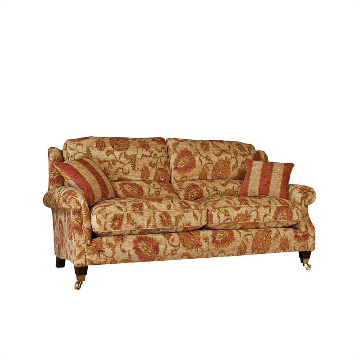 The Henley large 2 Seater form the Parker Knoll Classic collection will add a touch of elegance to your living space. The stylish traditional sofa has beautiful scroll arms and wing sides with a formal back for support. Manufactured in the UK by skilled master craftsmen, using time-honoured traditional methods. Exclusively developed technology now allows you to visualise your chosen material on your parker knoll sofa from the comfort of your own home, making it easier than ever before to decide on your sofa of choice. Design your own Parker Knoll sofa by clicking here. The Henely is available with a choice of Encore Fibre or Easycare Foam seat interiors. The Encore Fibre seating is soft and luxurious with the benefit of not needed to plump your seat cushions as often, the seat has been constructed of a foam core for support with a pocket duvet wrapped around it for that comfy sit. To keep your Encore set interior in the good condition flip and swap over your cushions twice a week. The Easycare Foam offers top levels of comfort and support, that provides a firmer sit. The Easycare seating takes minimal effort to maintain simply flip and swap over your cushions twice a week, to keep the cushions at their best. Hardwood frame made using specially selected wood A choice of Encore or Easycare seat interior A choice of feet - choose to have castors or no castor and select from the three wood colours 2 x Scatter cushions included - with a choice of fibre or feather fill 25 year frame guarantee for peace of mind Made in the UK Dimensions:Overall Dimensions - 208cm (W) x 106cm (D) x 102cm (H)Seat Dimensions - 164cm (W) x 55m (D) x 54cm (H) Fabric shown in image - Grade C Cuba Floral Sand Please bear in mind that all screens vary in colour reproduction and whilst every effort has been made to display the colour as accurately as possible it is for guidance only.