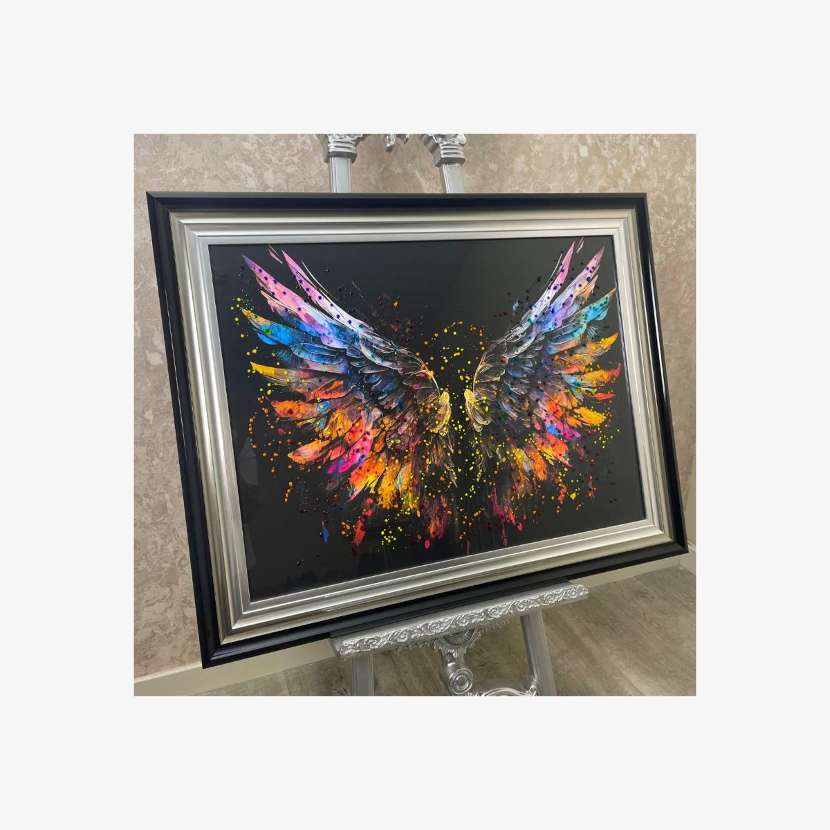 Rainbow angel wings wall art, featuring a watercolour effect, sprayed liquid embellishments and a black and silver bevelled frame A vibrant and captivating piece that brings a splash of color and inspiration to any room, this artwork features a stunning pair of angel wings rendered in a watercolor effect, showcasing a beautiful spectrum of rainbow hues. The delicate blend of colours creates a dreamy and ethereal look, perfect for uplifting your space. Enhancing the visual appeal are sprayed liquid embellishments, adding texture and a dynamic touch to the piece. The artwork is elegantly framed in a black and silver beveled frame, providing a sophisticated and contemporary finish that complements the vibrant colors of the wings. Rainbow angel wings wall art, featuring a watercolour effect, sprayed liquid embellishments and a black and silver bevelled frame A vibrant and captivating piece that brings a splash of color and inspiration to any room, this artwork features a stunning pair of angel wings rendered in a watercolor effect, showcasing a beautiful spectrum of rainbow hues. The delicate blend of colours creates a dreamy and ethereal look, perfect for uplifting your space. Enhancing the visual appeal are sprayed liquid embellishments, adding texture and a dynamic touch to the piece. The artwork is elegantly framed in a black and silver beveled frame, providing a sophisticated and contemporary finish that complements the vibrant colors of the wings.