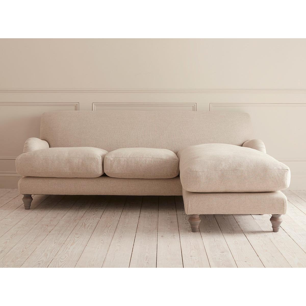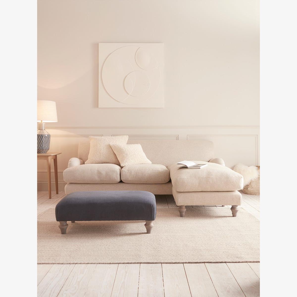 The Reine Chaise Sofa features all the beauty of the two and three seater sofas with that added comfort and adaptability of a chaise end which allows your to stretch out in style. The sofa has a deep feather and foam filled base making it a joy to sink into and the legs are in a limewashed oak finish. Your chaise sofa will be upholstered by hand, especially for you and is available as a right or left facing option. The range also includes two and three seater sofas, a loveseat, an ottoman and an armchair. Pictured here in our Oat Cotton Linen our Reine collection can be upholstered in a choice of 34 distinctive shades and six fabrics to suit your style. Read our Upholstery FAQs View our full Upholstery Terms and Conditions