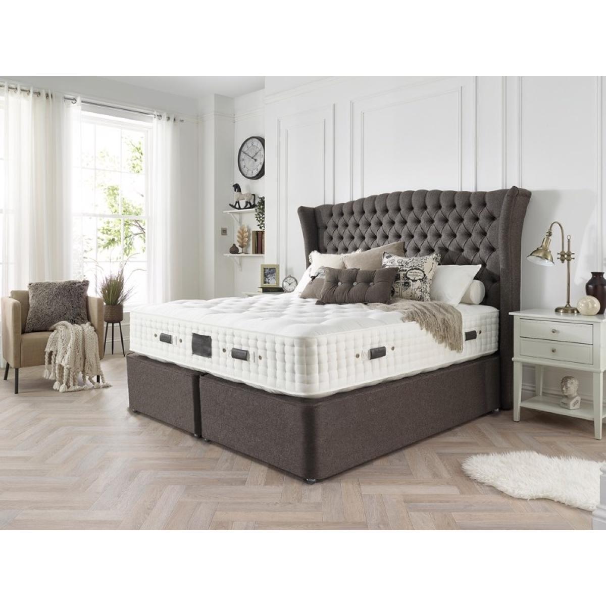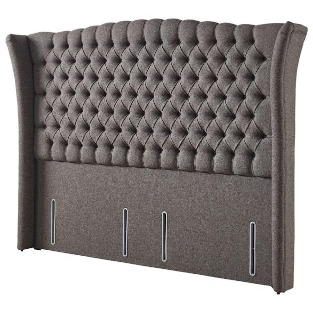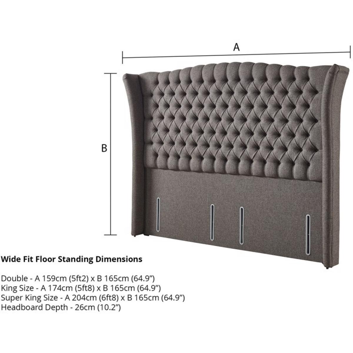 The Relyon Curzon Statement Full Height Floor Standing Headboard seamlessly combines opulence with sophistication, creating a focal point that transforms any bedroom into a sanctuary of luxury. Crafted with meticulous attention to detail, the stunning winged design exudes grandeur. Gracefully extending on either side, with a timeless Chesterfield design evokes a sense of majesty. Adorned with sumptuous fabric, further enhances the regal aura, and invites you to indulge in the lap of luxury. Choose from a rich array of colours and textures to customise this headboard to complete the look of your living space. Features: Wide Fit Floor Standing - The Wide fit design extends from the height of the headboard to the floor and the width is slightly wider either side of the mattress and divan. This gives extra support and stability to the headboard. Holders of the Manufacturing Guild Mark showing their dedication to quality, craftmanship, and durability A grand statement piece that showcases sophistication through regal wings and quality design FSC certified timber - the mark of responsible forestry Available in a wide range of Relyon fabrics and colours Free 10 year guarantee for total peace of mind Dimensions: Double Size - W 159cm (5ft2) x H 165cm (64.9’’) x D 26cm (10.2’’) King Size - W 174cm (5ft8) x H 165cm (64.9’’) x D 26cm (10.2’’) Super King Size - W 204cm (6ft8) x H 165cm (64.9’’) x D 26cm (10.2’’) All screens vary in colour reproduction and whilst every effort has been made to display the colour as accurately as possible it is for guidance only.