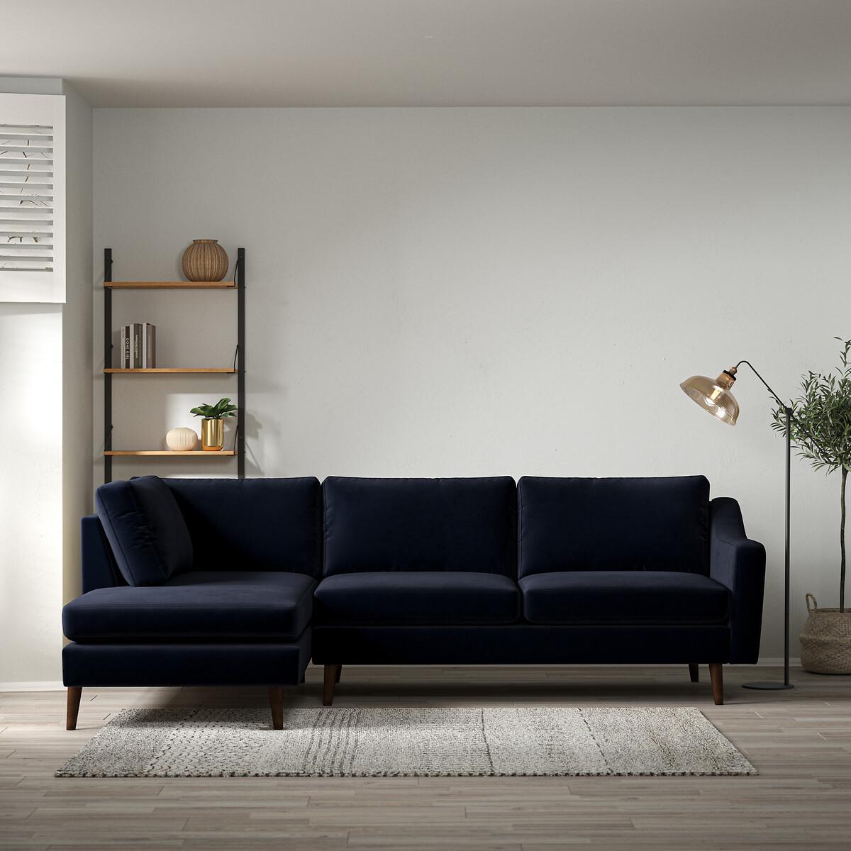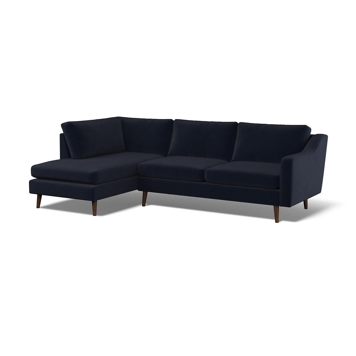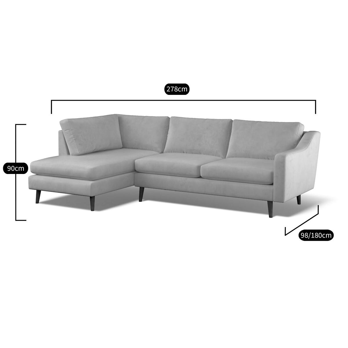 Put your feet up and S-T-R-E-T-C-H. Sloped arms and tapered wooden legs all make the Rosa a perfect example of Mid-century modern style. Reversible cushions with no plumping required, and a robust, tailored finish make this sofa perfect for family life. Choose from our soft brushed fabric for ultimate cosiness, soft woven for a textured look or velvet for luxe living. The Rosa is available in multiple sizes, including an armchair, a snuggle chair, a 2 seater, a 3 seater and a corner chaise sofa (both left and right facing). The Rosa is also available with a buttoned back. Product details• Velvet - An elegant velvet with a dense and matte finish, perfect for those wanting a rich and luxurious look. A flat finish pile makes it difficult for the material to snag – ideal if you live with pets and sure to prove durable for years to come. Check it's right for you - order a FREE swatch above.• Created with medium density foam fillings for a sofa with a level of comfort suitable for most. • Foam filled seats provide great support without compromising on comfort, and require little maintenance to keep their shape, ensuring your sofa looks as good as it does the day you welcomed it into your living room.• Fibre backs provide extra softness and give you that "sink in" feeling.• Just flip to freshen up - both the seat cushions and back cushions are fully reversible so it's easy to keep your sofa looking its best.• Both seat and back covers are removable (zip fastening)• FSC® solid beech hardwood frame - made of wood from responsibly managed forests that provide environmental, social and economic benefits.• Tapered feet crafted entirely from solid wood ensure durability and stability.• Removable feet.• Lovingly handmade in the UK.All our made to order sofas are carefully manufactured in the UK.Each hardwood frame is dowelled, glued, and screwed before being paired with the finest fabrics and fillings. And it doesn't stop there - for customer peace of mind and safety, all frames and fabrics are rigorously examined, inspected, and tested to the highest standards. All filling material(s) and covering fabric(s) meet the requirements for resistance to cigarette and match ignition in the 1988 safety regulations. This sofa comes with a 3 year manufacturer warranty from date of delivery (subject to terms and conditions)Product composition• Fabric - Velvet (100% polyester)• Seat Fillings - Foam and fibre• Back Fillings - Fibre• Frame - Beech Hardwood (FSC), OSB (UK origin, FSC)• Feet - Solid Wood. Product Dimensions Overall width: 278 cm. Overall depth: 98/180cm. Overall height: 90 cm. Seat height: 50 cm. Seat depth: 58 cm. Seat width between the arms: 257 cm. Back height (from base): 72 cm. Back height (from seat): 45 cm. Arm height (from floor): 66 cm. Arm height (from seat): 16 cm Clearance to floor (leg height): 18 cm. Please remember to measure your available space before ordering to be sure your sofa will fit. Don't forget to measure accessways and corners, and consider any obstacles. Package DimensionsL18. 1 cm x W155 cm x H73 cm, Weight 86 kg. This product will be dispatched by one of our trusted suppliers. You’ll be contacted by their selected courier about your delivery. Your product will be delivered to your room of choice. Feet may be assembled on arrival. BELFI01