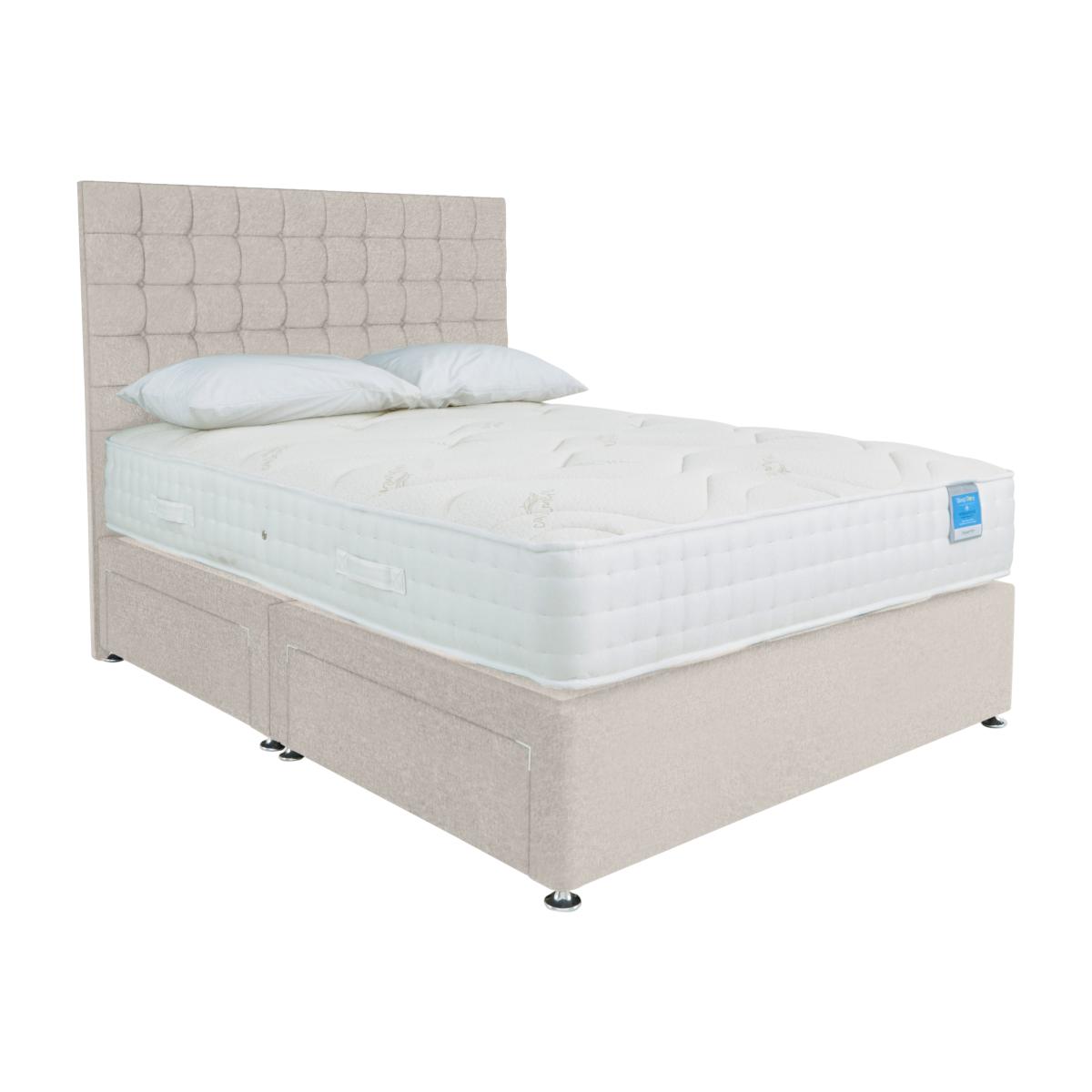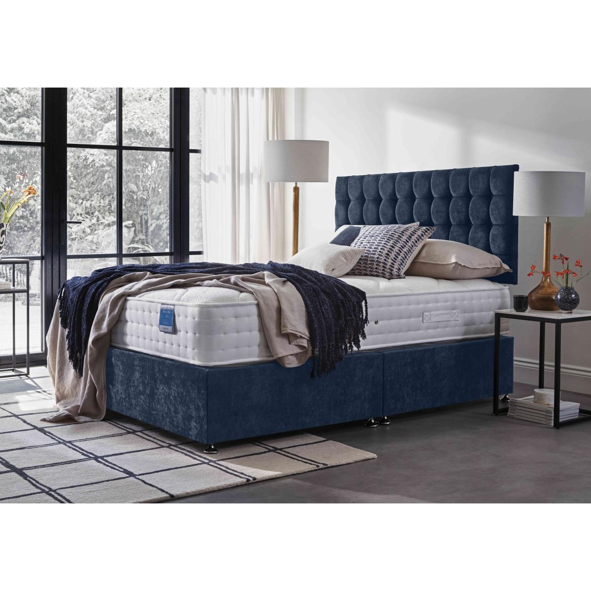 Extra firm pocket spring mattress plus extra stylish divan base. Made by Highgrove for Furniture Village, this Sleep Story divan set is yours at a great-value price. Short on storage space? Opt for built-in drawers. Why you'll love it High-quality extra-firm mattress and divan base at an amazing price. Mattress offers extra support for a better night’s sleep. With 1000 supportive pocket springs in king size. Ultra-soft cashmere blend mattress cover. Hypoallergenic. Platform-top base comes with your choice of storage drawer arrangement. Choose from a wide selection of upholstery fabrics. Made in the UK by Highgrove and exclusive to Furniture Village. The Sleep Story Deluxe Firm range includes a mattress and ottoman divan sets. What you need to know Headboard is an optional extra. Mattress type: Pocket spring and reflex foam. Depth: 25.5 cm. Firmness: Extra firm. Springs: 1000 pocket springs in king size. Pillow top: No. Fillings: 5 cm reflex foam. Cover:Cashmere blend. Requires turning: Yes. Base type: Platform top with optional drawer storage. Sizes: Small single, single, small double, double, king and super king. Mattress care:Air for 4 hours before using to remove any odour. Allow at least 4 hours for springs to settle and for mattress to attain its full size. Indentations caused by settlement of fillings or body weight are normal and are not considered defects. If used on a slatted bed frame, the space between slats must be no wider than 7.5 cm. Spaces wider than this may cause excess dipping of the mattress and invalidate the guarantee. Always use a mattress protector. Rotate regularly. Divan base care: Clean upholstery weekly using a soft brush or vacuum with the curtain attachment. Professional cleaning advised for oil- and grease-based stains. Please note: Divan base is supplied in two halves for small double, double, king and super king sizes.