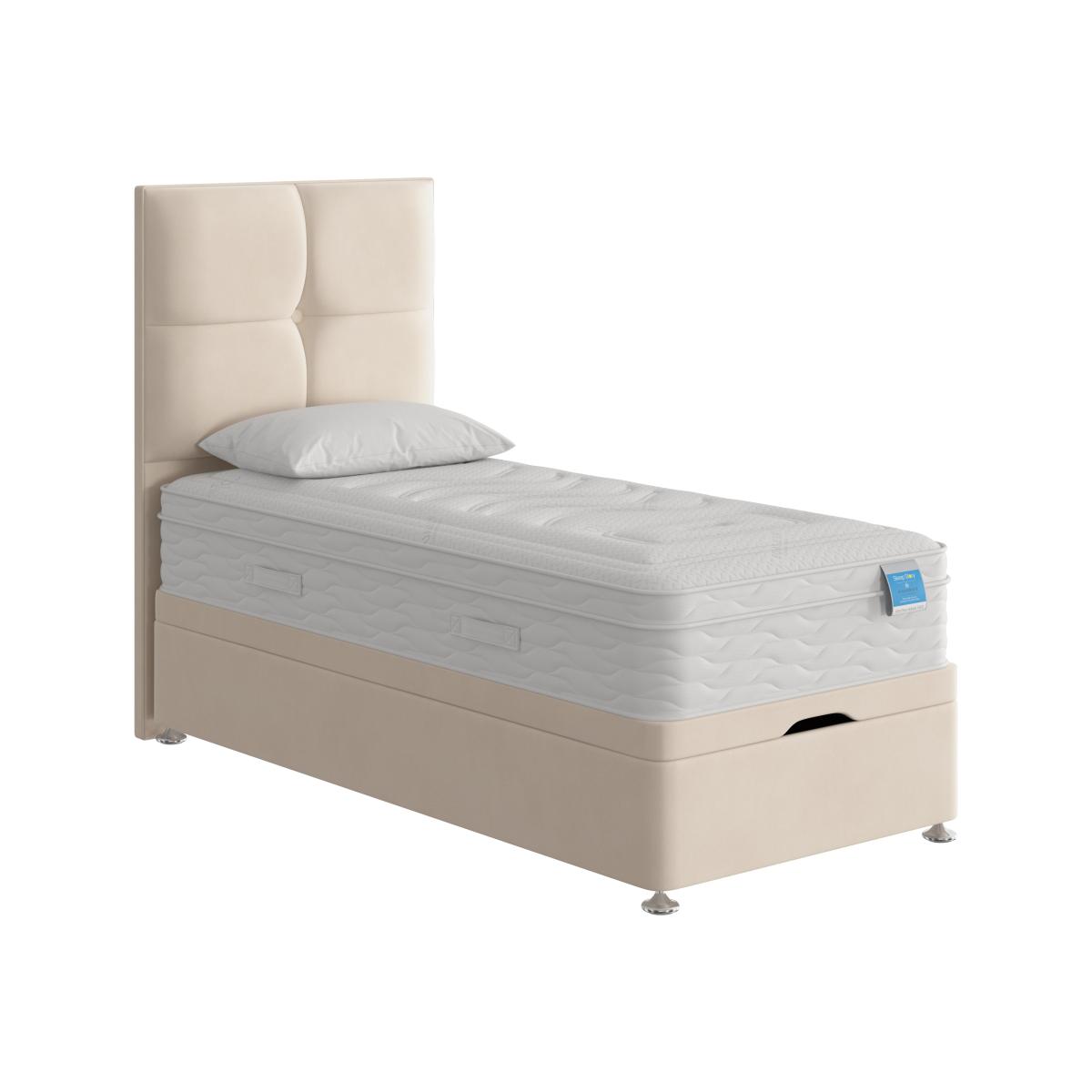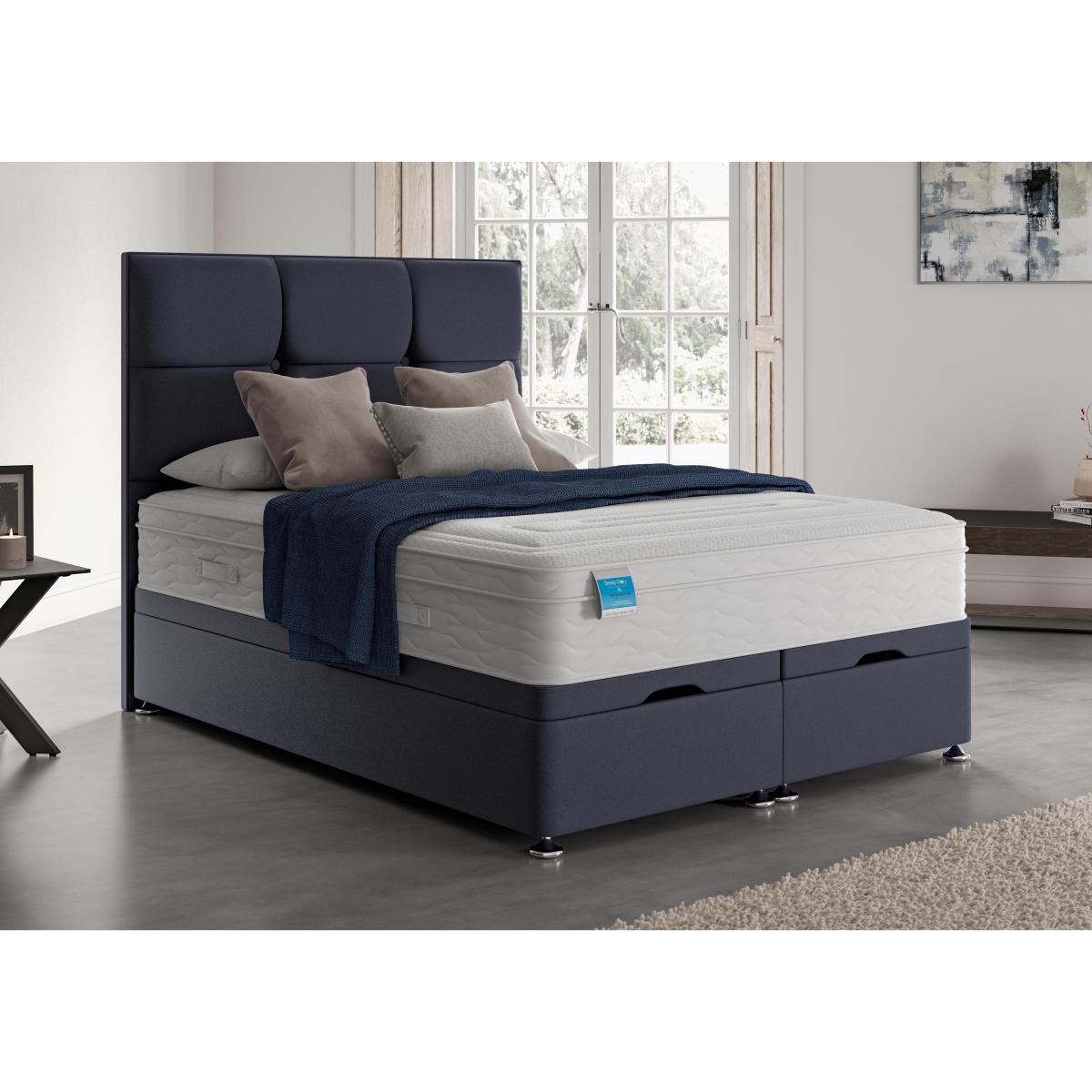Imagine drifting off to sleep on a beautifully crafted pocket spring mattress layered with natural fillings of cashmere, cotton, wool and silk. The medium-feel Sleep Story Natural Luxury Hybrid mattress combines perfect support with the sumptuous cushioning of natural materials – and it’s hypoallergenic too. Made especially for Furniture Village by Highgrove, the collection includes mattresses in every size from small single to super king as well as a wide choice of divan sets with built-in drawer and ottoman storage upholstered in gorgeous fabrics. The excellent-value Sleep Story Natural Luxury Hybrid range is only available at Furniture Village. Here’s a divan set that ticks all the boxes. The hybrid pocket spring and gel foam mattress is both supportive and cooling, and the ottoman divan base is stylish and practical. A great-value price, too. Why you'll love it. Great-value ottoman divan set with pocket spring and gel foam mattress. Mattress offers a relaxing combination of support plus softness. With 1400 pocket springs in king size for pressure-relief and spinal alignment. Gel foam layer provides cushioning comfort without heat build-up. Hypoallergenic. Platform-top base has a useful end-opening ottoman storage compartment. Wide selection of on-trend upholstery fabrics. Made in the UK by Highgrove and exclusive to Furniture Village. The Sleep Story Gel Plus Hybrid range includes a mattress and ottoman divan sets. What you need to know. Headboard is an optional extra. Mattress type: Pocket spring and gel foam. Depth: 25.5 cm. Firmness: Medium. Springs: 1400 pocket springs in king size. Pillow top: No. Fillings: 7.5 cm gel, 18 cm fibre. Cover: Micro Tencel and polyester. Requires turning: No. Base type: Platform top with end-opening ottoman storage. Sizes: Small single, single, small double, double, king and super king. Mattress care: Air for 4 hours before using to remove any odour. Allow at least 4 hours for springs to settle and for mattress to attain its full size. Indentations caused by settlement of fillings or body weight are normal and are not considered defects. If used on a slatted bed frame, the space between slats must be no wider than 7.5 cm. Spaces wider than this may cause excess dipping of the mattress and invalidate the guarantee. Always use a mattress protector. Rotate regularly. Divan base care: Clean upholstery weekly using a soft brush or vacuum with the curtain attachment. Professional cleaning advised for oil- and grease-based stains. Please note: Divan base is supplied in two halves for small double, double, king and super king sizes.