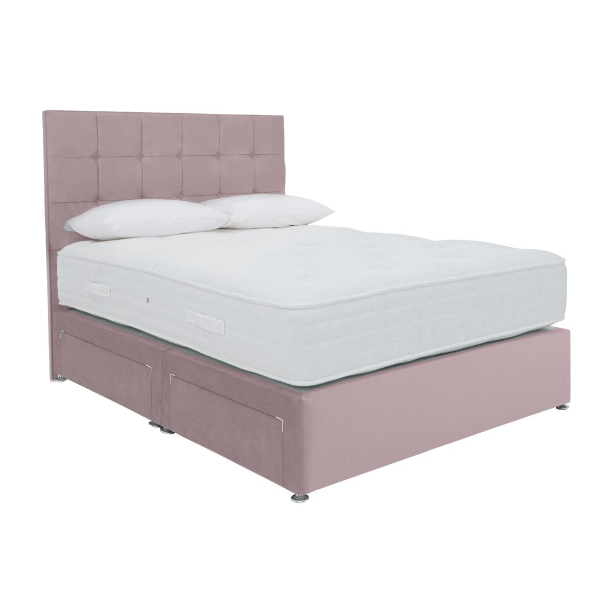 The Sleep Story by Highgrove Luxury 2000 range delivers luxury comfort at an impressively affordable price. Inside the hypoallergenic mattress is a luxurious blend of natural wool, cotton, silk and cashmere for sumptuous comfort and 2000 pocket springs for total body support. This design encourages correct spinal alignment and relieves pressure, so it’s ideal for those looking for more support from their mattress. For additional comfort, the mattress is finished with a super-soft and breathable Tencel™ cover which keeps you cool and comfortable through the night. A range of divan bases are available in a selection of contemporary colours and come with a variety of space-saving storage options. Expertly handcrafted in the UK exclusively for Furniture Village. This oh-so-luxurious (yet very affordable) mattress comes complete with a stylish storage divan base. The pocket spring and natural fillings combination gives you medium support with a sumptuous feel. Why you'll love it Divan set promises luxurious medium-feel comfort at a very affordable price. Pocket spring mattress has natural fillings for support with a touch of softness. 2000 individually pocketed springs in king size provide excellent pressure relief. Sumptuous layers of wool, cotton, silk and cashmere. Hypoallergenic. Platform-top base with a choice of optional storage drawers. Choose from a wide selection of beautiful upholstery fabrics. Made in the UK by Highgrove and exclusive to Furniture Village. The Sleep Story Luxury 2000 range also includes a mattress and ottoman divan sets. What you need to know Headboard is an optional extra. Mattress type: Pocket spring and natural fillings. Depth: 28 cm. Firmness: Medium. Springs: 2000 pocket springs in king size. Pillow top: No. Fillings: Wool, cotton, silk and cashmere. Cover:Breathable TencelT M. Requires turning: No. Base type: Platform top with optional drawer storage. Sizes: Small single, single, small double, double, king and super king. Mattress care:Air for 4 hours before using to remove any odour. Allow at least 4 hours for springs to settle and for mattress to attain its full size. Indentations caused by settlement of fillings or body weight are normal and are not considered defects. If used on a slatted bed frame, the space between slats must be no wider than 7.5 cm. Spaces wider than this may cause excess dipping of the mattress and invalidate the guarantee. Always use a mattress protector. Rotate regularly. Divan base care: Clean upholstery weekly using a soft brush or vacuum with the curtain attachment. Professional cleaning advised for oil- and grease-based stains. Please note: Divan base is supplied in two halves for small double, double, king and super king sizes.