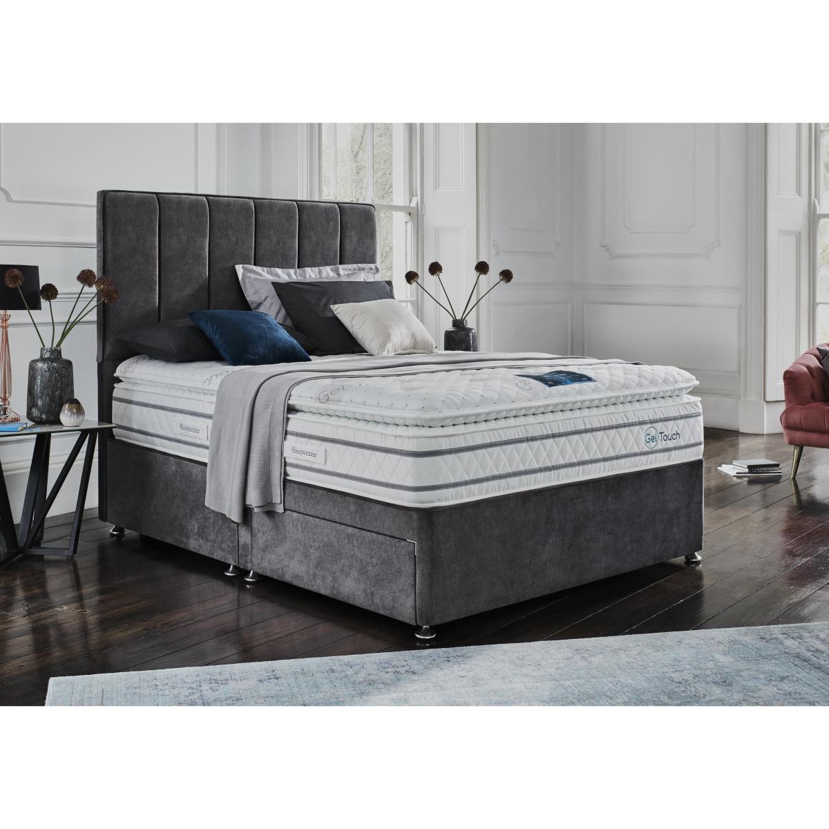 Sleep in luxurious comfort and stay cool all night long with the fantastic Sleepeezee Gel Touch 5000 collection. Beautifully handcrafted, the innovative mattress offer truly cooling comfort and features a special cool-touch mattress cover plus a triple-depth layer of Sleepeezee’s StayCool™ gel, a pressure-sensitive foam that conforms to your body and helps regulate body temperature for more restful sleep. This medium feel mattress has two tiers of traditional and mini pocket springs and pairs beautifully with the collection’s upholstered divan base, available with a choice of useful built in drawers and side-lift ottoman storage options. The Sleepeezee Gel Touch 5000 collection is handcrafted in Britain and exclusively available at Furniture Village. Sleepeezee holds a Royal Warrant from HRH The Prince of Wales. Ultimate cooling mattress with StayCool™ gel and 5200 pocket springs in king size. Divan base in a wide choice of fabrics and with optional storage. Handcrafted in Britain and exclusive to Furniture Village. Amazing cooling mattress comfort plus a beautiful divan base - the hypoallergenic Sleepeezee Gel Touch 5000 divan set promises better sleep and a more stylish bedroom. At 38 cm deep, the medium-feel pillow top mattress has a 60 mm triple-depth layer of Sleepeezee’s StayCool gel, a unique pressure-sensitive gel foam that conforms to your body while helping to regulate body temperature for the ultimate in cool comfort, plus 5200 pocket springs in king size. There are 1200 traditional pocket springs and a layer of 4000 mini springs which together promise fantastic personalised support. The spring system is fully encapsulated for edge support. A cool-touch cover enhances the overall cooling feel, ensuring you wake fully rested. The platform top divan base is offered with a choice of optional storage features - roomy drawers or space-saving side-lift ottoman. Choose from a range of fabrics in an extensive choice of colours. Handcrafted in Britain, the fantastic Sleepeezee Gel Touch 5000 divan set is part of the Sleepeezee Gel Touch 5000 collection which also includes the matching mattress. A Furniture Village exclusive. Did you know?. This mattress should be aired for four hours after delivery to freshen and remove any aroma from storage. It may take time for your mattress to attain its full size once the springs have settled to the correct position. This is due to the mattress being upright during transit. Settlement of fillings and indentations caused by body weight compressing the fillings are natural and not considered defects. This can be minimised by regular rotating. This is a non-turn mattress. We recommend the use of a mattress protector.