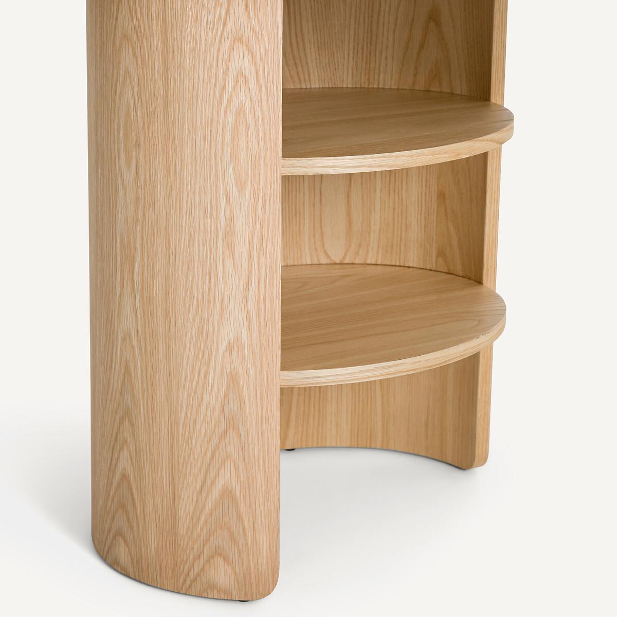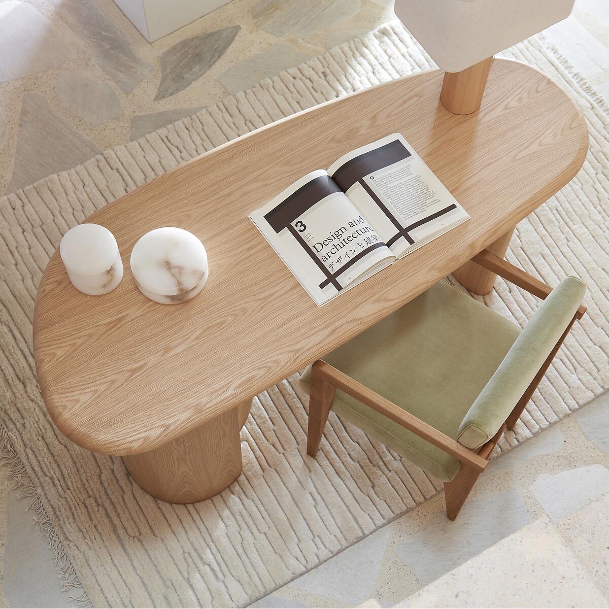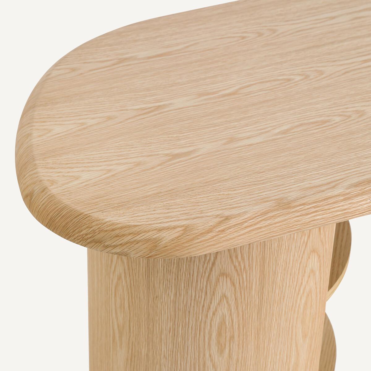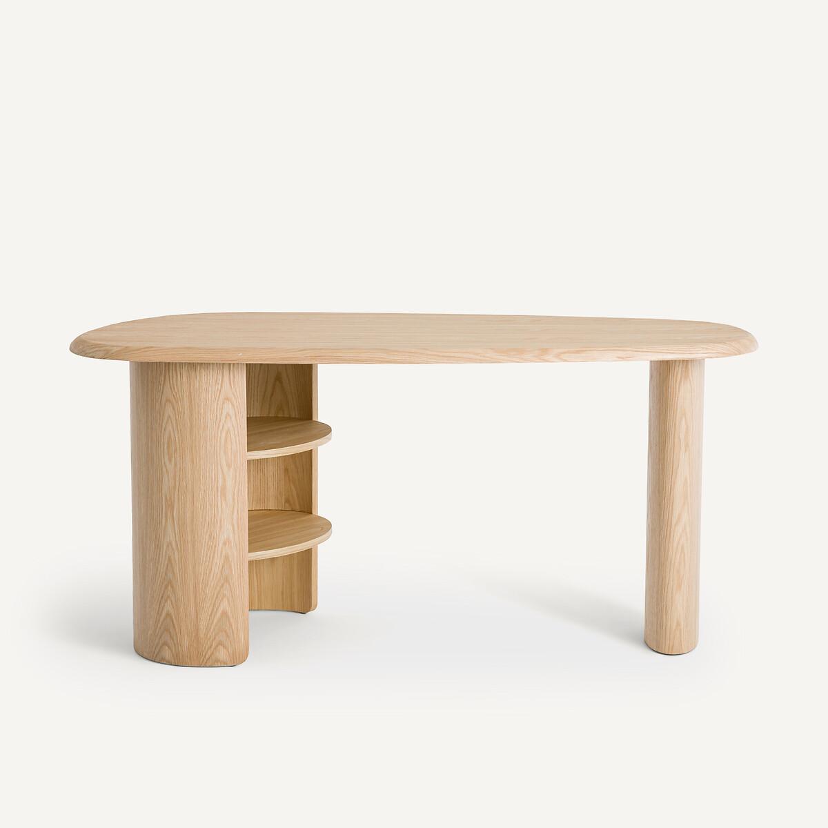 A soft and organic line, inspired by nature... Smith is the centerpiece to make your office a comfortable and reassuring workspace. This island unit is entirely covered with an oak veneer. The pebble-shaped top, with a softened profile, and the oval base conceal two shelves. A contemporary exclusive by AMPM.Product Details • Organically shaped top in oak veneered MDF, edges inspired by the profile of airplane wings. • Oak veneered MDF base. • 1 compartment made up of 2 oak-veneered MDF shelves. • Nitrocellulose varnish finish. Dimensions • Length: 160cm • Height: 75cm • Depth: 65cmDelivery:. Assembly required. Available for home delivery. Note! Please check that all access points are large enough to accommodate your delivery (doors, stairs, lifts). • WOOD FROM SUSTAINABLY MANAGED FORESTS. FSC® certified wood comes from forests that are environmentally, socially and economically well managed. Dimensions and weight of parcel • 3 parcels • L63 x D50.5 x H77.5cm, 18.66kg • L78 x D36 x H21cm, 15.8kg • L171 x D75 x H8.5cm, 21.2kg