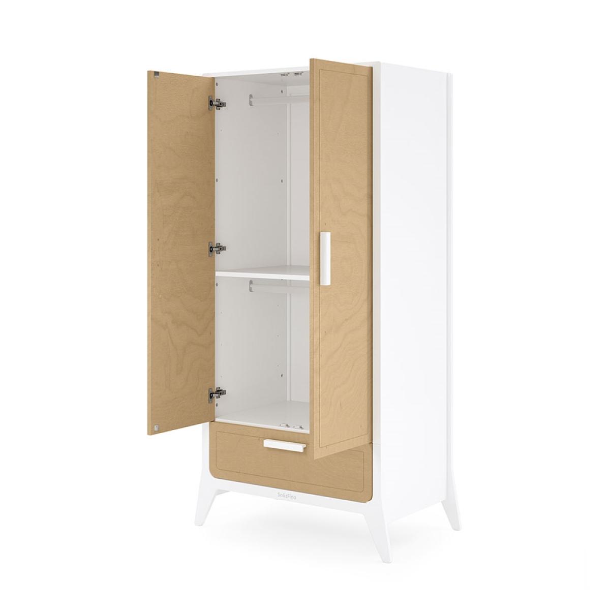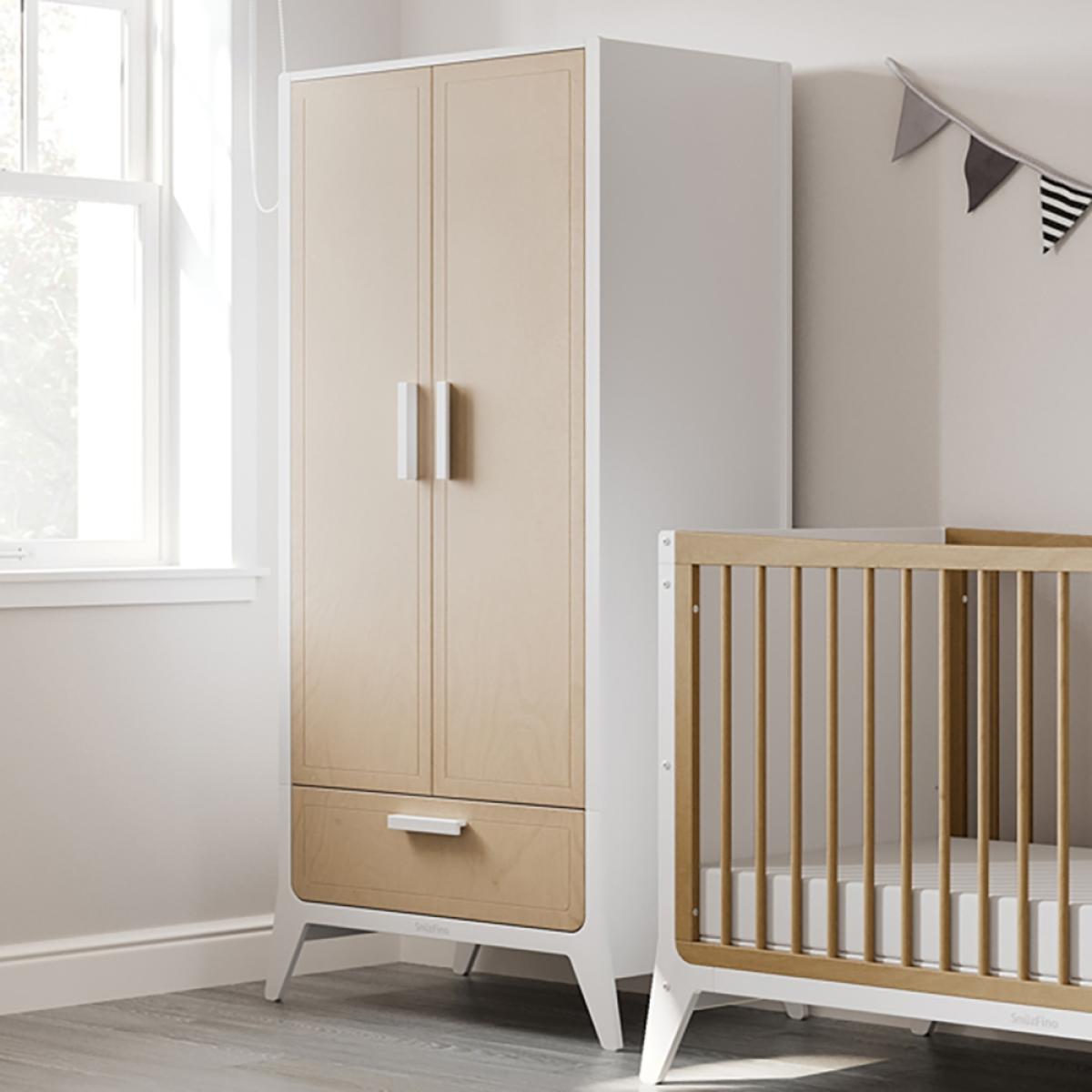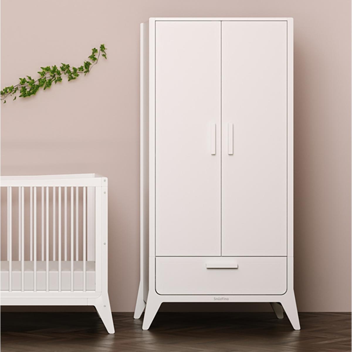 The SnuzFino Two Door Wardrobe can be adapted to suit your storage needs! Available in a choice of neutral colours, behind the wooden double wardrobe doors you'll find adjustable shelves and hanging rails. Simply adapt the interior configuration to house outfits, bedding, toys and more. The extra storage drawer below keeps other essentials separate. All doors and drawers are soft close too, so there's no fear of waking your tuckered out tots while you're tidying up. The Snuz Fino collection features contemporary handles and stylish details - pair the 2 door wardrobe with the coordinating cot bed and changing unit for a cohesive nursery setup!.