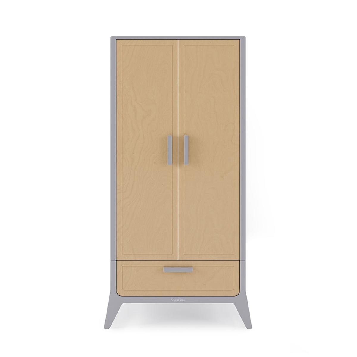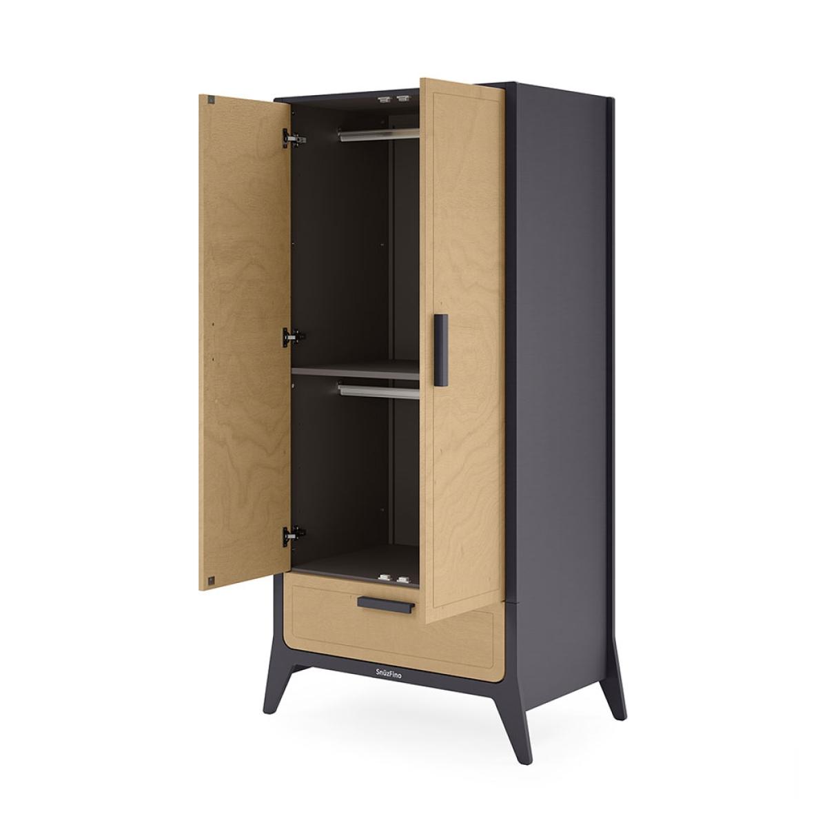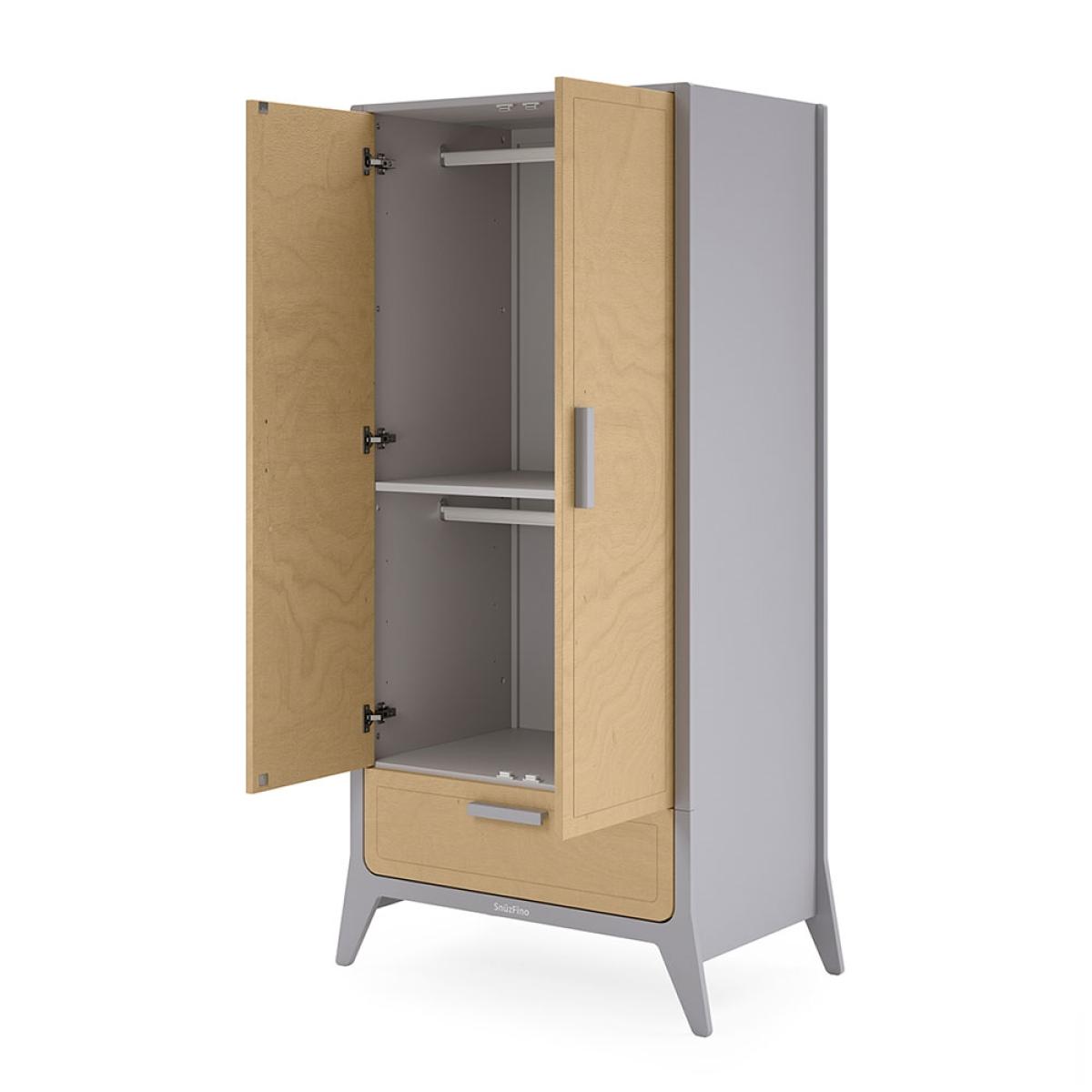 The SnuzFino Two Door Wardrobe can be adapted to suit your storage needs! Available in a choice of neutral colours, behind the wooden double wardrobe doors you'll find adjustable shelves and hanging rails. Simply adapt the interior configuration to house outfits, bedding, toys and more. The extra storage drawer below keeps other essentials separate. All doors and drawers are soft close too, so there's no fear of waking your tuckered out tots while you're tidying up. The Snuz Fino collection features contemporary handles and stylish details - pair the 2 door wardrobe with the coordinating cot bed and changing unit for a cohesive nursery setup!.