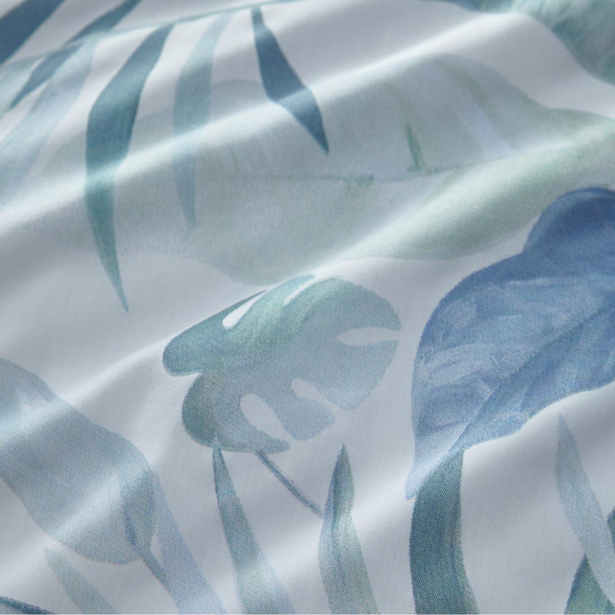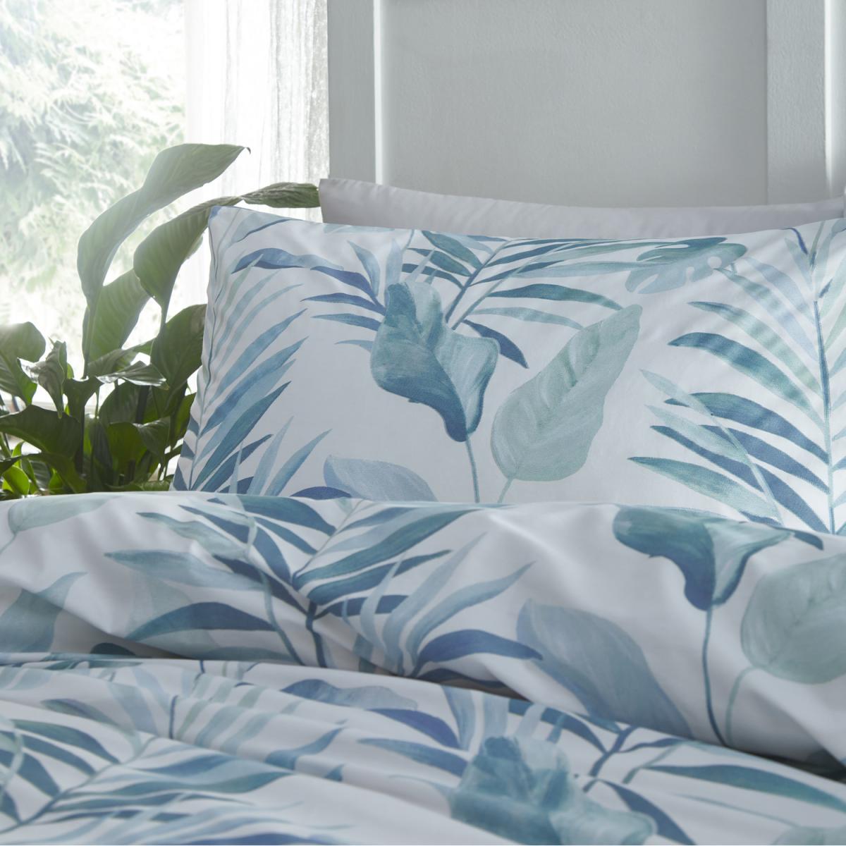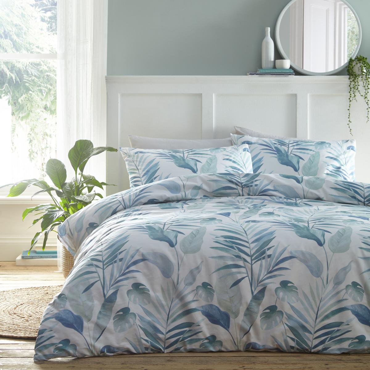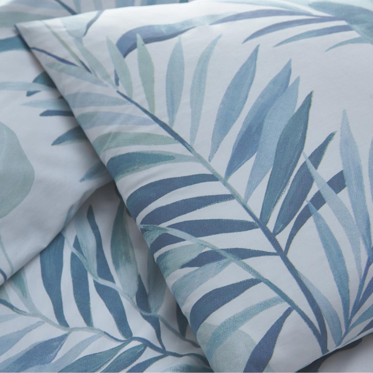 Transporting you to a lush, leafy tropical island paradise, Soraya Tropics adds both depth, adventure and sophistication to your bedroom. Gentle hand-painted watercolour palm trees and delicate leaf motifs in soft shades of blue feature on a crisp white background. Slumber away in tranquillity with your very own dream island tropical escape. This duvet cover set is fully reversible featuring the same beautiful design on the reverse. Made from 100 Cotton which has been responsibly sourced and is printed on a high quality 200 thread count, making it exceptionally soft to the touch.