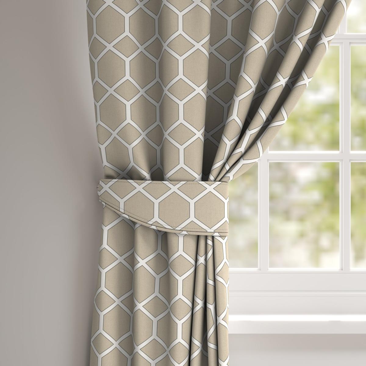 Transform your curtains with our Symmetry Pattern Made to Order Tiebacks. Crafted from fire-retardant fabric, these tiebacks combine safety and style effortlessly whilst giving you curtains space a neat and tidy finish. Sold individually, each tieback is available with your choice of a plain or piped edge, allowing you to tailor the look to your liking. The versatile geometric pattern adds a modern touch to any space, making these tiebacks suitable for both residential and commercial use. These Made to Order tiebacks are available in a range of colourways to choose from, so you might be spoilt for choice! Proudly made in the UK, they bring quality and sophistication to your window treatments. Available in both a plain and piped design, this tieback can be paired with our matching Made to Measure Curtain to give your home, office or commercial space a beautifully co-ordinated finish. Book an appointment with one of our expert consultants who will guide you through the process of creating your very own Made to Order Tieback. *If you are unsure on testing requirements for your chosen environment, check the with a qualified fire officer what testing is required & that this meets your needs.