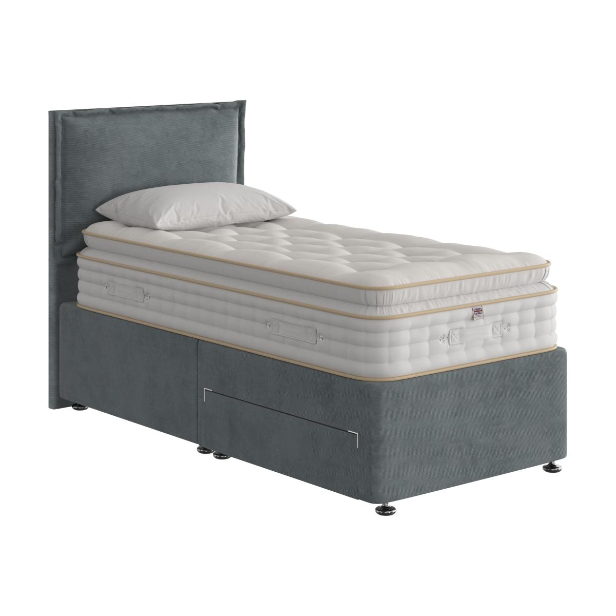 This stylish divan set promises real comfort thanks to the pillow top mattress with 3,000 pocket springs in king size. Customise it with your choice of fabric and storage drawer arrangement. Why you'll love it This stylish divan set comes complete with a sprung pillow top mattress. Handcrafted using traditional techniques. Mattress has 3,000 individually pocketed springs in king size. All-natural, chemical-free cotton and Hampshire wool fillings. The cushioning pillow top provides a luxurious sleeping surface. Ventilated border has 2 rows of stitching for edge support. Handles make rotating the mattress easier. Upholstered divan base comes in a huge range of sophisticated colours. With optional storage drawers in a choice of configurations. Made in the UK and exclusive to Furniture Village. This divan set is part of the Handmade Bed Company Boutique 3000 Pillow Top range. What you need to know Headboard shown is the Handmade Bed Company Standford headboard, available separately. Mattress type: Pocket spring. Depth: 32 cm. Firmness: Medium. Springs: 3,000 in king size. Pillow top:Yes. Fillings: Chemical-free cotton and Hampshire wool. Cover: Chemical-free polyester and viscose. Requires turning: No. Base type: Platform-top with optional storage drawers. Sizes: Single, double, king, super king. Mattress care:Air for 4 hours before using to remove any odour. Allow at least 4 hours for springs to settle and for mattress to attain its full size. Indentations caused by settlement of fillings or body weight are normal and are not considered defects. If used on a slatted bed frame, the space between slats must be no wider than 7.5 cm. Spaces wider than this may cause excess dipping of the mattress and invalidate the guarantee. Always use a mattress protector. Rotate regularly. Divan base care: Clean upholstery weekly using a soft brush or vacuum with the curtain attachment. Professional cleaning advised for oil- and grease-based stains. Some fabrics can show wear on areas of more use or in direct sunlight.
