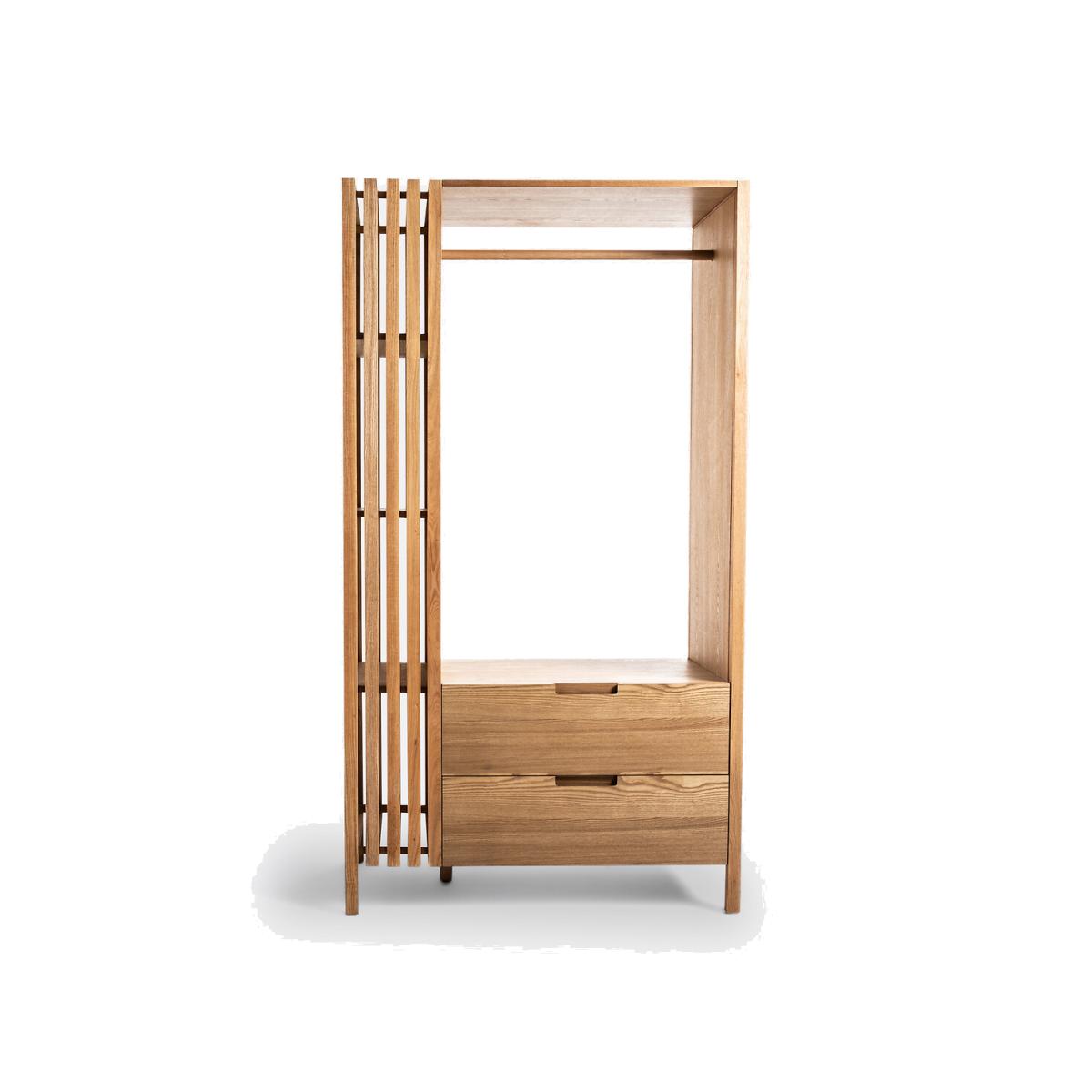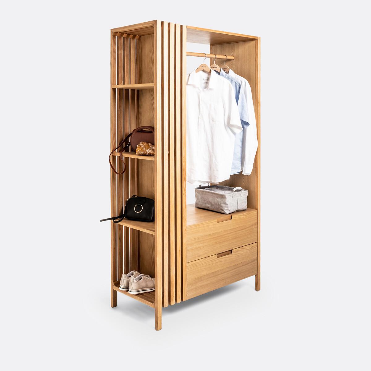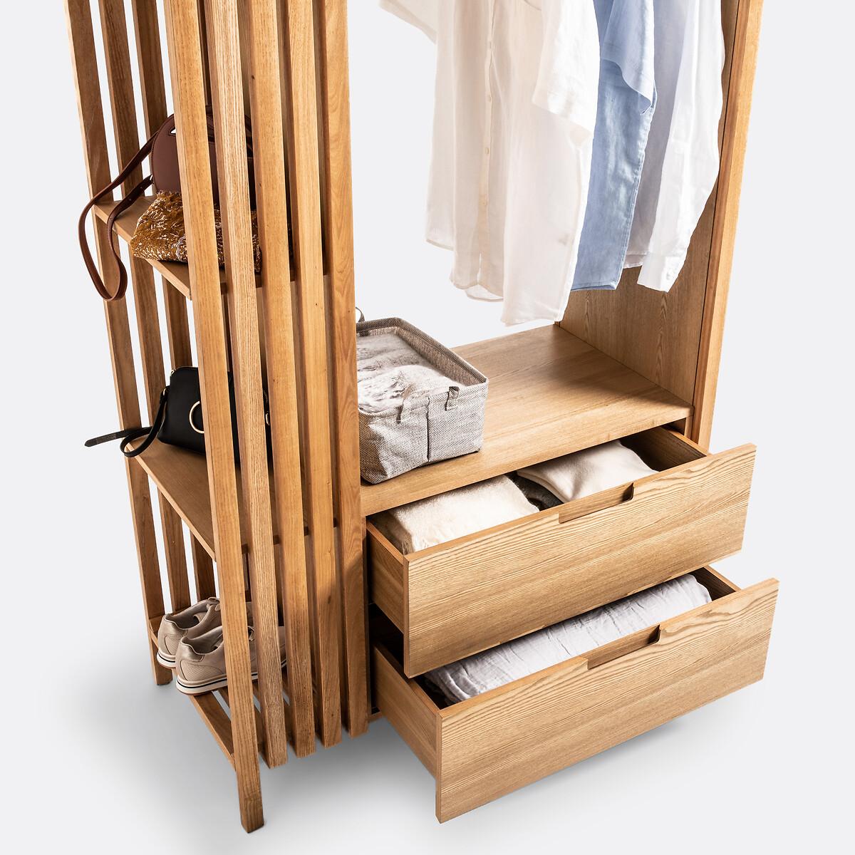 This well-thought-out wardrobe allows for perfectly organised storage. Its storage column open on the side will accommodate your accessories or decorative items. Product Details • Open wardrobe + 2 large drawers at the bottom. • 1 open storage column, with slats, with 4 fixed shelves, to be fixed to the right or left of the unit. • Pre-assembled unit and shelves in ash veneered MDF. • Side slats in ash veneered poplar: Dimensions 2.5 x 3.5cm. • Wardrobe bar in solid ash, diameter 3cm. • Base in solid poplar. • FSC® certified wood • Nitrocellulose varnish finish. • Soft closing system on the drawers (soft closing).Dimensions. Overall • Width: 104cm • Height: 190cm • Depth: 50cm. Usable space • Slatted column dimensions: L45 x D23.6 x H176.9cm • Height between shelves from the bottom: 43cm, 43cm, 43cm, 36cm • Size of 2 drawers: L74.6 x D50 x H23.8cm • Usable size of 2 drawers: L67 x D33.5 x H12.3cm • Dimensions of hanging unit:L75 x D50 x H112.7cm • Base height: 13cm • Weight: 67.9kgDelivery:. Delivered for self-assembly. It will be delivered to your door. Note! Please check that all access points are large enough to accommodate your delivery (doors, stairs, lifts). • WOOD FROM SUSTAINABLY MANAGED FORESTS. FSC® certified wood comes from forests that are environmentally, socially and economically well managed. Dimensions and weight of parcels2 parcels • L203 x D61.5 x H35.5cm. 40.35kg. • L84.5 x D58.5 x H27.5cm. 35.8kg.