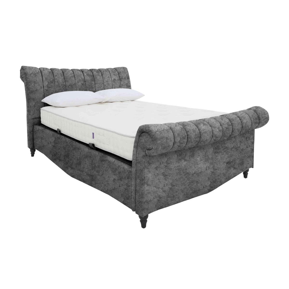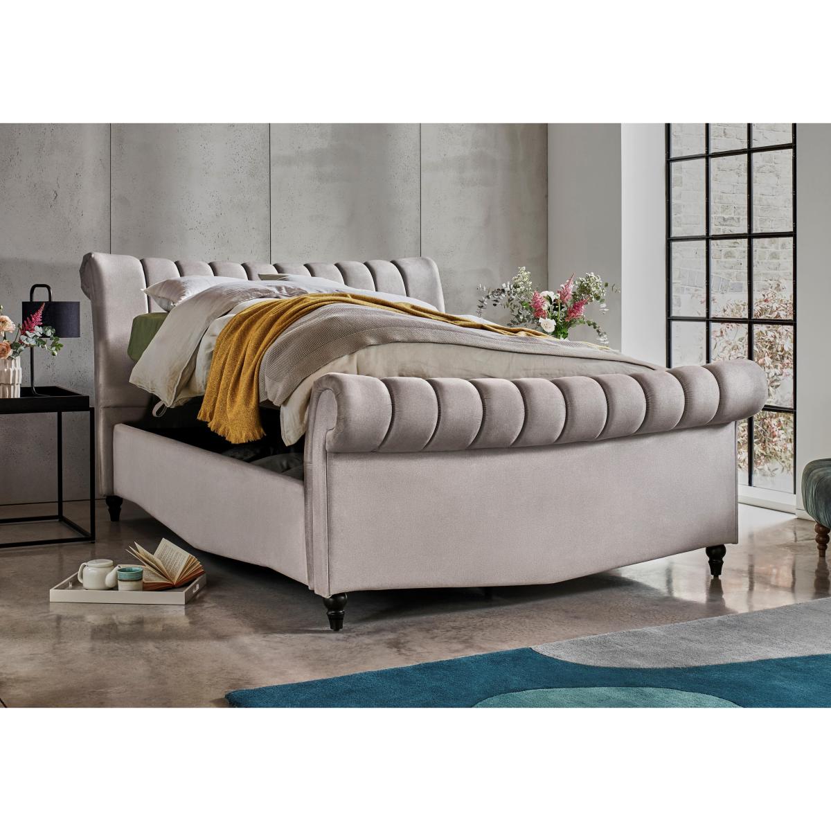 The Thiago ottoman bed frame brings style plus storage to any bedroom – especially if you’ve always had a yearning for a grand sleigh-style bed. Both the head and foot end are extravagantly curved and wonderfully cushioned, a feature enhanced by rows of deep fluting. And the underbed storage compartment is just as satisfying. It’s large and spacious with plenty of room for extra bedding and clothing. In a choice of elegant upholstery fabrics. A Furniture Village exclusive. With its gorgeous curves and beautiful fluting, the sleigh-style Thiago ottoman bed frame is the very essence of elegance. The hidden storage space makes it a very practical choice too. Why you'll love it Beautiful sleigh-style ottoman bed frame at a great-value price. Elegantly curved and cushioned head and foot ends with decorative fluting. Large easy-to-access underbed storage compartment. Upholstered in a choice of fabrics. In double, king and super king sizes. The Thiago ottoman bed frame is a Furniture Village exclusive. What you need to know Mattress sold separately. Please keep hands clear of the mechanism when opening and closing. Clean regularly using a soft brush or vacuum with the curtain attachment. Deal with any spills promptly. Professional cleaning advised for oil- and grease-based stains. Some fabrics can show wear on areas of more use or in direct sunlight. Flattening and shading of heavy wear areas on pile fabrics like velvet is unavoidable. Be sure to brush pile fabrics only in the direction of the pile.