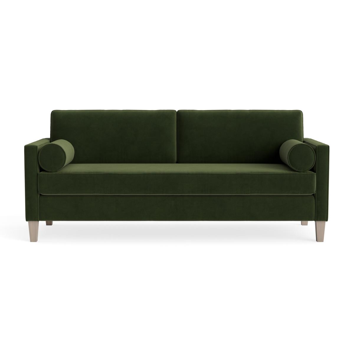 Bolster style cushions add a classical elegance to the architectural lines of our Toulon range of bespoke living room furniture. The sofa has a sculptural profile led by a mid-century aesthetic which is revealed in the slender square lines and tapered wooden legs. Round bolster cushions set inside each arm are a stylish refinement. Elegant piping provides a sophisticated finish. Promising the same handcrafted premium quality of all our made to order ranges, the Toulon sofa is a statement piece that can hold its own in formal settings or add a touch of gravity to laid back interiors. The Toulon range includes two seater and three seater sofas, a loveseat and an ottoman. Our Toulon collection can be upholstered in a choice of 34 distinctive shades and six fabrics to suit your style. Read our Upholstery FAQs View our full Upholstery Terms and Conditions