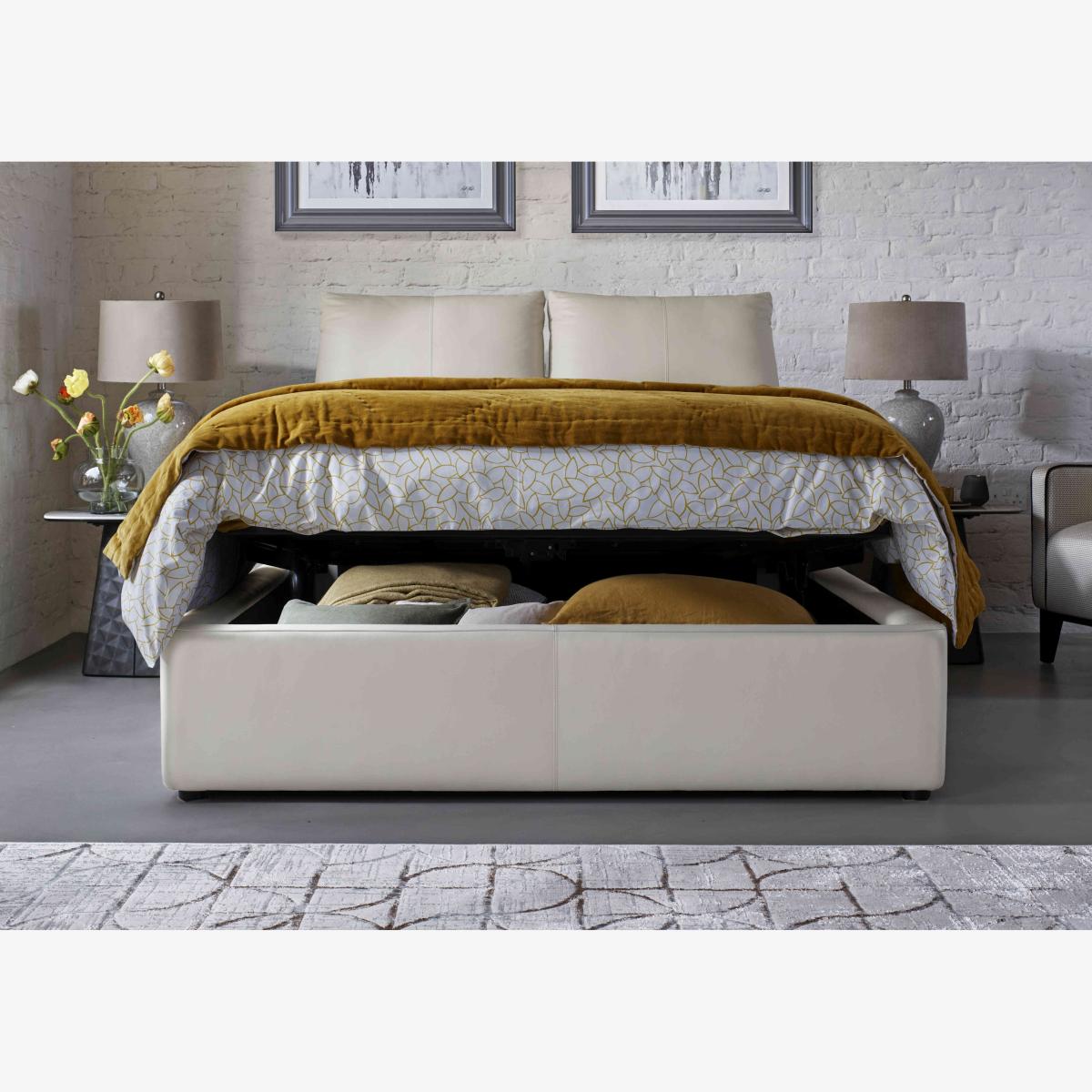 Give your bedroom a contemporary style makeover and treat yourself to spacious extra bedroom storage. Showcasing a fabulous headboard design – double pillow-style headrests that are independently adjustable for perfect-position comfort – the sturdy ottoman bed frames in the Tyrell collection feature maximum-capacity underbed storage spaces. Choose either manual or electric ottoman mechanisms and beautifully tailored upholstery in 100% leather or fabric. The range also includes stylish blanket boxes which double as bedroom seating as well as providing handy extra storage. The Tyrell range is exclusively available at Furniture Village. This luxurious leather electric ottoman bed frame combines fabulous contemporary style – that pillow-style headboard – with perfect-position adjustable headrests. Only at Furniture Village. Upgrade your bedroom style – and your bedroom storage. Contemporary ottoman bed frame has perfect-position comfort built in. Luxurious pillow-style headrest cushions can be moved up and down. Electric-powered ottoman base is effortlessly easy to open and close. Enjoy maximum capacity storage – the underbed compartment is as large as the bed frame. Perfect for lightweight items like duvets, pillows and clothing. Simple touch-button controls with safety locking feature and a USB port. Well-crafted and sturdy. A slatted wood base offers great mattress support. Beautiful 100% leather upholstery in an incredibly wide choice of on-trend colours. In king and super king bed sizes. A Furniture Village exclusive. This leather electric ottoman bed frame is part of our Tyrell range. What you need to know Mattress sold separately. Maximum mattress weight is 80 kg for both king and super king bed frames. Please keep hands clear of the mechanism when opening and closing the ottoman. Do not sit on the foot end of this ottoman bed frame when opening. Leather has unique marks and characteristics with variation in colour and texture. Leather softens with use. Deal with any spills promptly. Professional cleaning advised for oil- and grease-based stains.